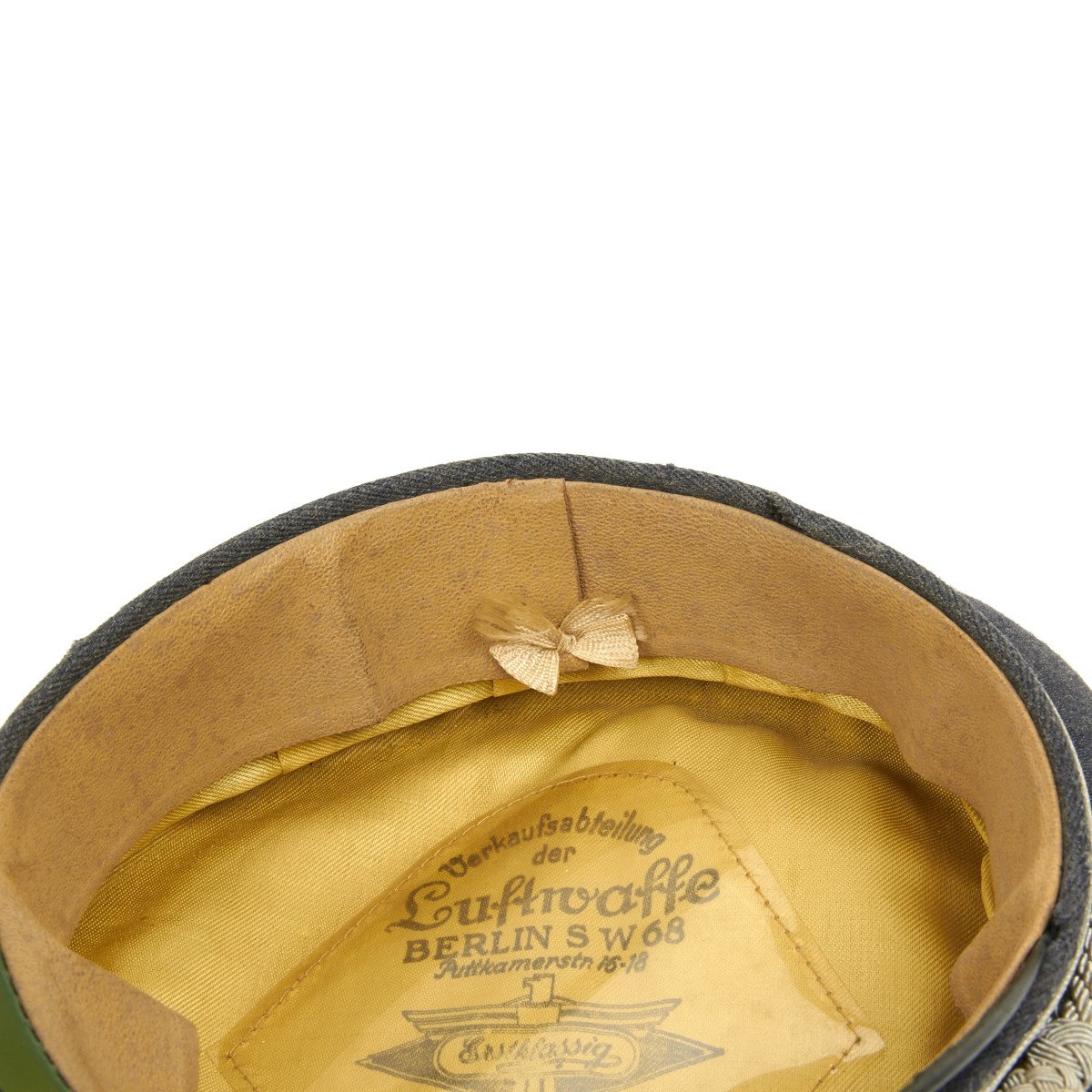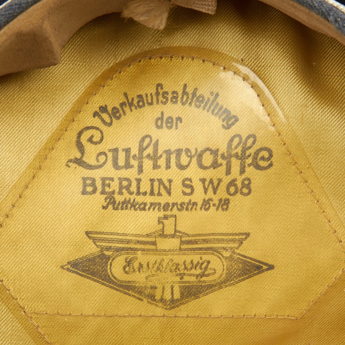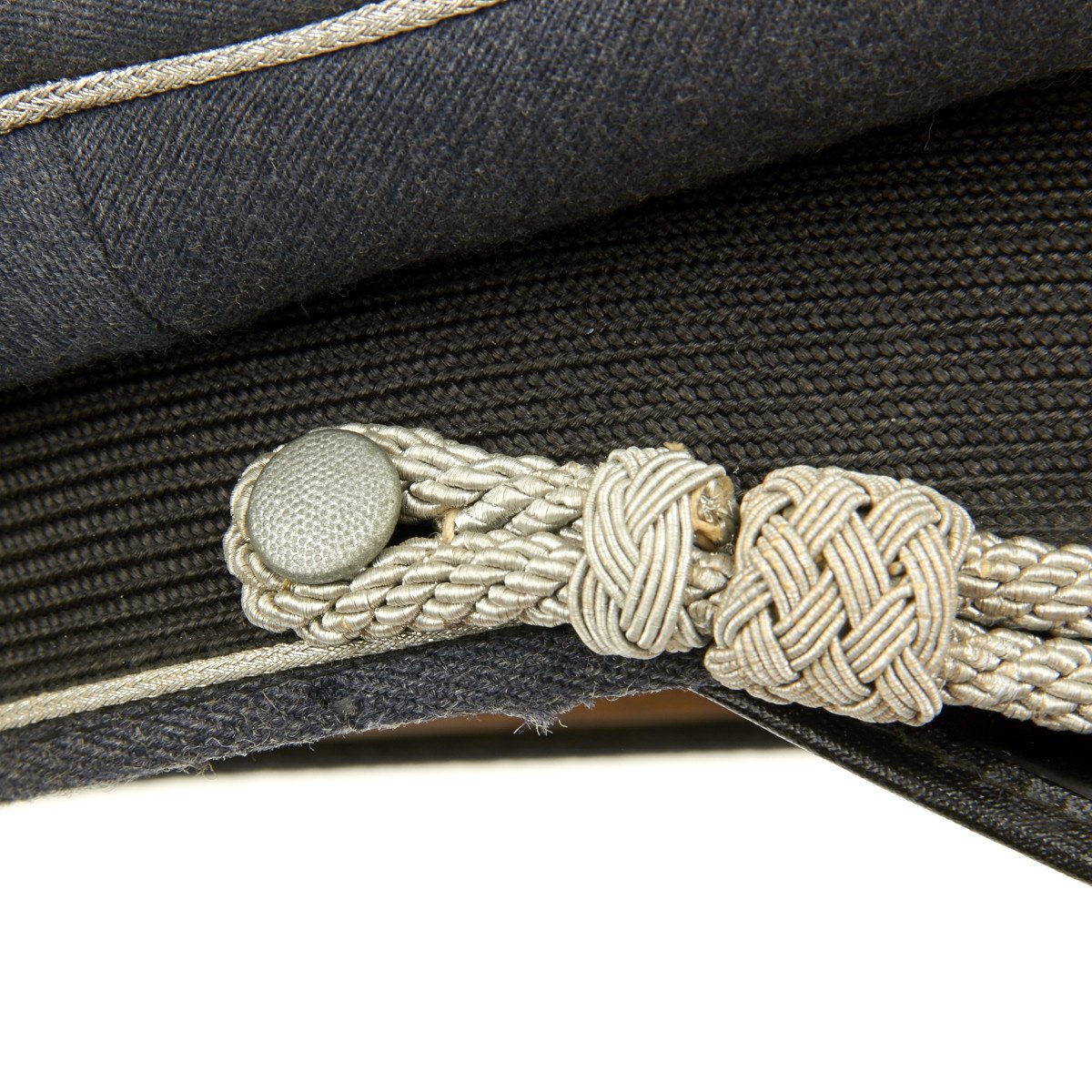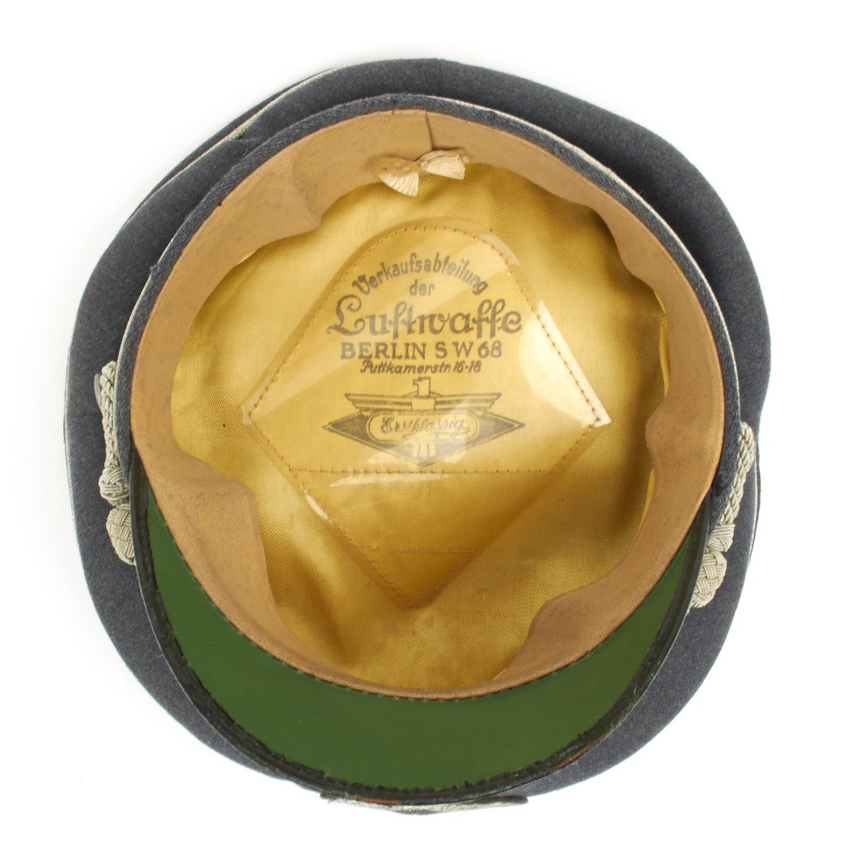 Original Item: Only One Available. This is a very good condition mid-war Luftwaffe Officer's Schirmmütze Visor Cap. This is a very high quality manufactured visor. Fabricated in Luftwaffe blue gray Fliegerblau (Flier's Blue) wool, with wide black ribbed rayon cap band, plus three rows of fine silver bullion piping around the circumference. Fronted by a Luftwaffe insignia pair that includes a silver bullion national eagle on a wool backer above a high relief silver bullion oak leaf wreath with stylized wings and cockade.