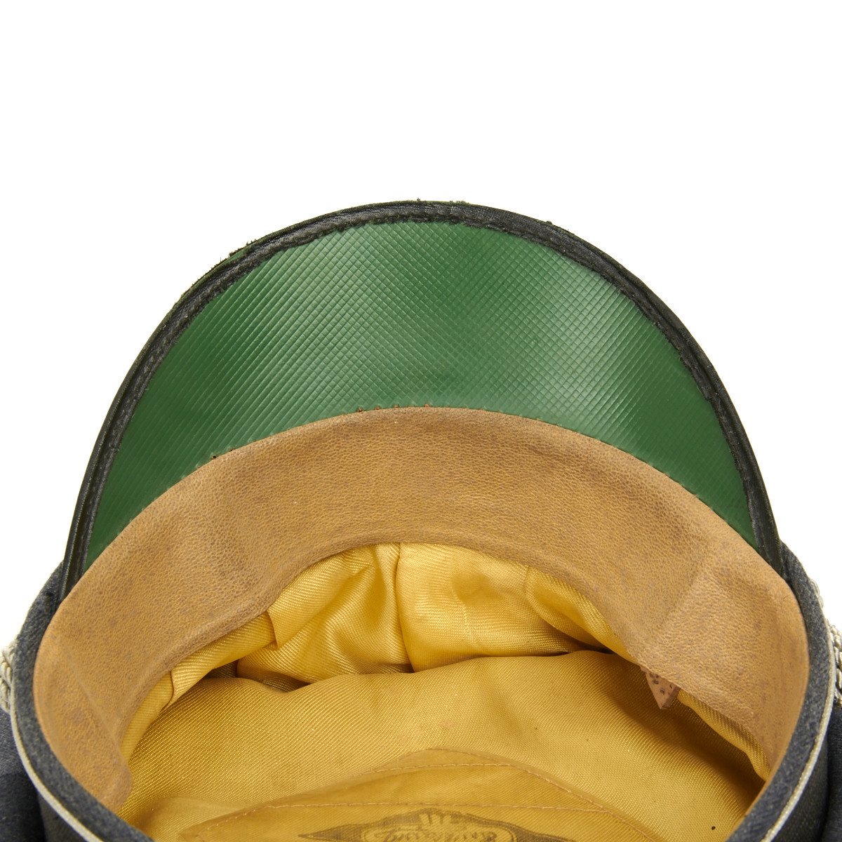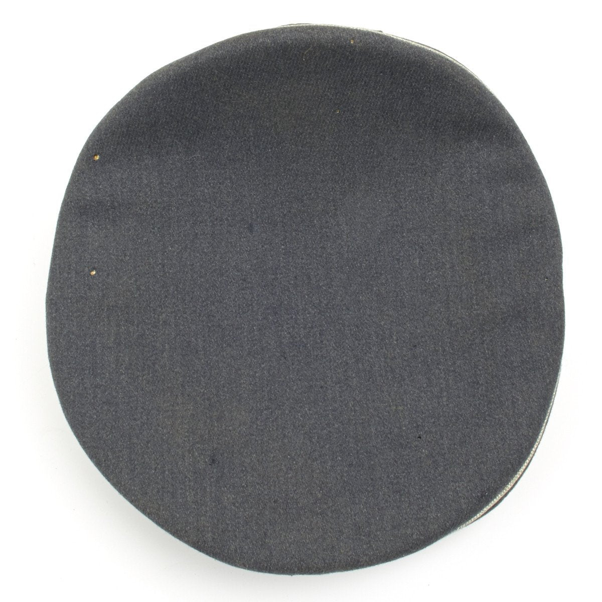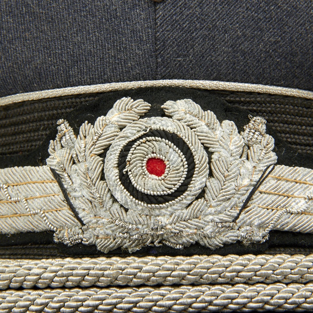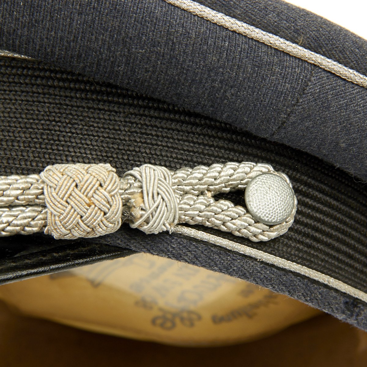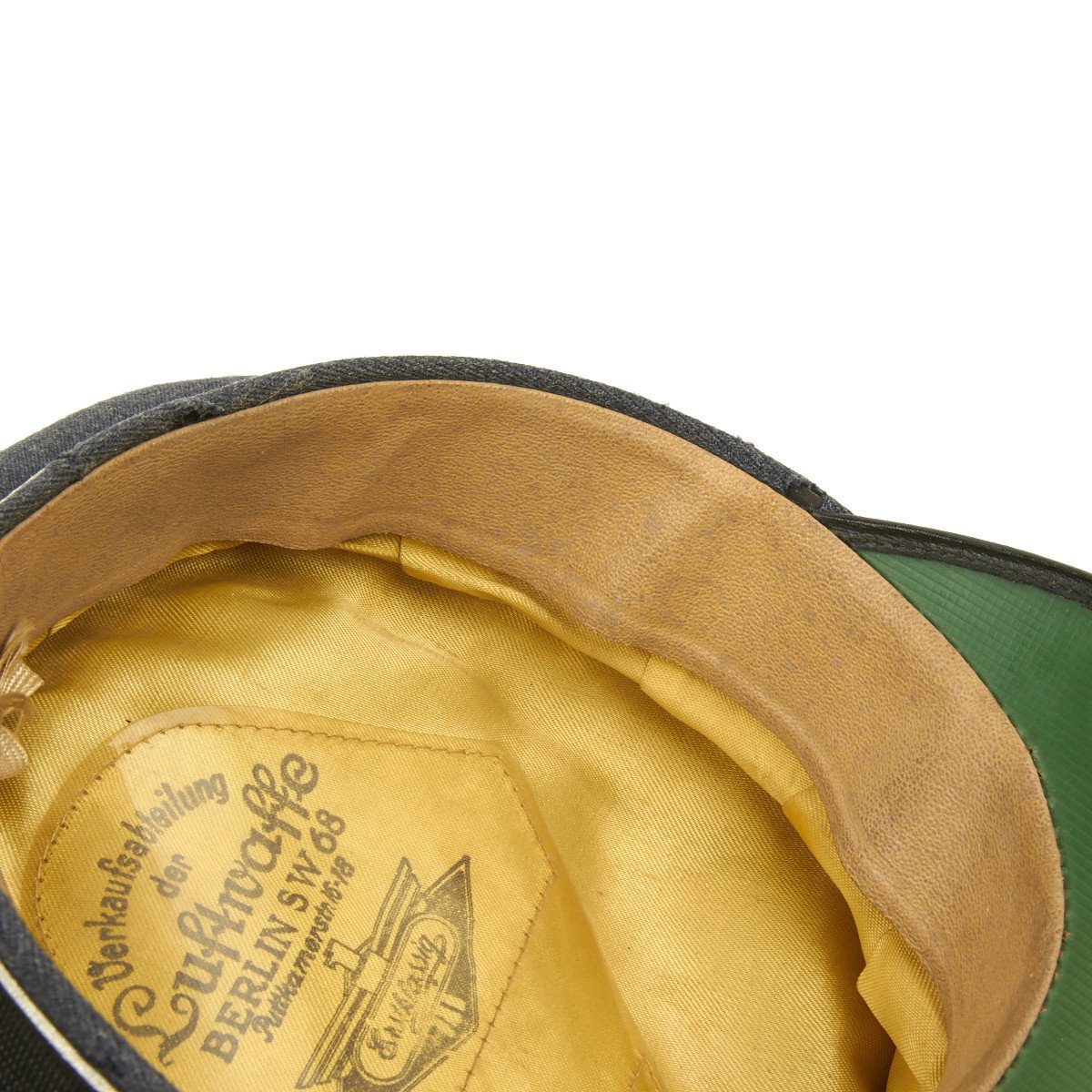 Original Item: Only One Available. This is a very good condition mid-war Luftwaffe Officer's Schirmmütze Visor Cap. This is a very high quality manufactured visor. Fabricated in Luftwaffe blue gray Fliegerblau (Flier's Blue) wool, with wide black ribbed rayon cap band, plus three rows of fine silver bullion piping around the circumference. Fronted by a Luftwaffe insignia pair that includes a silver bullion national eagle on a wool backer above a high relief silver bullion oak leaf wreath with stylized wings and cockade.