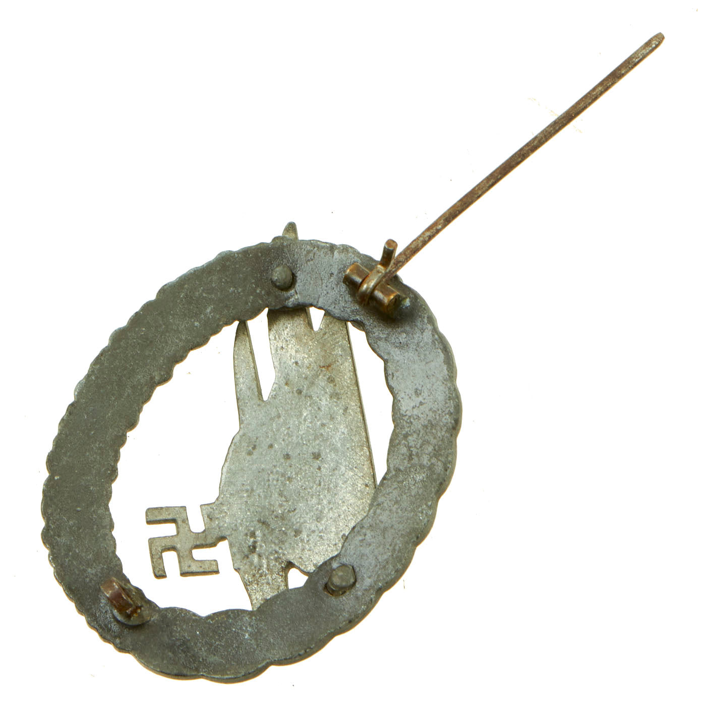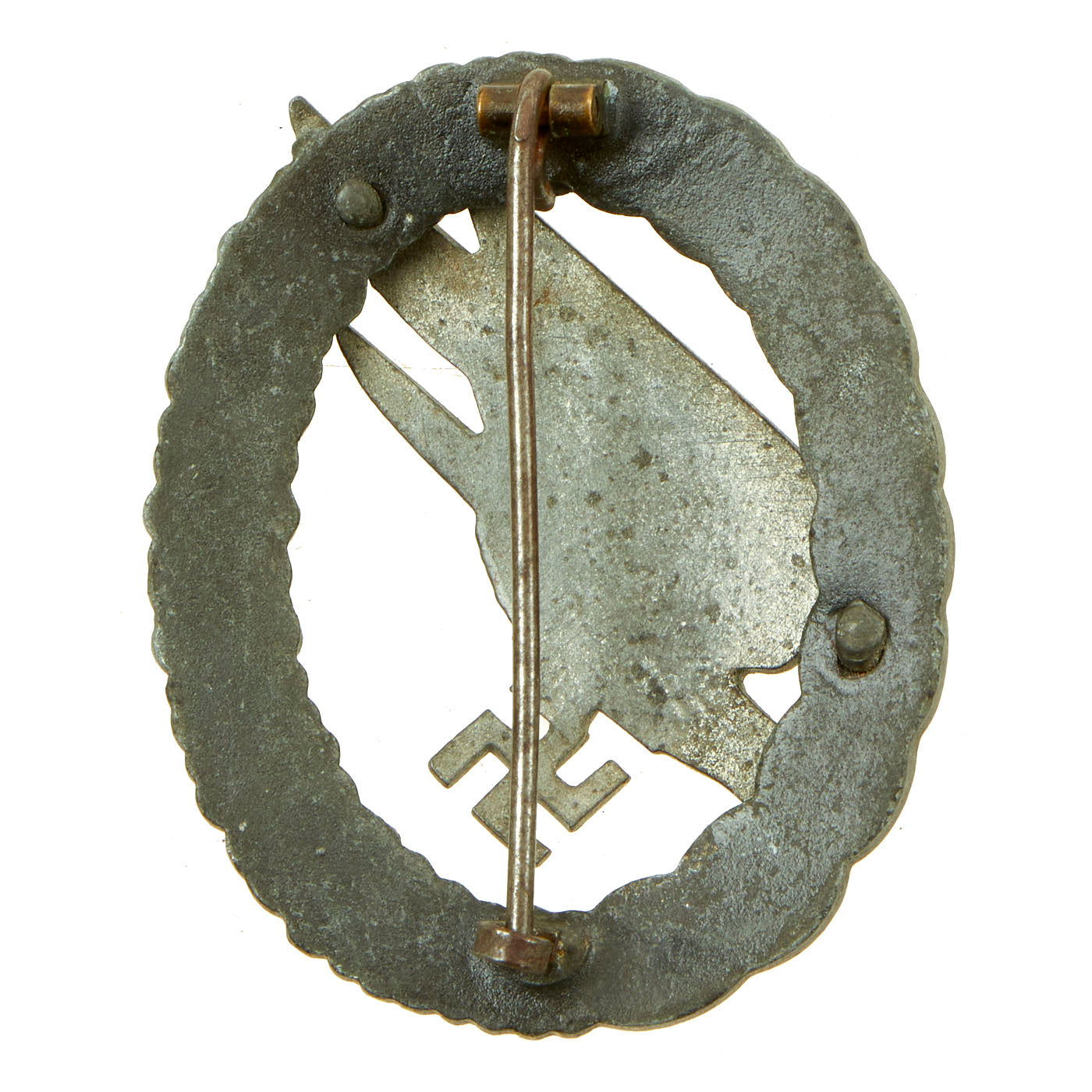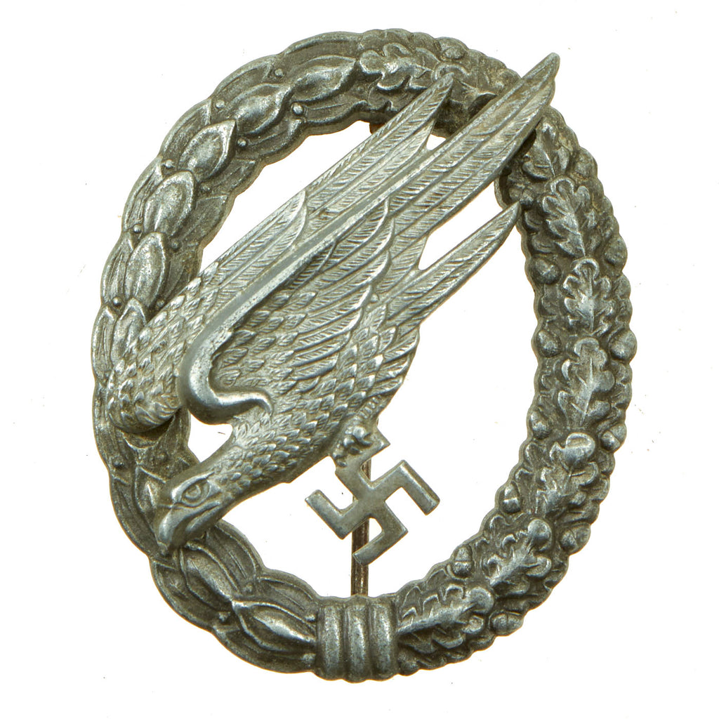 Original Item: Only One Available. This is a fine quality manufactured example of a Paratrooper Fallschrimjäger badge, with a lovely patinated finish overall. We do not know if the silvering has simply tarnished, or worn off. The basic design is a half Oak Leaf and half Laurel Leaf wreath, with a "Diving Eagle" clutching a Swas (hook cross) in the middle. The eagle is attached to the wreath with two pins, which are peened over to keep the eagle in place. It features a needle style vertical pinback with a narrow barrel hinge, with an intact bent flat metal pin catch. The wreath looks to be zinc alloy, while the central eagle may be tombak or possibly aluminum.