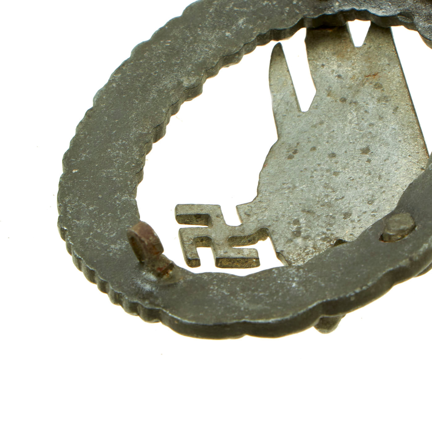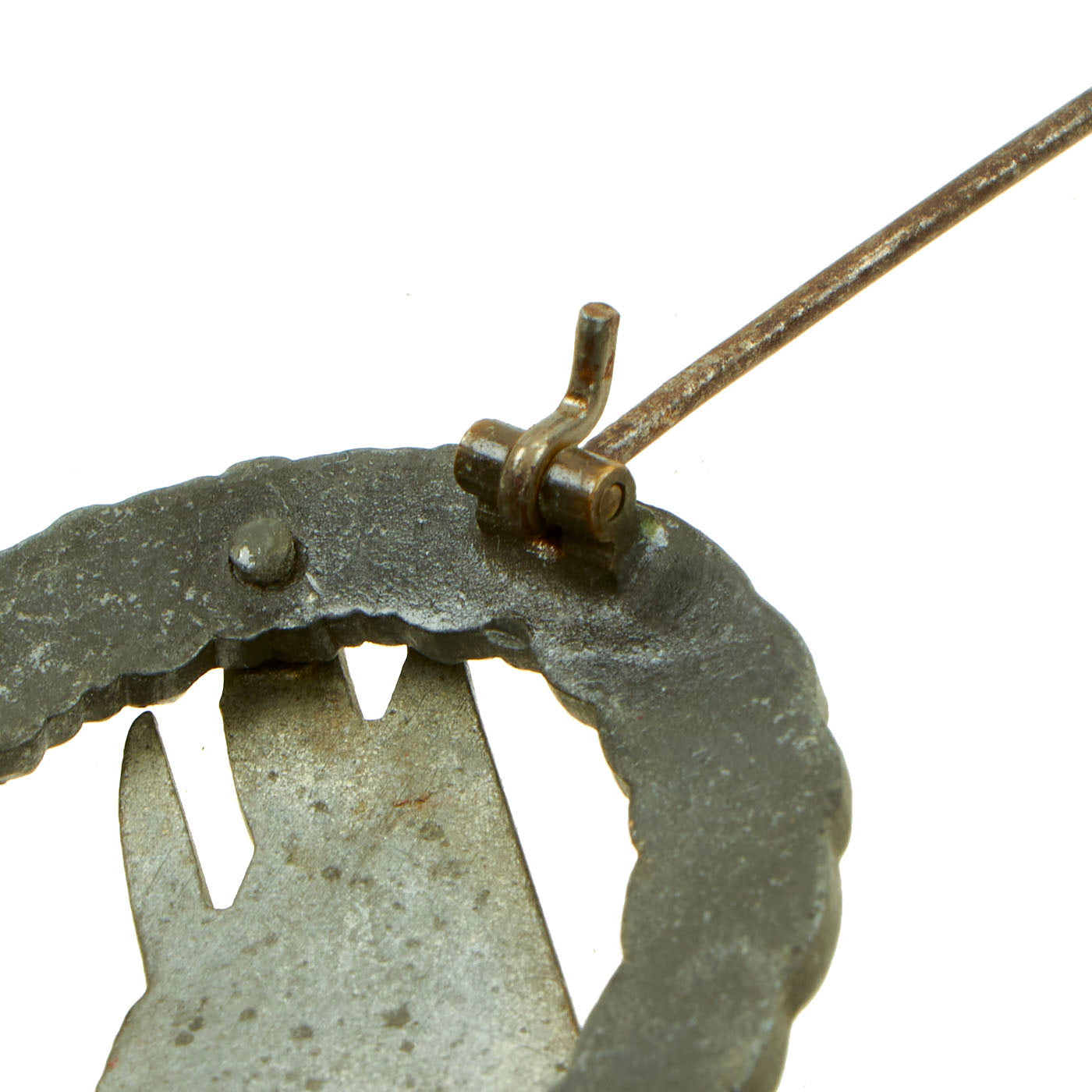 There is no maker marking on this example, but that is not uncommon, and many of the major makers made marked as well as unmarked examples as the war progressed. The style used to attach the eagle to the wreath, as well as the hinge and pin catch style, suggest the makers C.E. Juncker or FLL (Friedrich Linden). More in depth research may be able to conclusively pinpoint the maker, however with each maker making various different styles of eagles and wreathes during the war, identification can be difficult.
