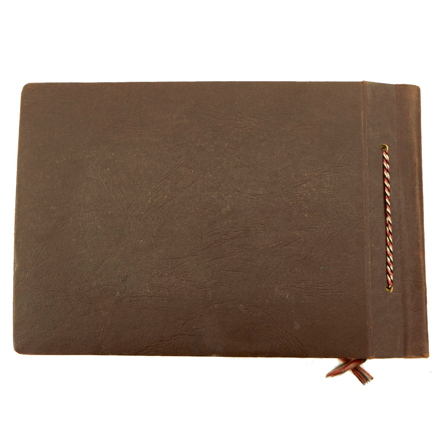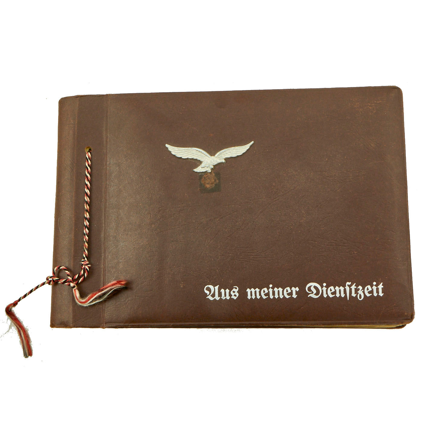 The front cover features a silver embossed Aus meiner Dienstzeit (From My Service) at the bottom, and the top has a Luftwaffe Eagle, sanitized post war by removing the swas (hook cross). The album measures approximately 10 3/4" x 7", and features 22 pages, secured into the cover with a red / white /black tricolor tie string. A total of over 180 photographs fill this album, all held in place with period corner tabs.