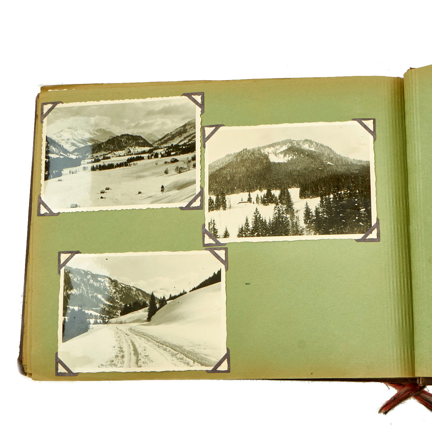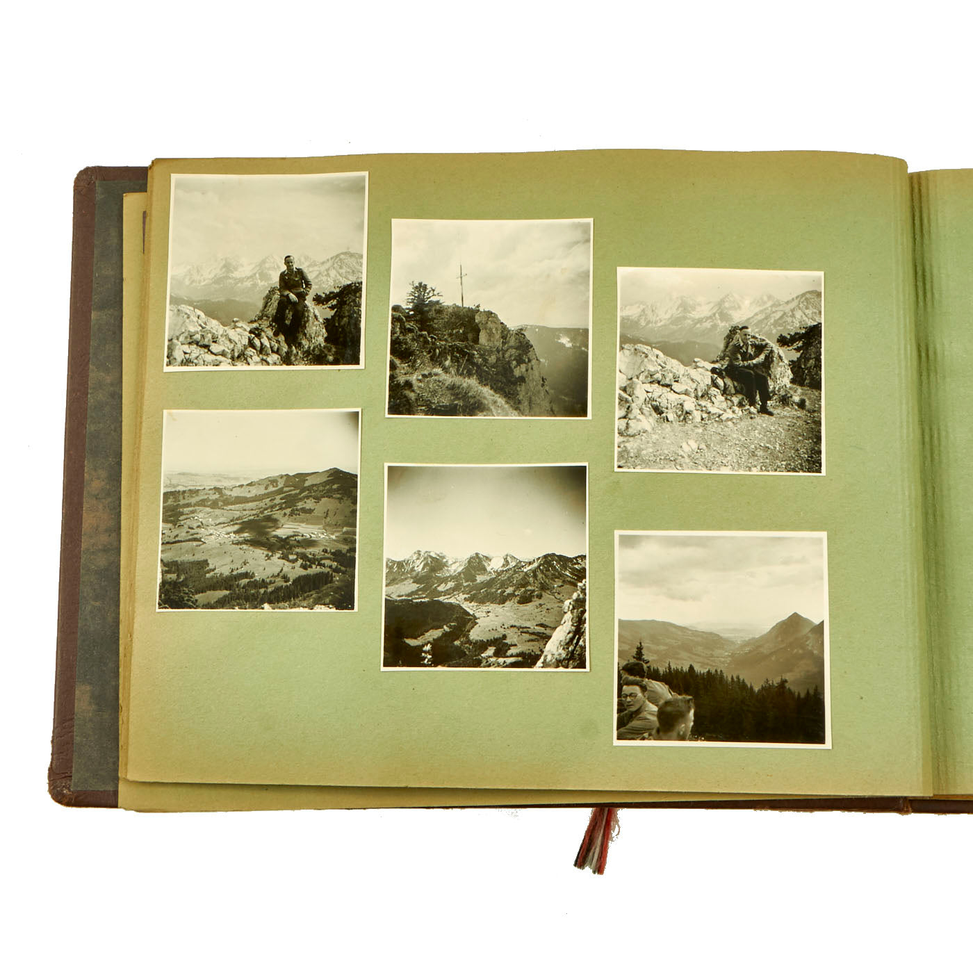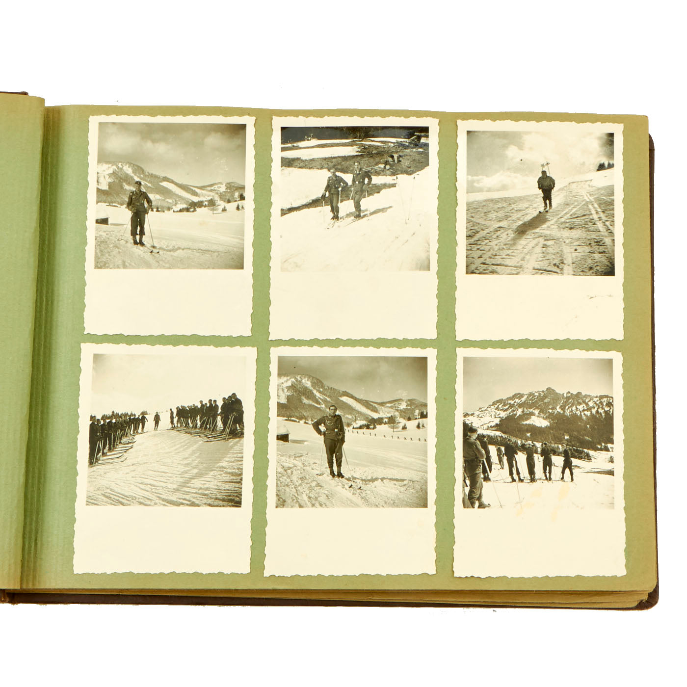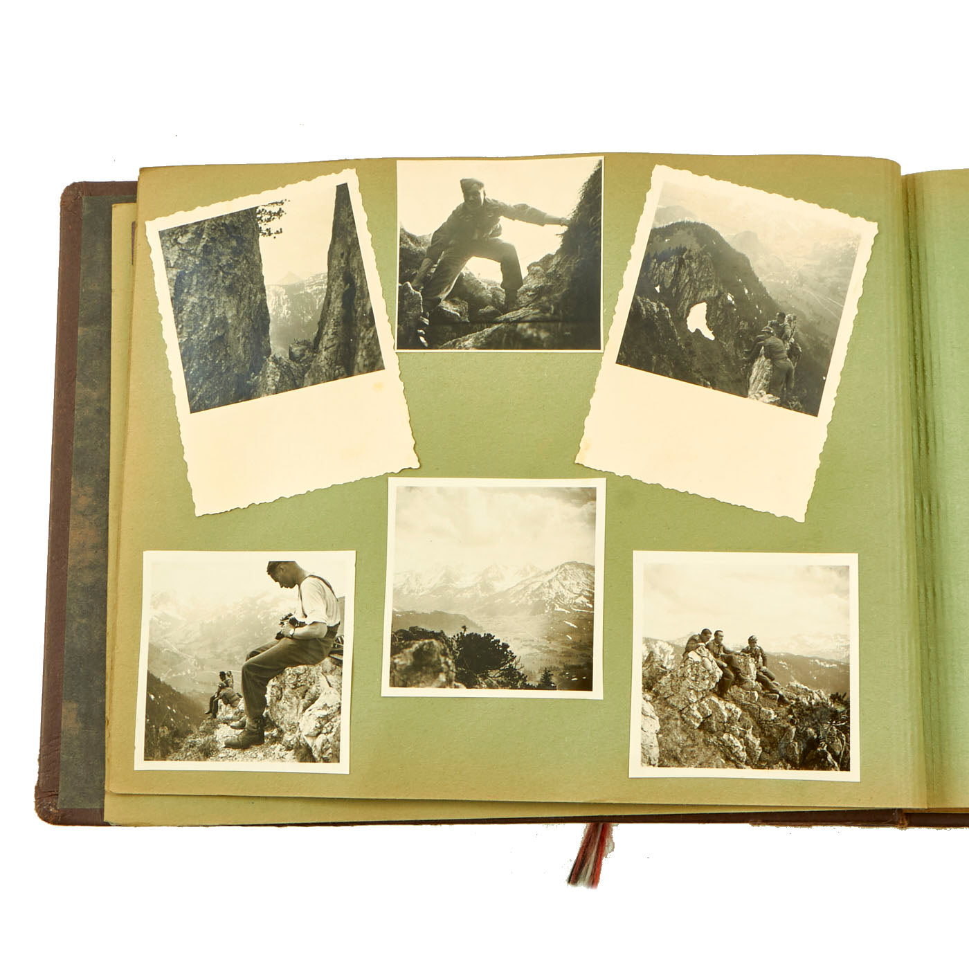 Original Item: One-Of-A-Kind. This is a wonderful personal photo album with some professional shots as well as personal snapshots, which look to have come from the mountainous areas of Germany. They show both military and personnel and civilians during both the winter and warmer months. The soldiers shown definitely have the Luftwaffe Eagle on the right breast of their uniforms, but are present on skiis in the Alpine regions. There is also a picture of mountain climbing, with one soldier having a clear Edelweiß badge on his cap, for a Gebirgsjäger Mountain trooper.