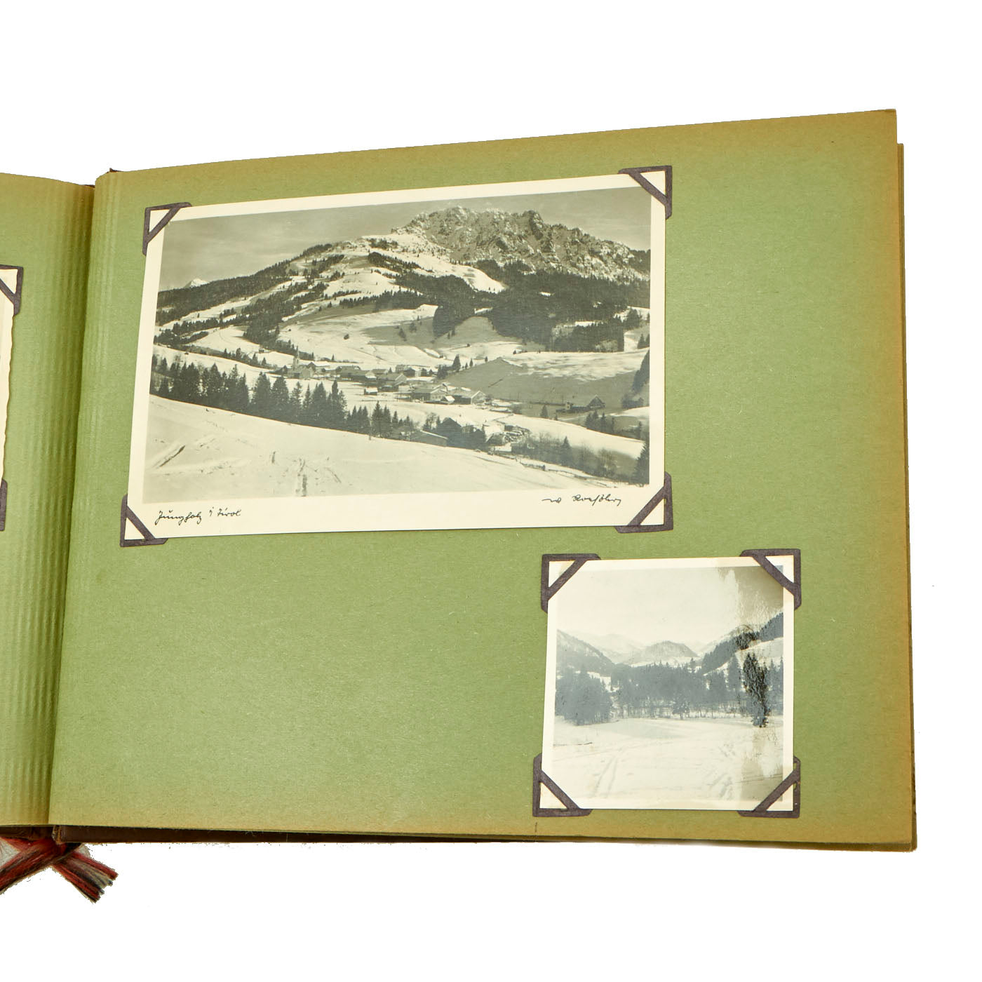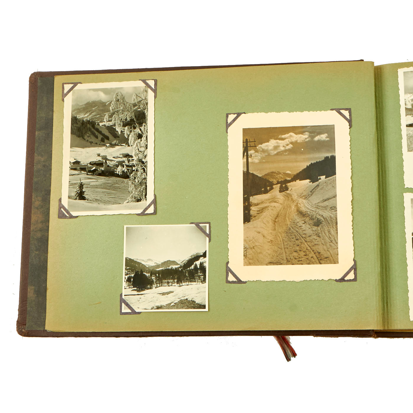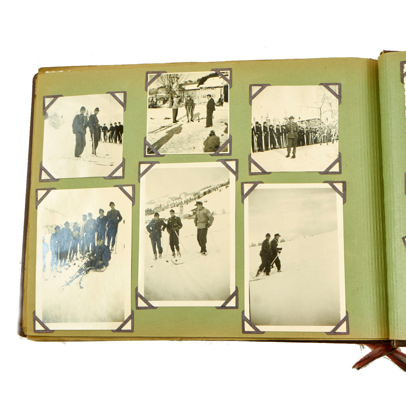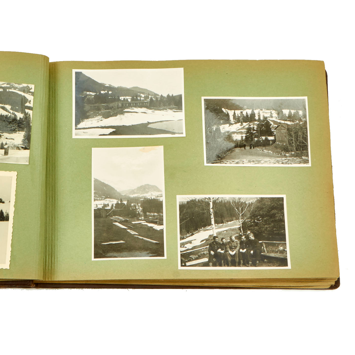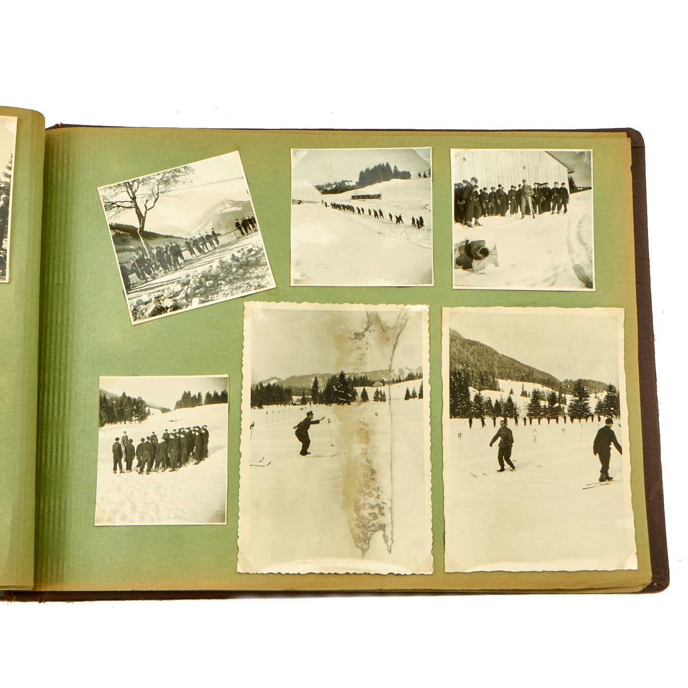 Original Item: One-Of-A-Kind. This is a wonderful personal photo album with some professional shots as well as personal snapshots, which look to have come from the mountainous areas of Germany. They show both military and personnel and civilians during both the winter and warmer months. The soldiers shown definitely have the Luftwaffe Eagle on the right breast of their uniforms, but are present on skiis in the Alpine regions. There is also a picture of mountain climbing, with one soldier having a clear Edelweiß badge on his cap, for a Gebirgsjäger Mountain trooper.