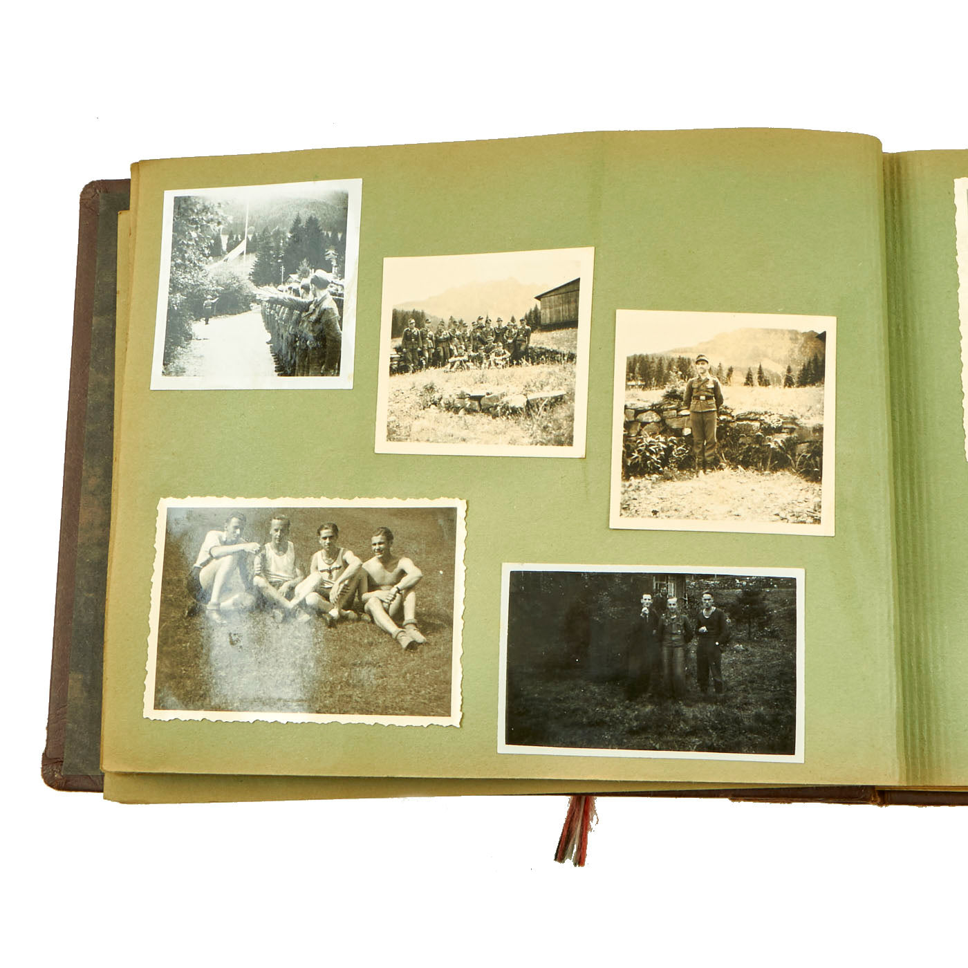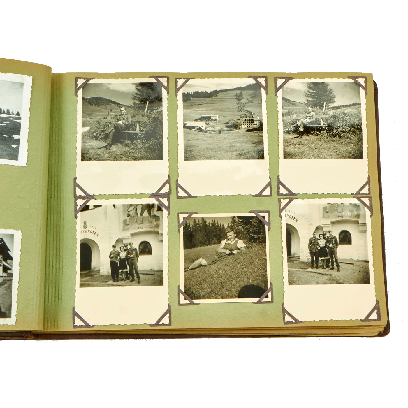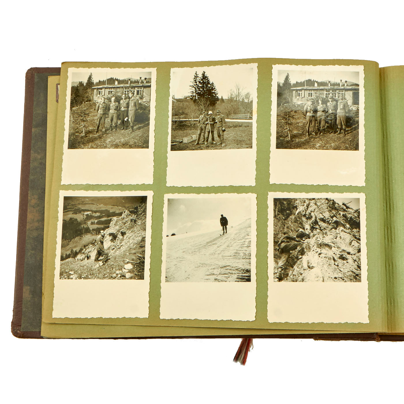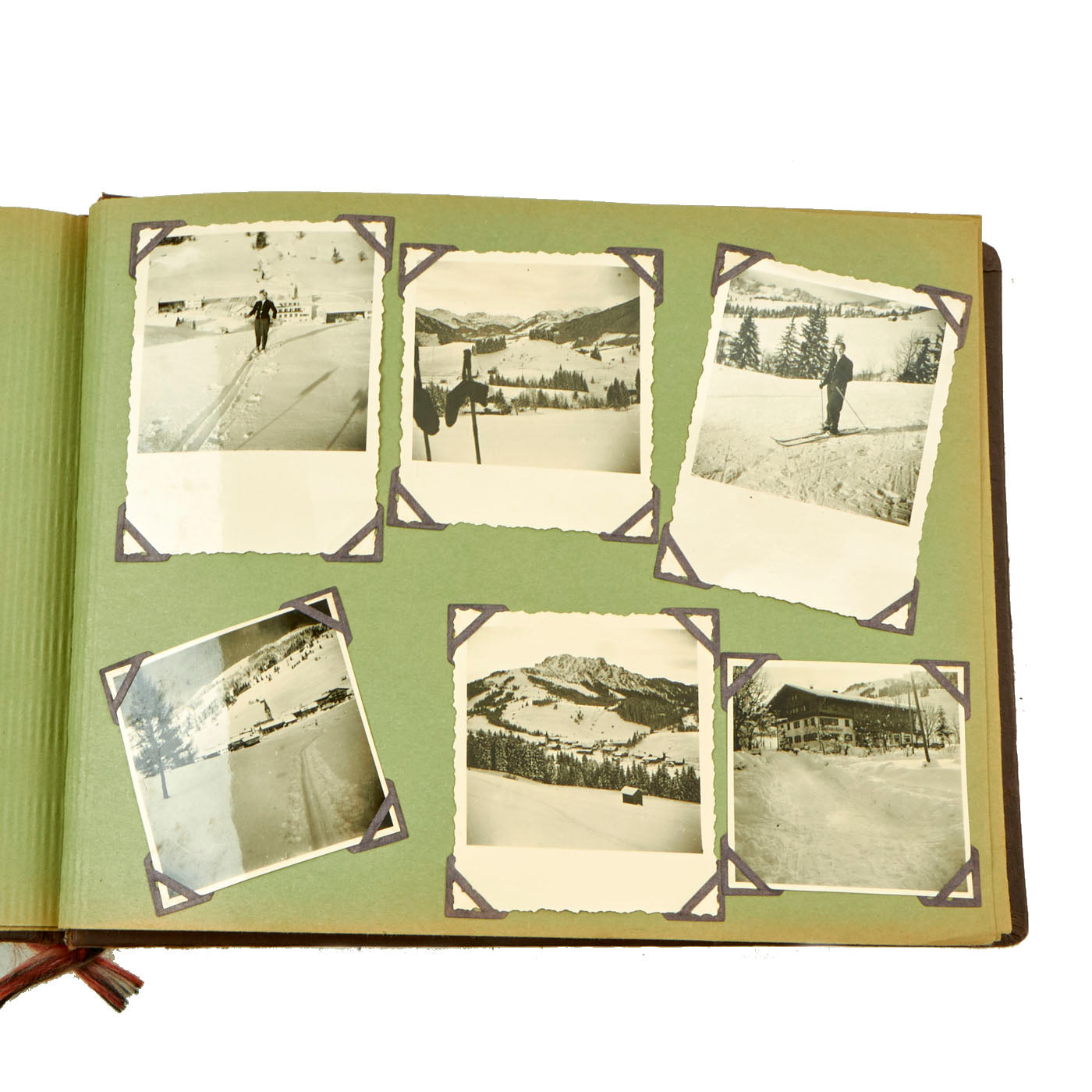 Original Item: One-Of-A-Kind. This is a wonderful personal photo album with some professional shots as well as personal snapshots, which look to have come from the mountainous areas of Germany. They show both military and personnel and civilians during both the winter and warmer months. The soldiers shown definitely have the Luftwaffe Eagle on the right breast of their uniforms, but are present on skiis in the Alpine regions. There is also a picture of mountain climbing, with one soldier having a clear Edelweiß badge on his cap, for a Gebirgsjäger Mountain trooper.
