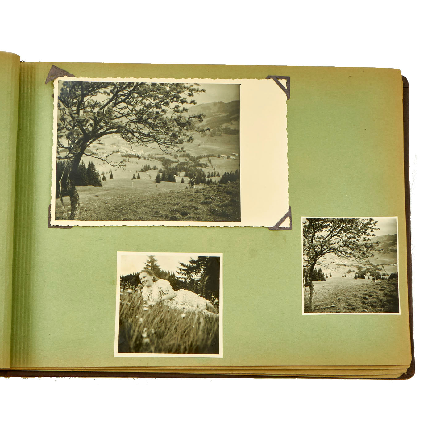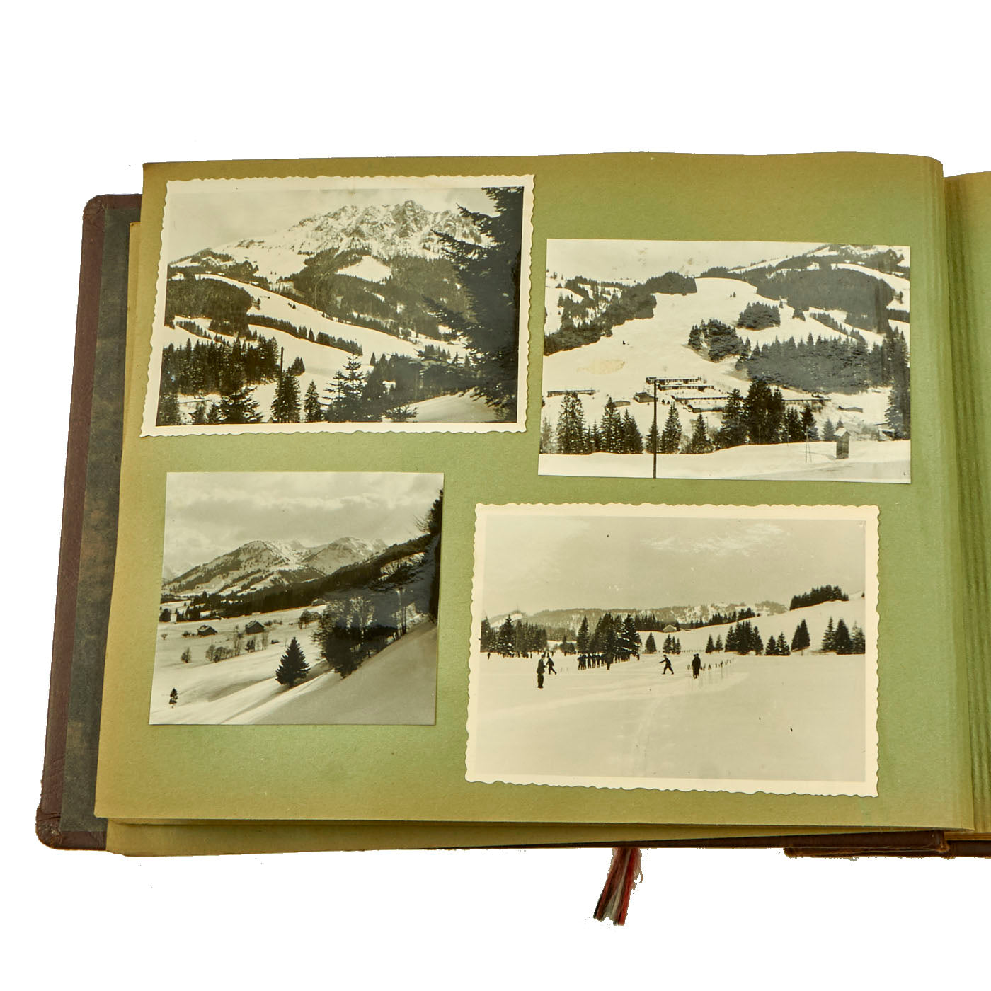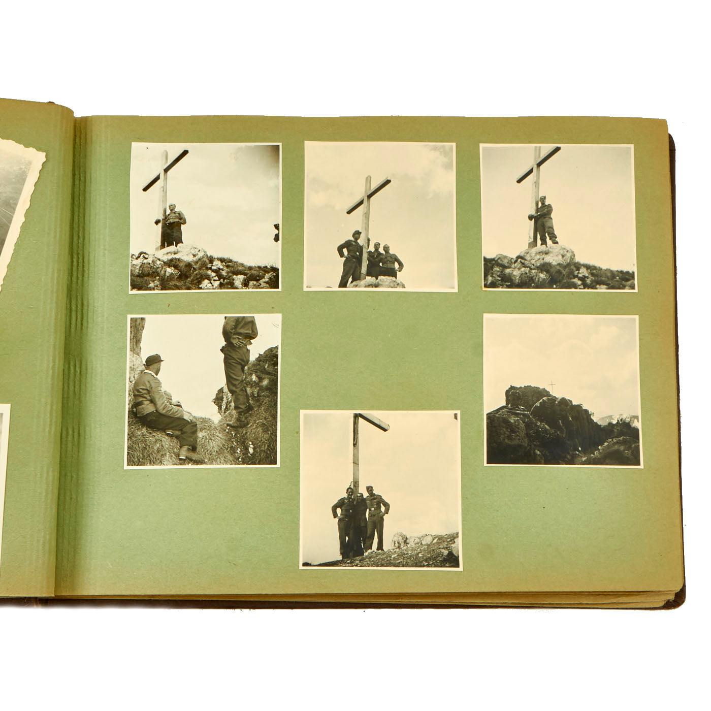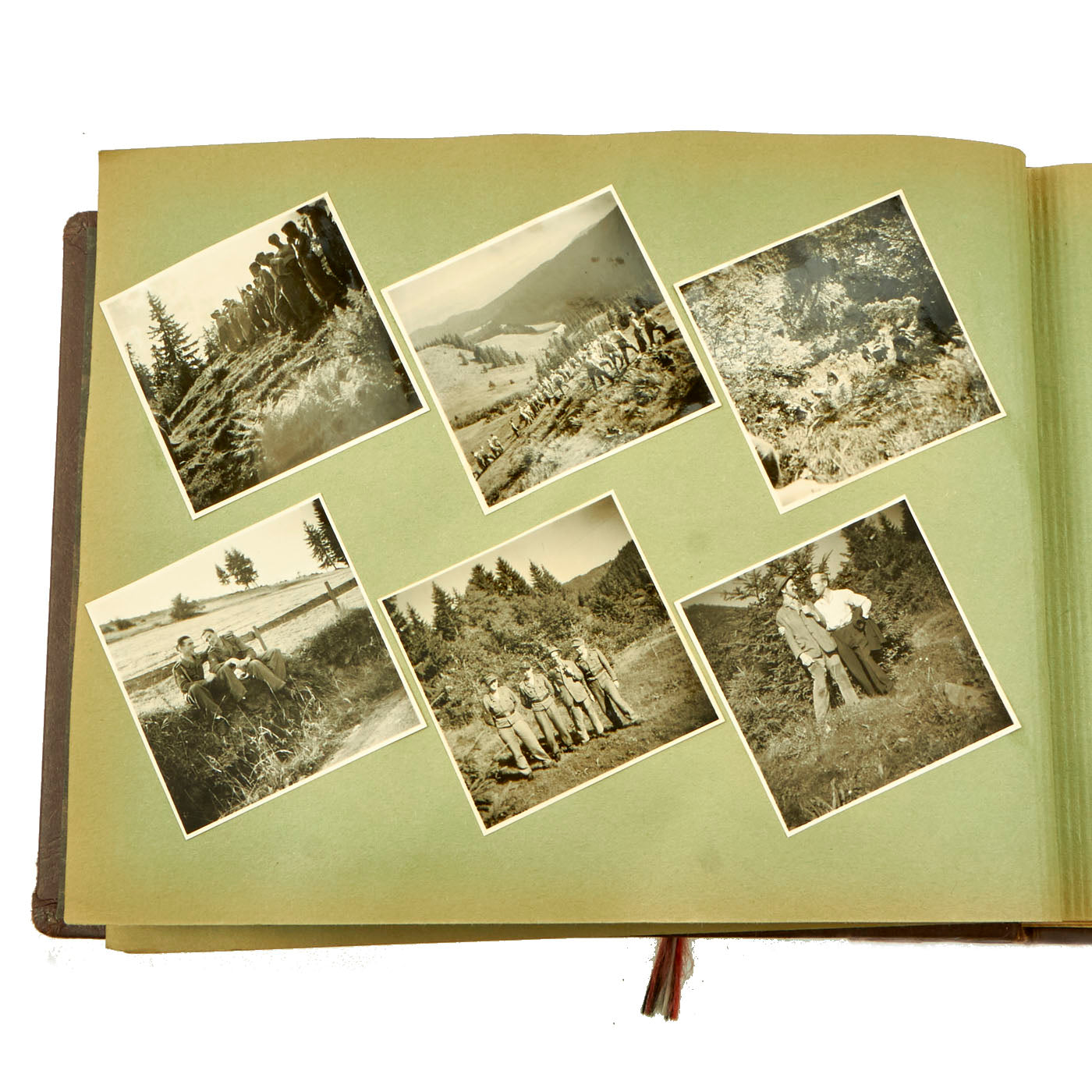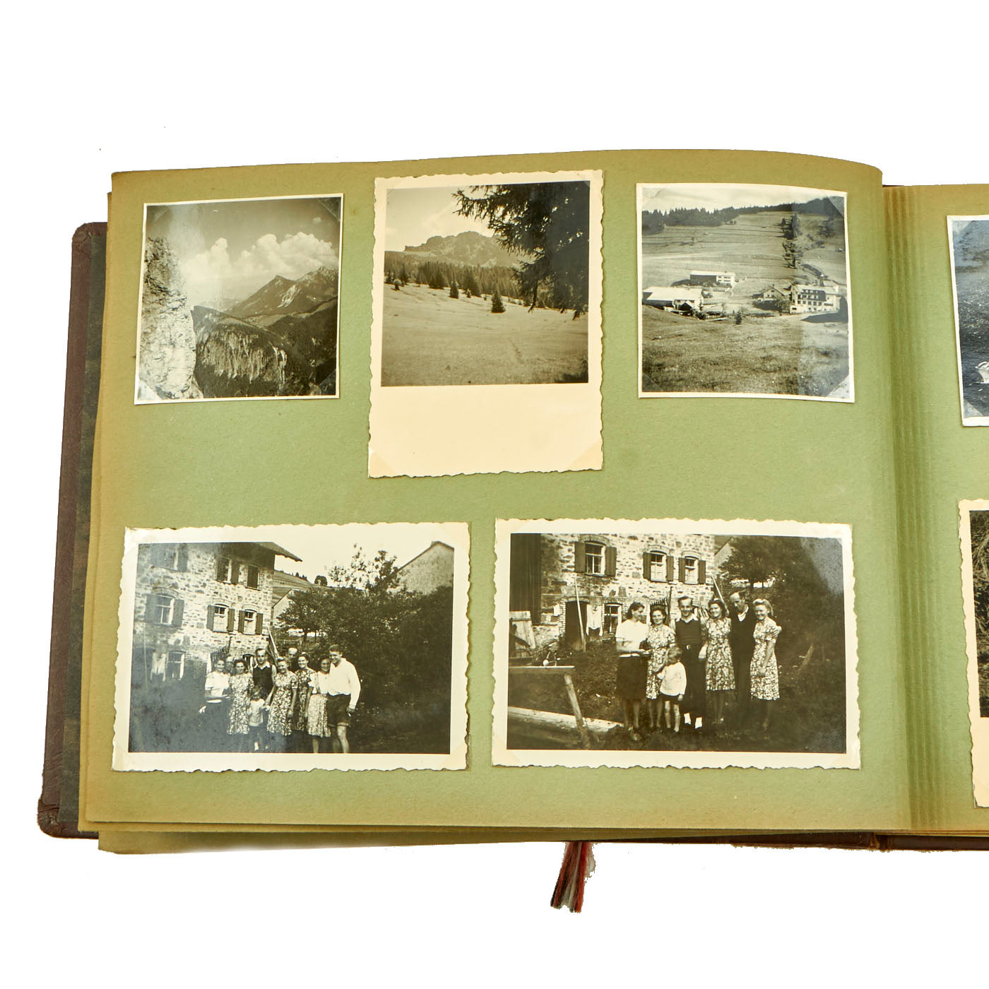 Original Item: One-Of-A-Kind. This is a wonderful personal photo album with some professional shots as well as personal snapshots, which look to have come from the mountainous areas of Germany. They show both military and personnel and civilians during both the winter and warmer months. The soldiers shown definitely have the Luftwaffe Eagle on the right breast of their uniforms, but are present on skiis in the Alpine regions. There is also a picture of mountain climbing, with one soldier having a clear Edelweiß badge on his cap, for a Gebirgsjäger Mountain trooper.