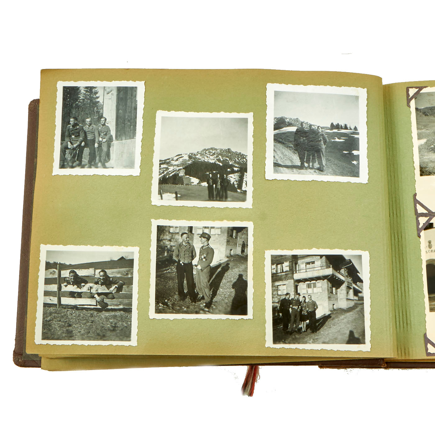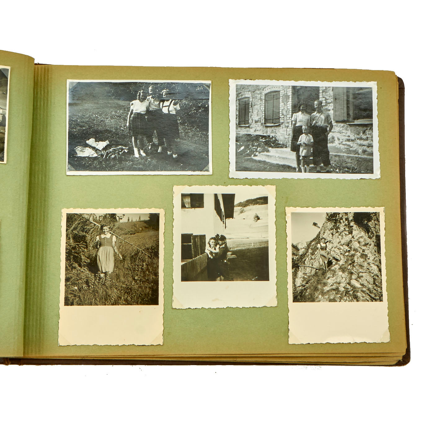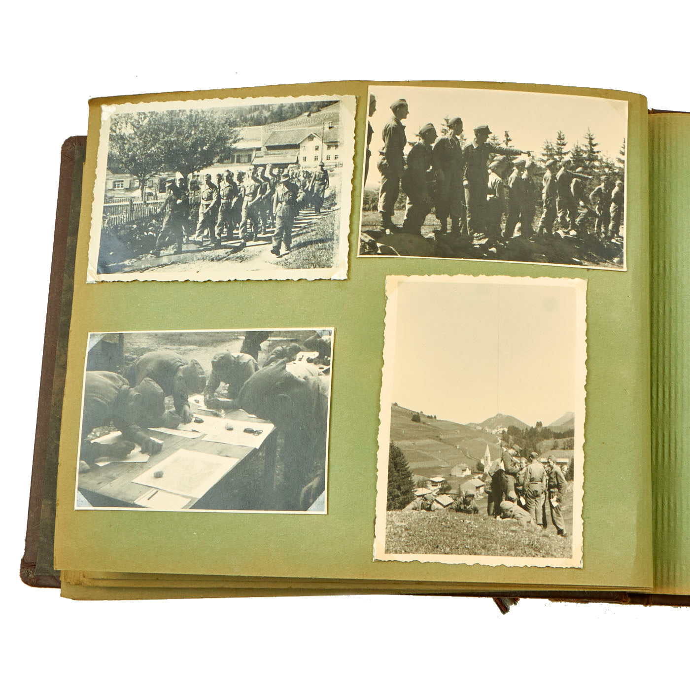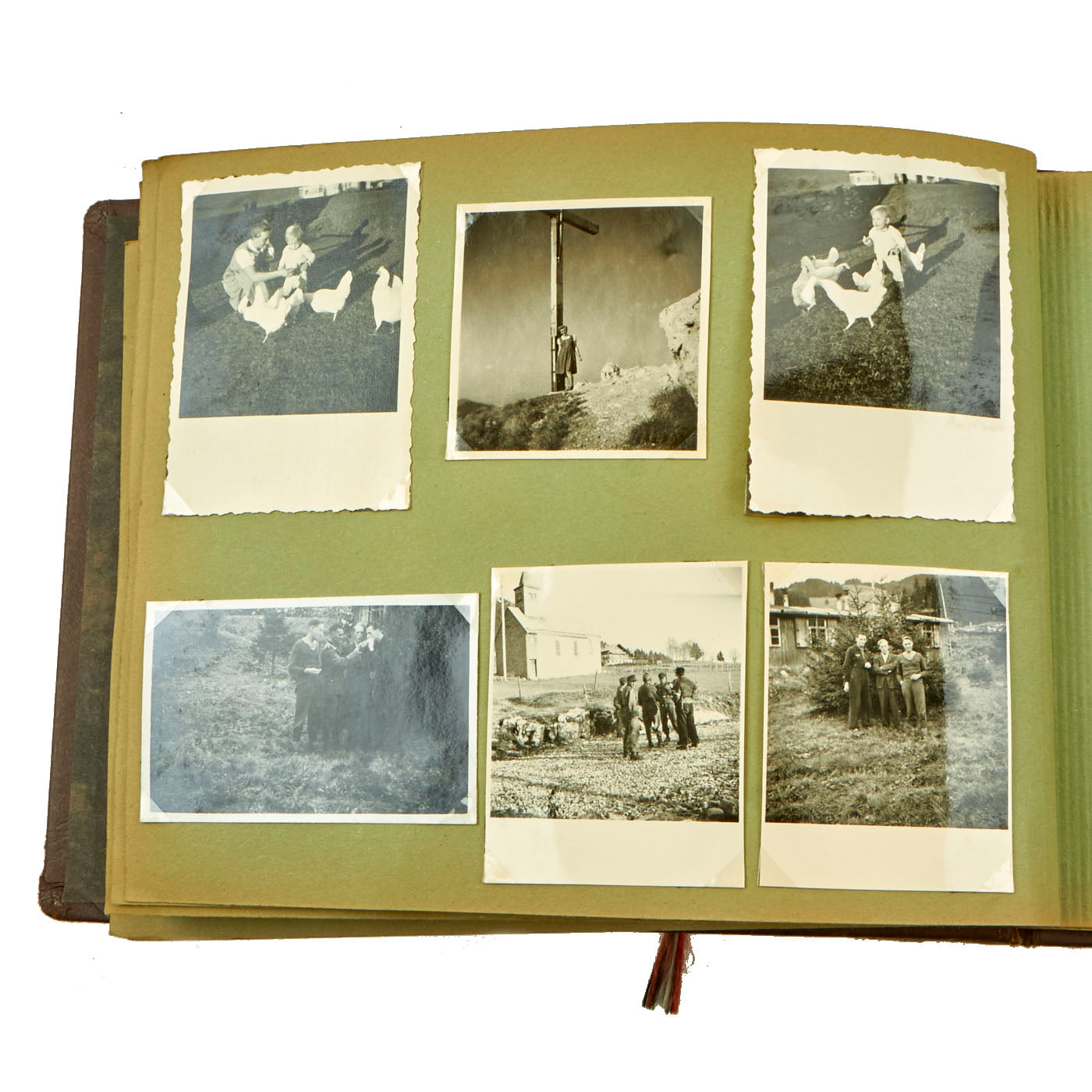 Original Item: One-Of-A-Kind. This is a wonderful personal photo album with some professional shots as well as personal snapshots, which look to have come from the mountainous areas of Germany. They show both military and personnel and civilians during both the winter and warmer months. The soldiers shown definitely have the Luftwaffe Eagle on the right breast of their uniforms, but are present on skiis in the Alpine regions. There is also a picture of mountain climbing, with one soldier having a clear Edelweiß badge on his cap, for a Gebirgsjäger Mountain trooper.