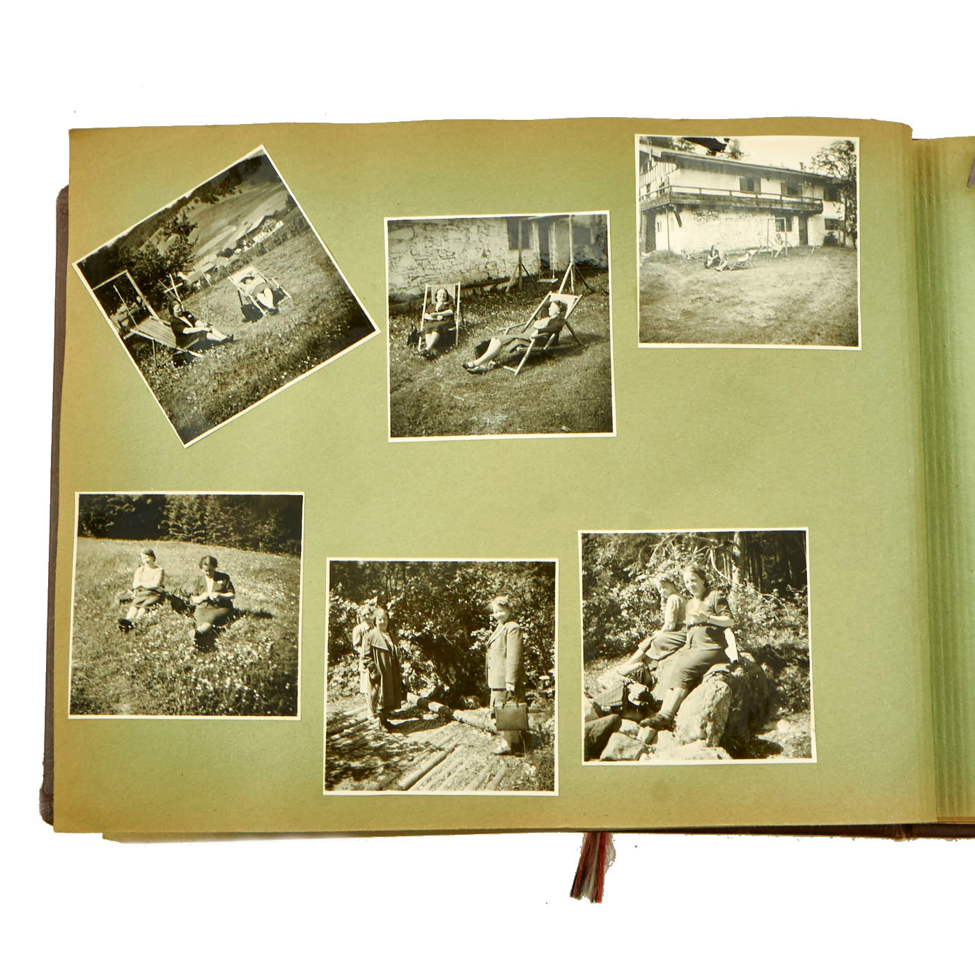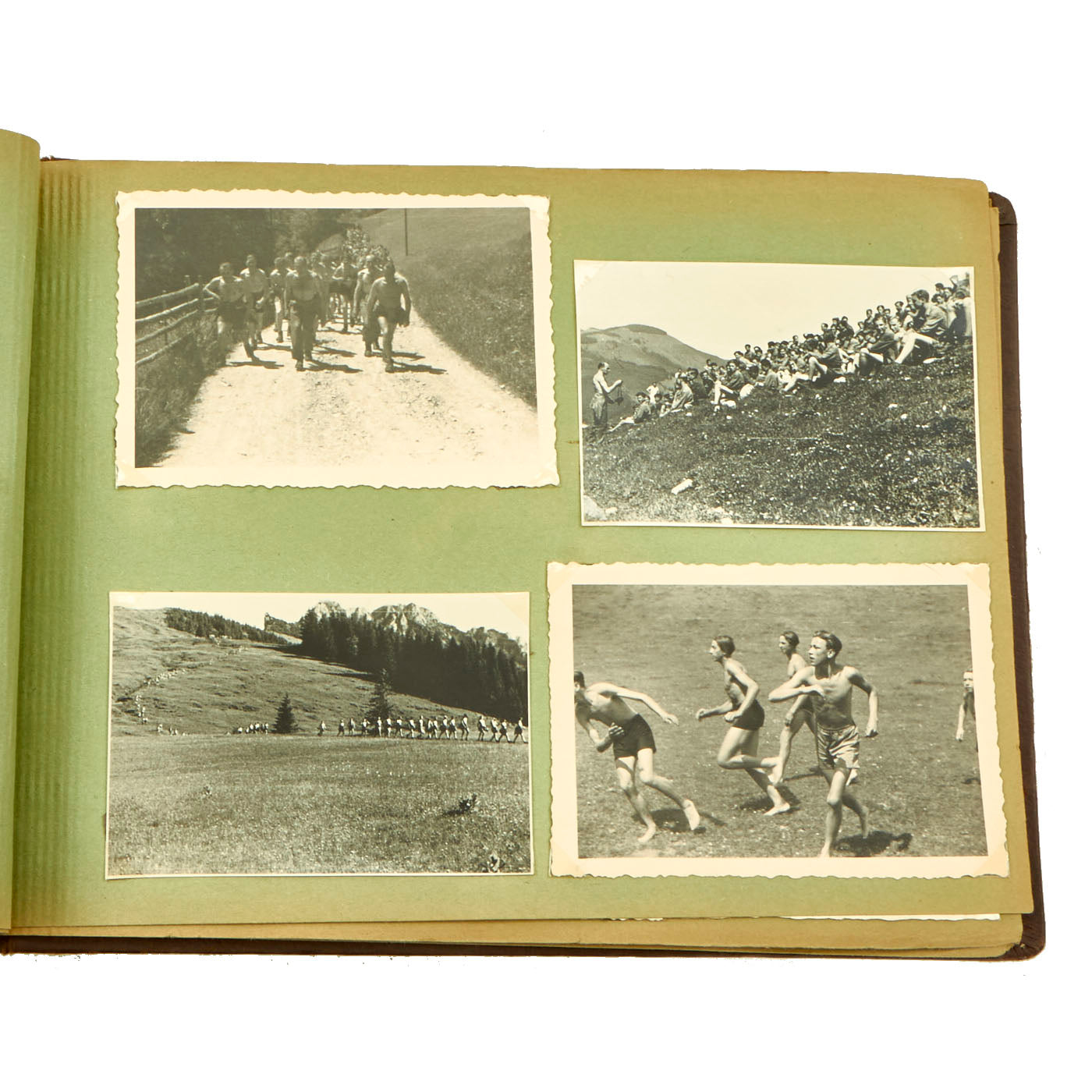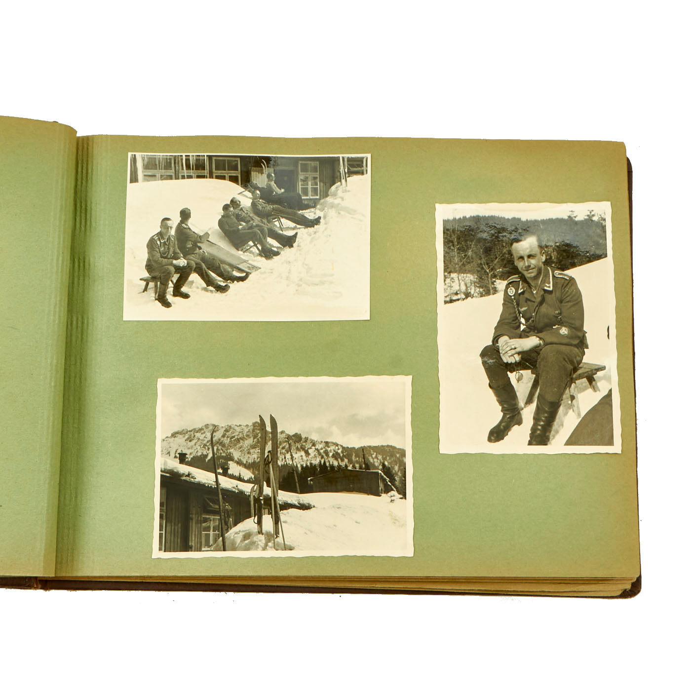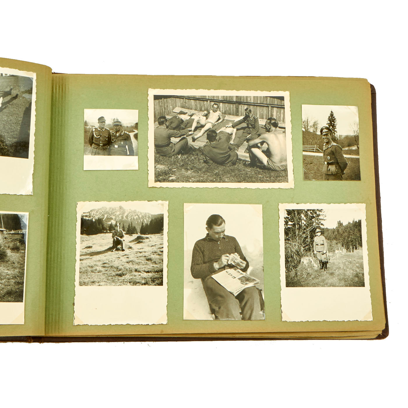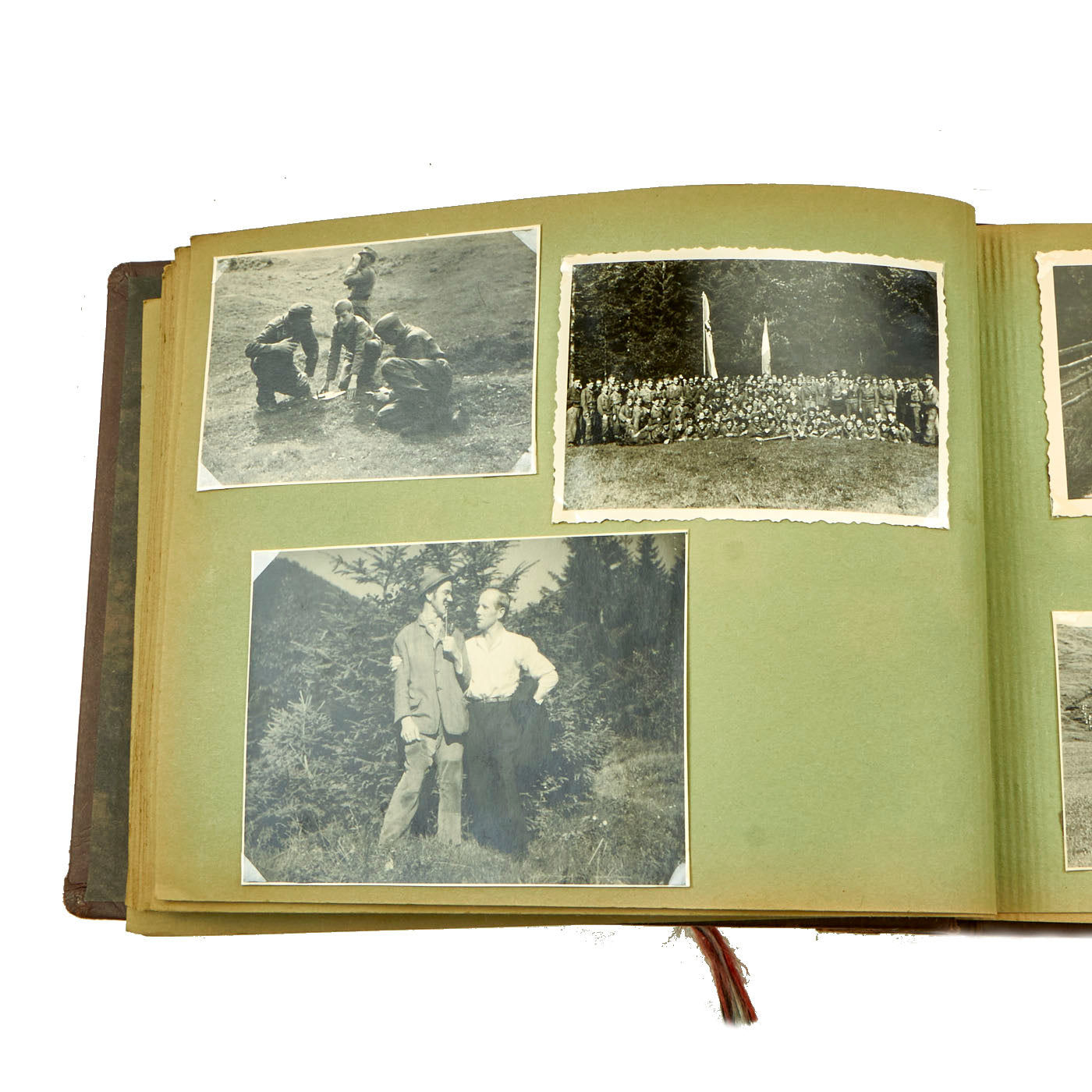 Original Item: One-Of-A-Kind. This is a wonderful personal photo album with some professional shots as well as personal snapshots, which look to have come from the mountainous areas of Germany. They show both military and personnel and civilians during both the winter and warmer months. The soldiers shown definitely have the Luftwaffe Eagle on the right breast of their uniforms, but are present on skiis in the Alpine regions. There is also a picture of mountain climbing, with one soldier having a clear Edelweiß badge on his cap, for a Gebirgsjäger Mountain trooper.