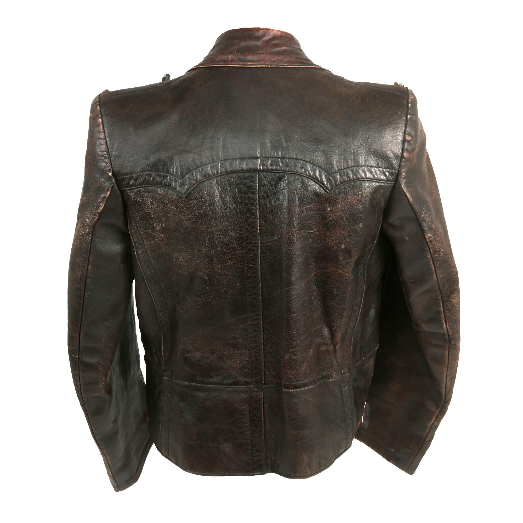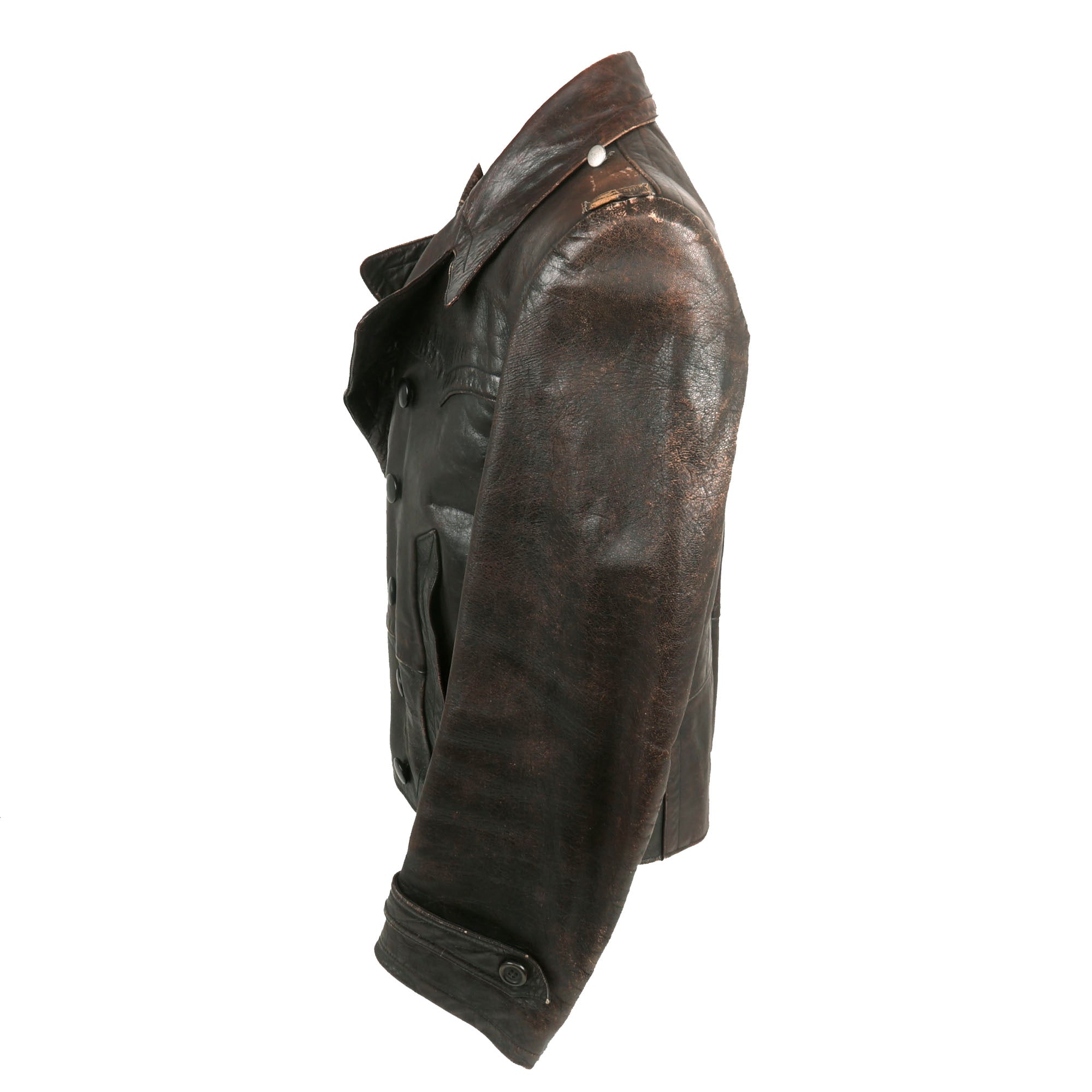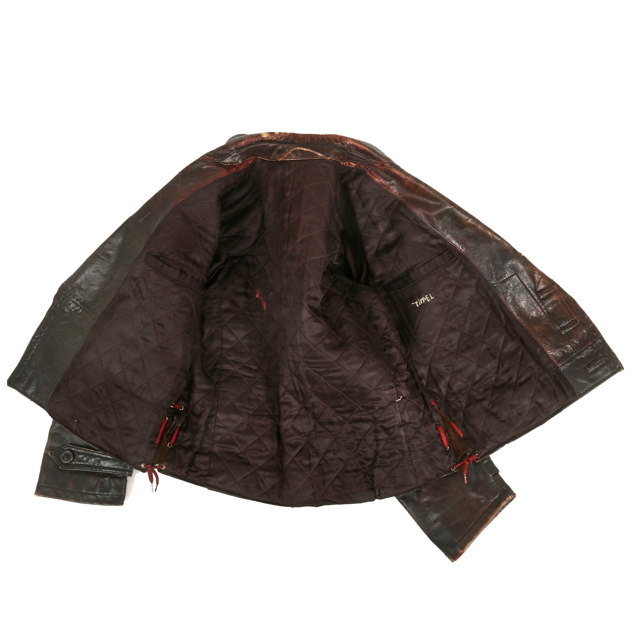 Original Item: Only One Available. This is a lovely German WWII Private Purchase brown leather jacket, which could have been used just as easily for a Luftwaffe Pilot or a Panzer Tanker. The double breasted front closure evokes the leather greatcoats worn during WWII, and gives it a great look. It is in very good condition, showing signs of moderate use during the war. It has leather loops at the edge of the shoulders, as well as pebbled buttons, used for the attachment of shoulder rank insignia. There is no type of Wehrmachtadler eagle present on the exterior, and we were not able to find any maker labels either, so it is definitely a custom-made bespoke example.