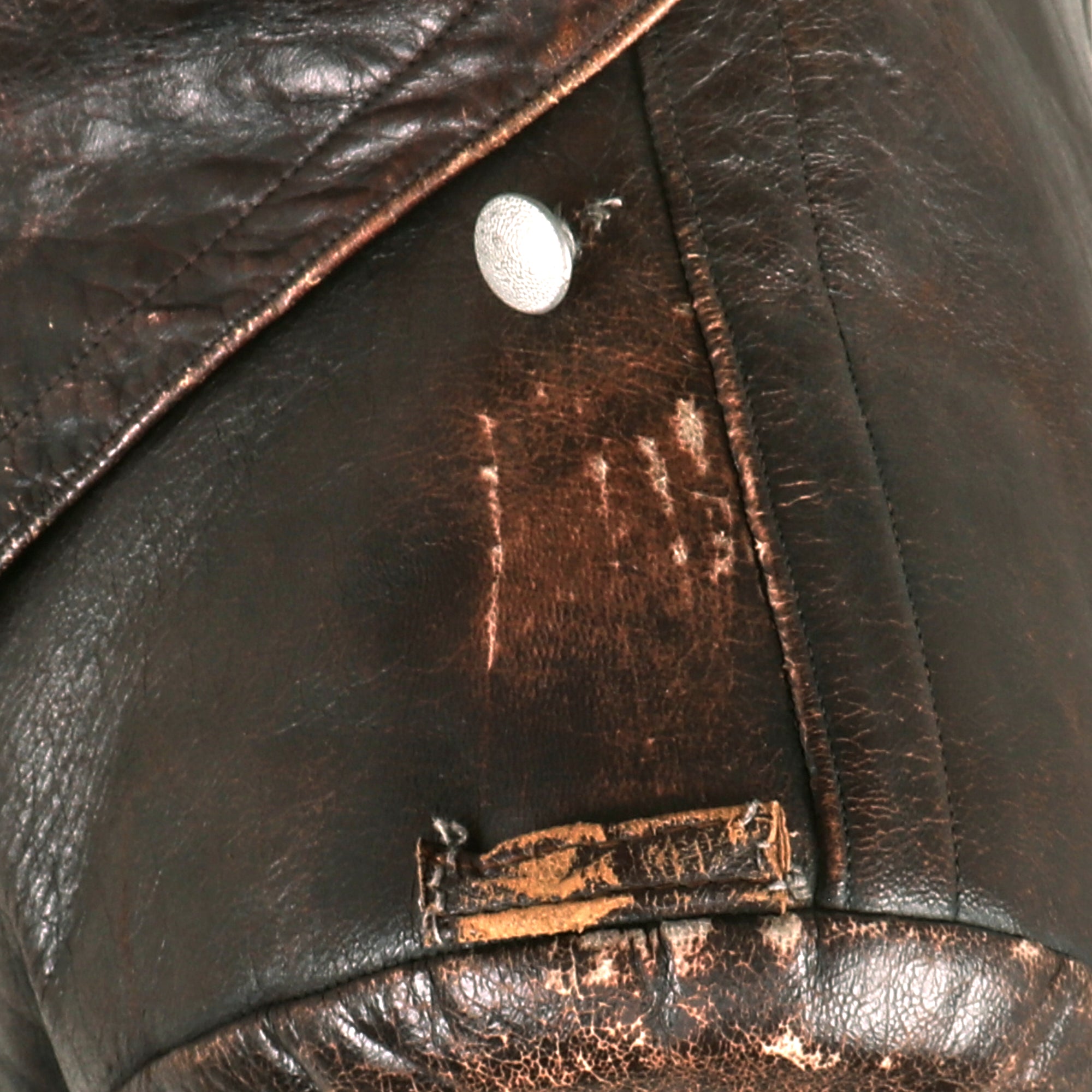 The design is a private purchase, non-regulation, multi-panel chocolate brown leather construction jacket, with a lovely large lay down collar. It is the standard waist length, and the leather is in very good condition, showing no major tearing, holes, or other major wear. The jacket features a double-breasted front closure with 5 leather covered buttons on each side. The collar lapels feature an additional button hole on each side, however there are no buttons for them to attach to, so they are only for decoration. There are buttons and straps at the end of both sleeves, but they are also ornamental. There are vertical slash waist pockets on either side, which do not have any button closure.