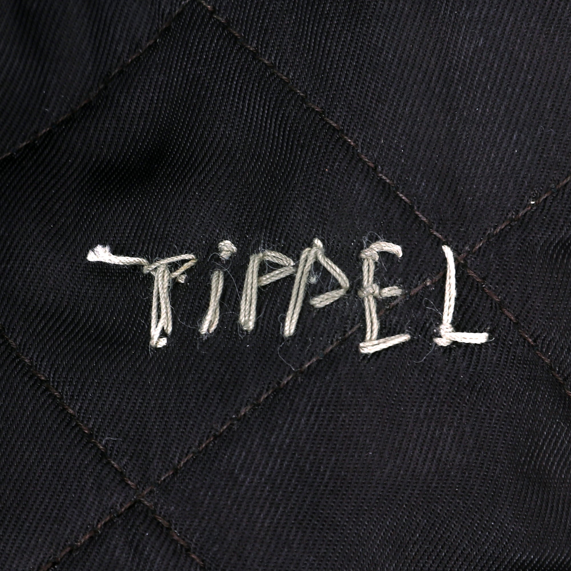 The interior is lined with brown rayon, with quilted stitching around the chest area, while the sleeve linings have no stitching. There are horizontal slash pockets both inner chest areas, and the left side has the name TIPPEL embroidered underneath it. There are waist adjustment straps on both sides under the sleeves.