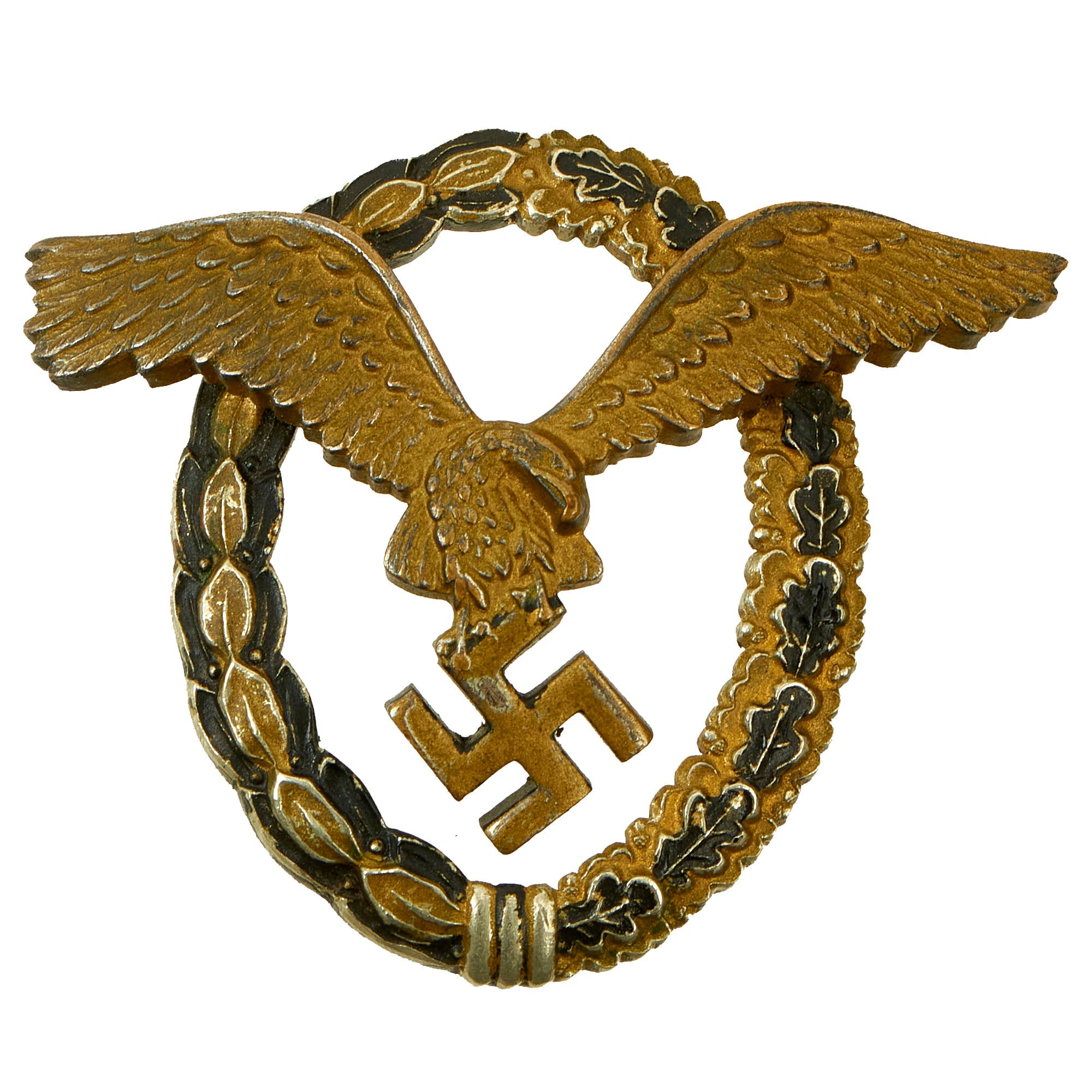 The Luftwaffe Aviator / Pilot Badge (Flugzeugführerabzeichen or Pilotenabzeichen) was a World War II German military decoration awarded to Luftwaffe service personnel who completed flight training, receiving their flying license and citation. It was instituted on 26 March 1936 by the Commander in Chief of the Luftwaffe Hermann Göring. It came in distinct types; nickel silver (changed to zinc during the war) and a variant made of gold. It depicts a silver eagle (Silberner Adler) perched atop a swas (hook cross), wings open in a landing pose, and surrounded by a wreath with laurel (Lorbeer) on the right side and oak leaf (Eichenlaub) branches on the left side, respectively. It was worn on the lower part of the left breast pocket of the service tunic, underneath the Iron Cross 1st Class if awarded.