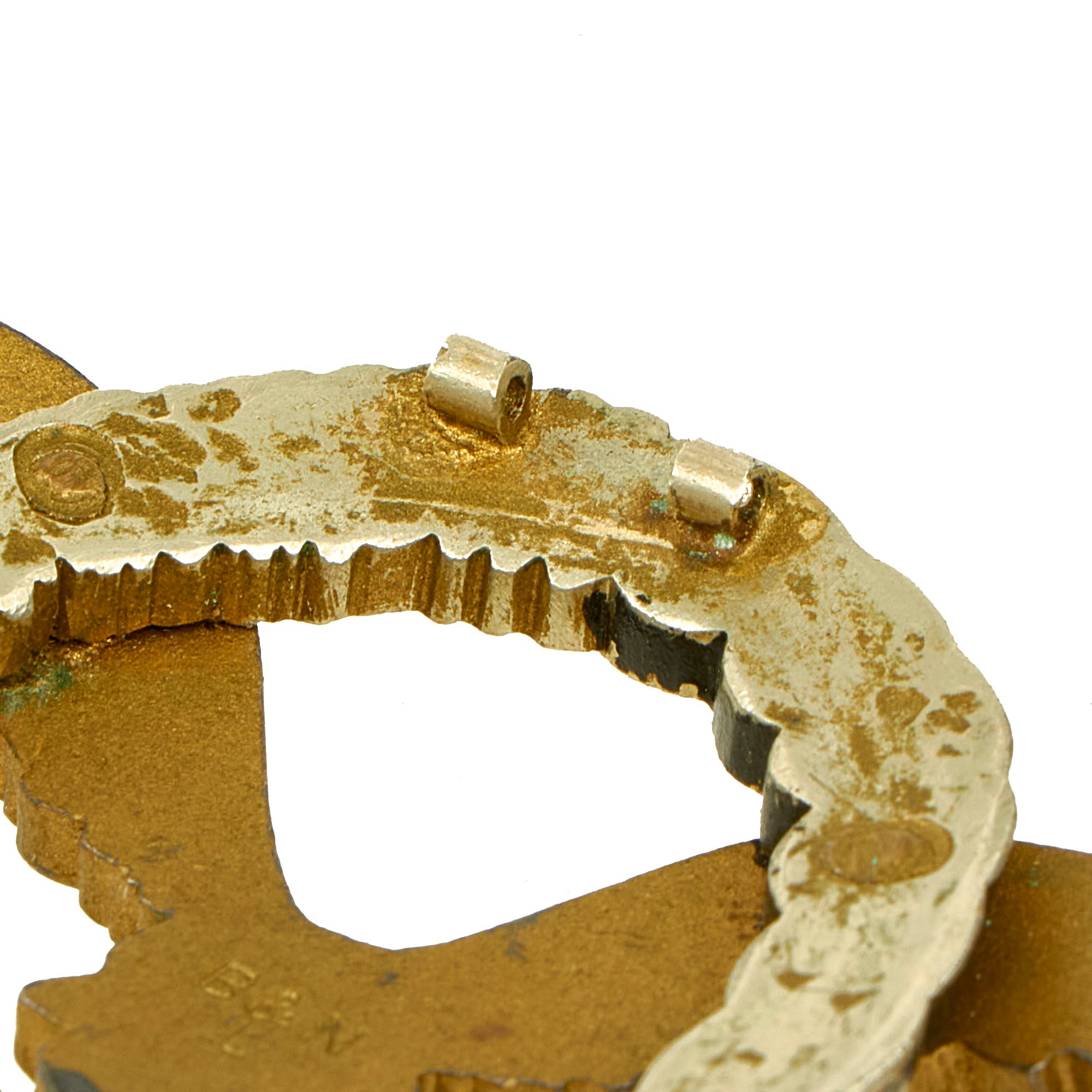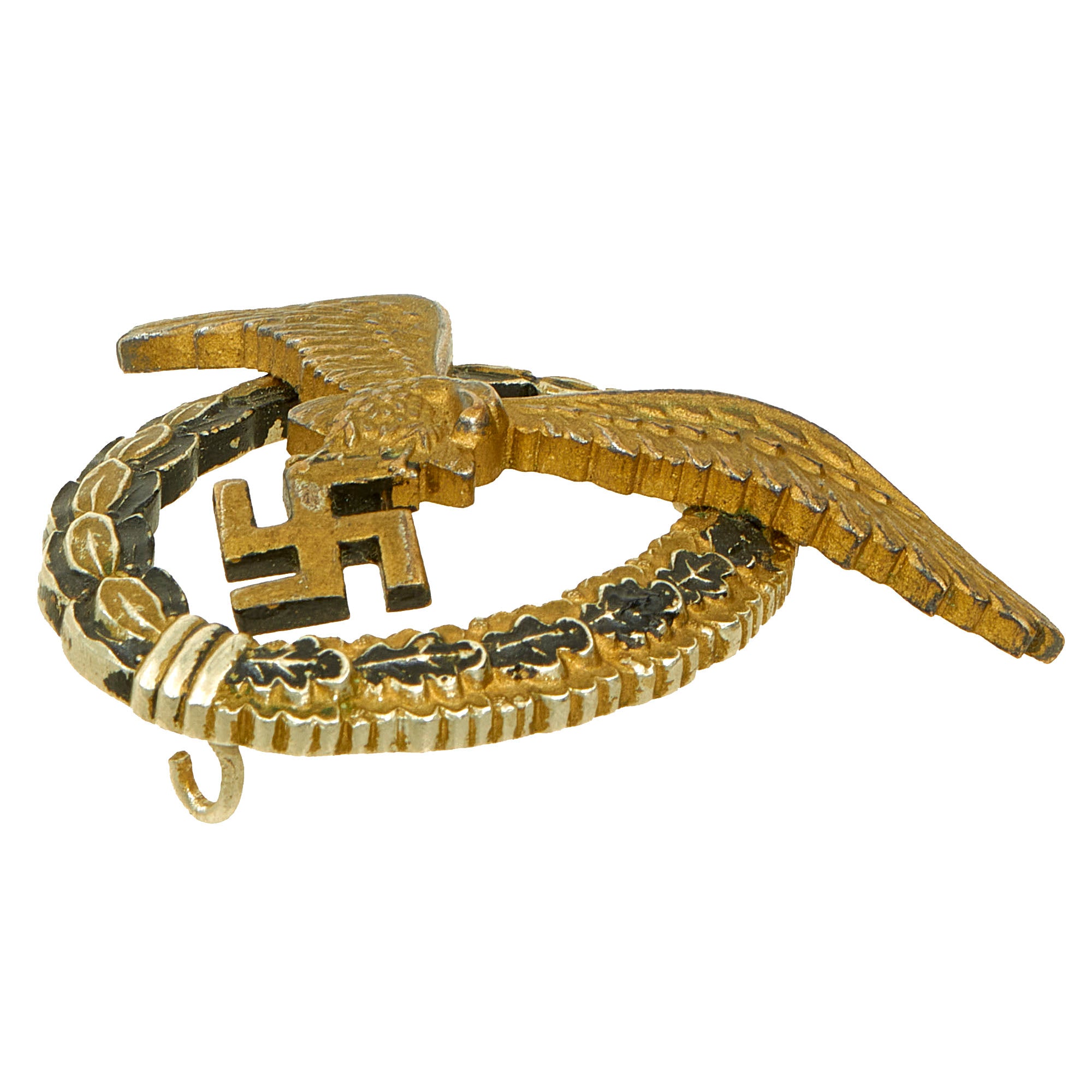 Original Items: Only One Available. This is a very nice condition Luftwaffe Pilot's Badge, which looks to be of early war Tombak alloy construction. The "swooping eagle" is held on by the usual two rivets, and may originally have been blacked in finish, however it looks to have been painted gold a long time ago. It was produced with a vertical pinback, bent wire catch, and barrel hinge, however the pin for the hinge must have fallen out, and the pin was lost.