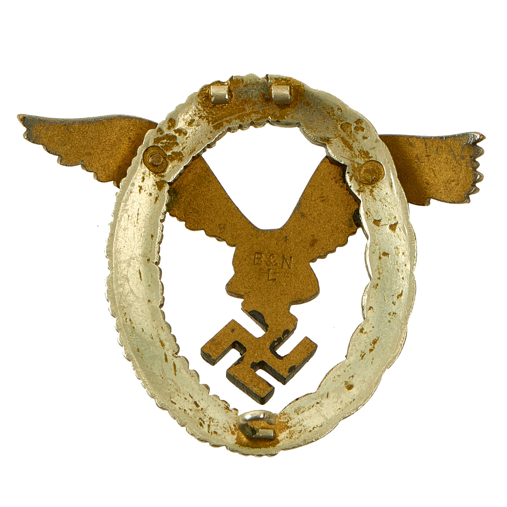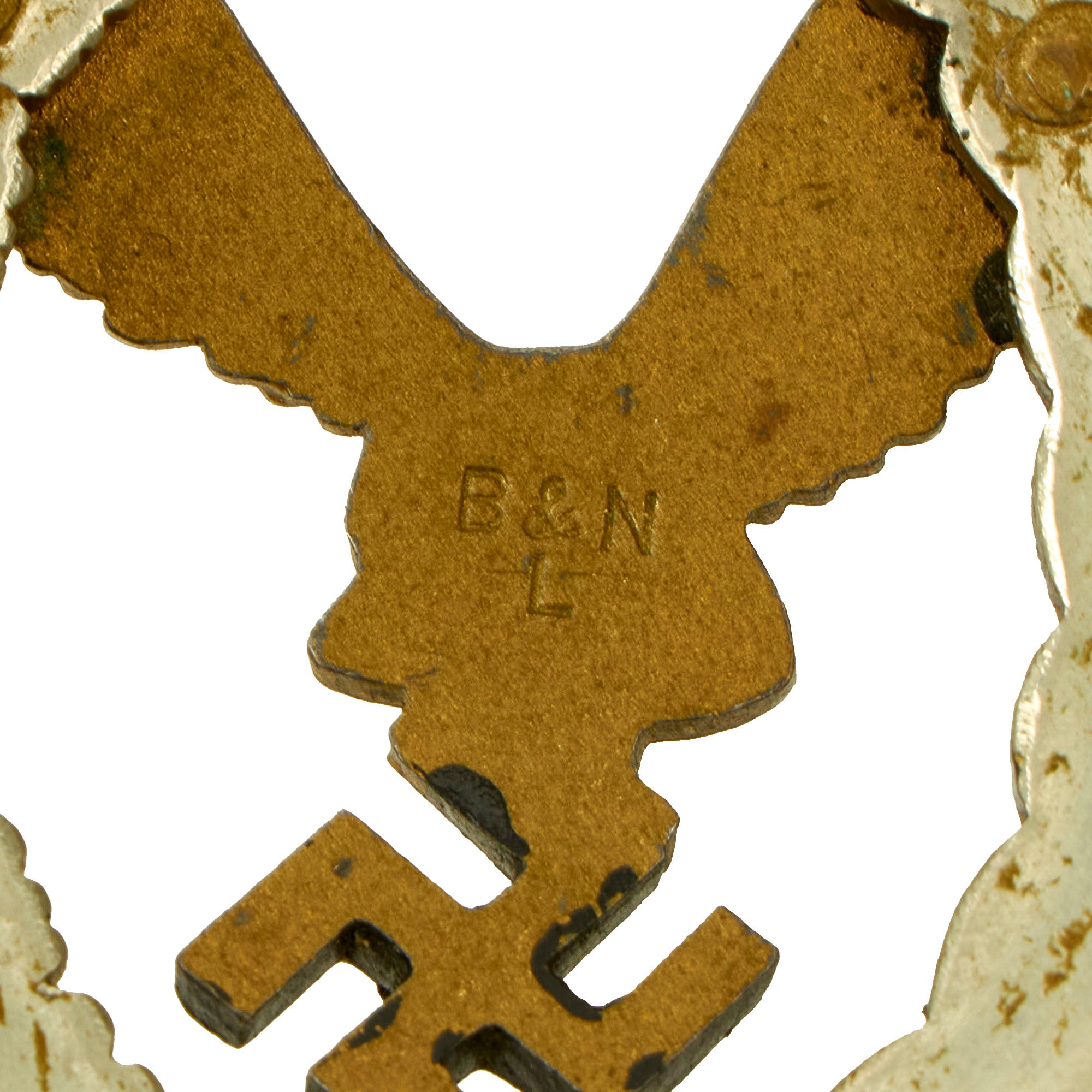 The back of the eagle is maker marked with the B & N / L trademark for Berg & Nolte of Lüdenscheid, a city with a very large garment accessories industry. This company designed and made many badges and insignia during WWII, and are a known manufacturer of the Luftwaffe Pilot's badge, as well as other Luftwaffe awards.