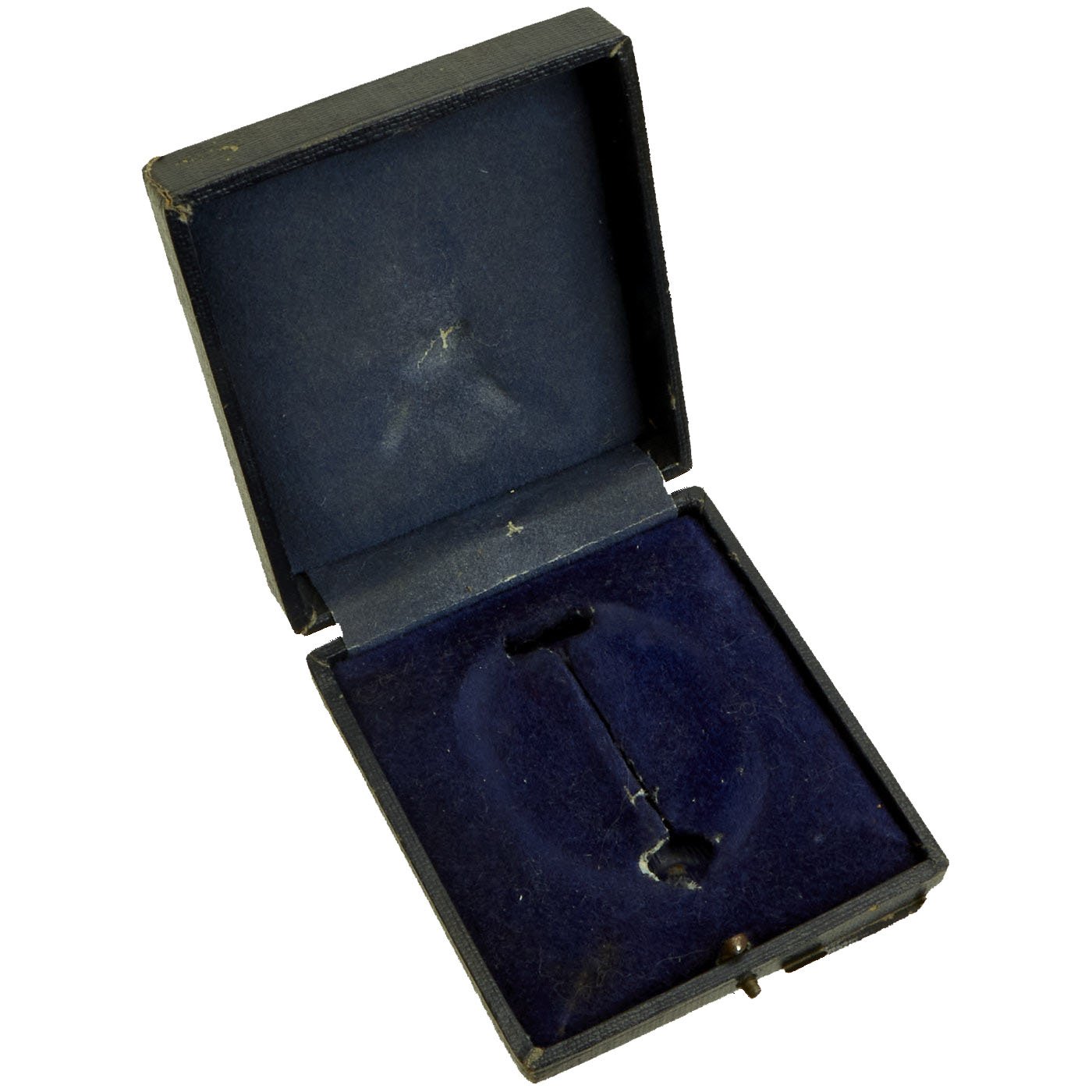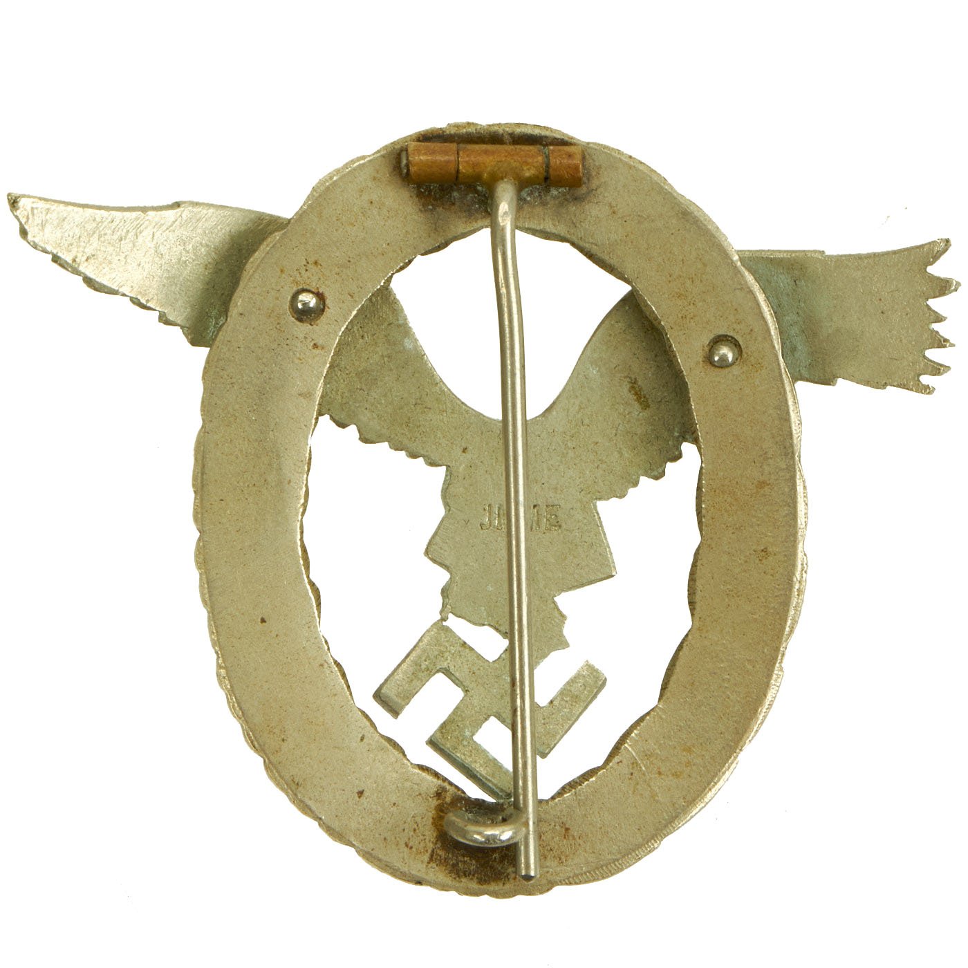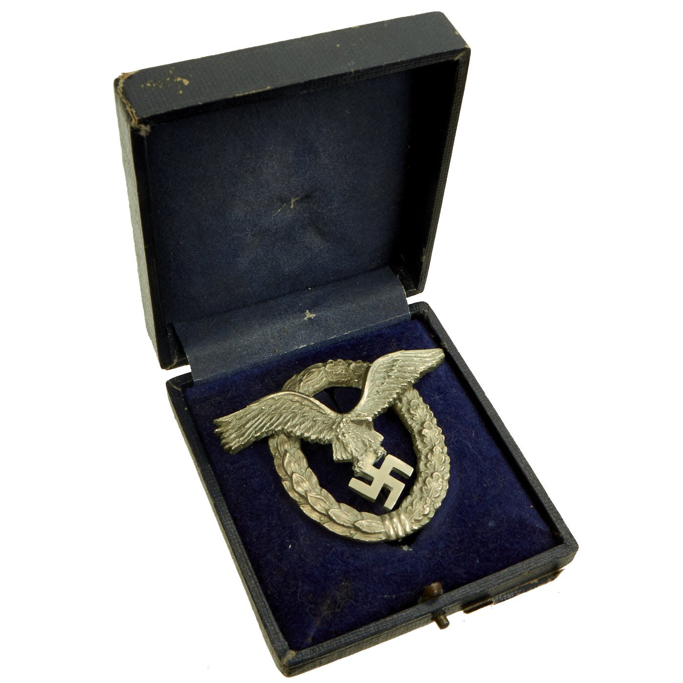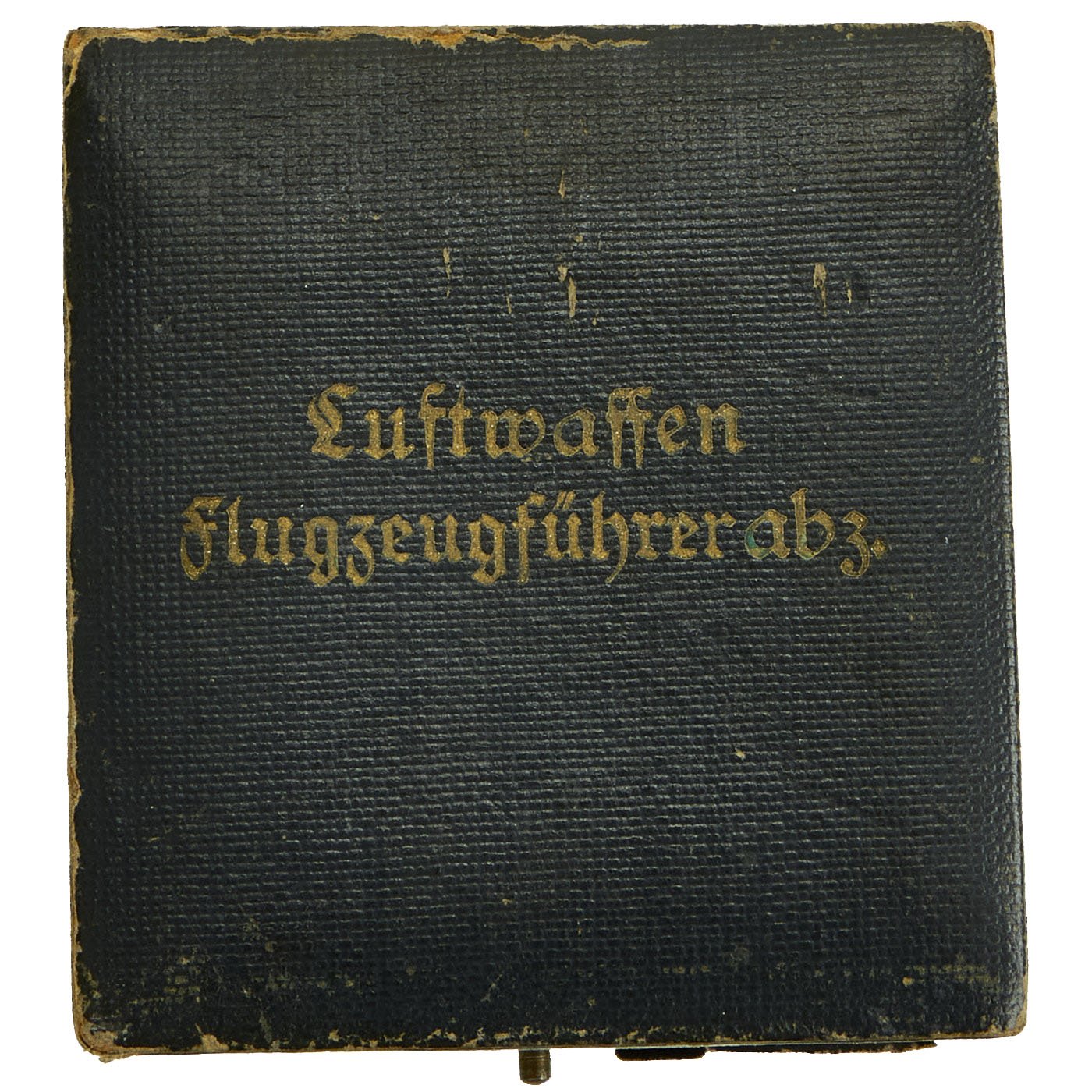 The badge is accompanied by its original issued case, constructed of card stock with a faux dark blue leather exterior, obverse lid with gold embossed inscription of Luftwaffen Flugzeugführerabz. (“Luftwaffe Pilot Badge”) in "Black Letter" typeface. The interior features a blue felt lid liner and slotted faux blue velvet medal bed, and the hinge and spring catch are fully functional.