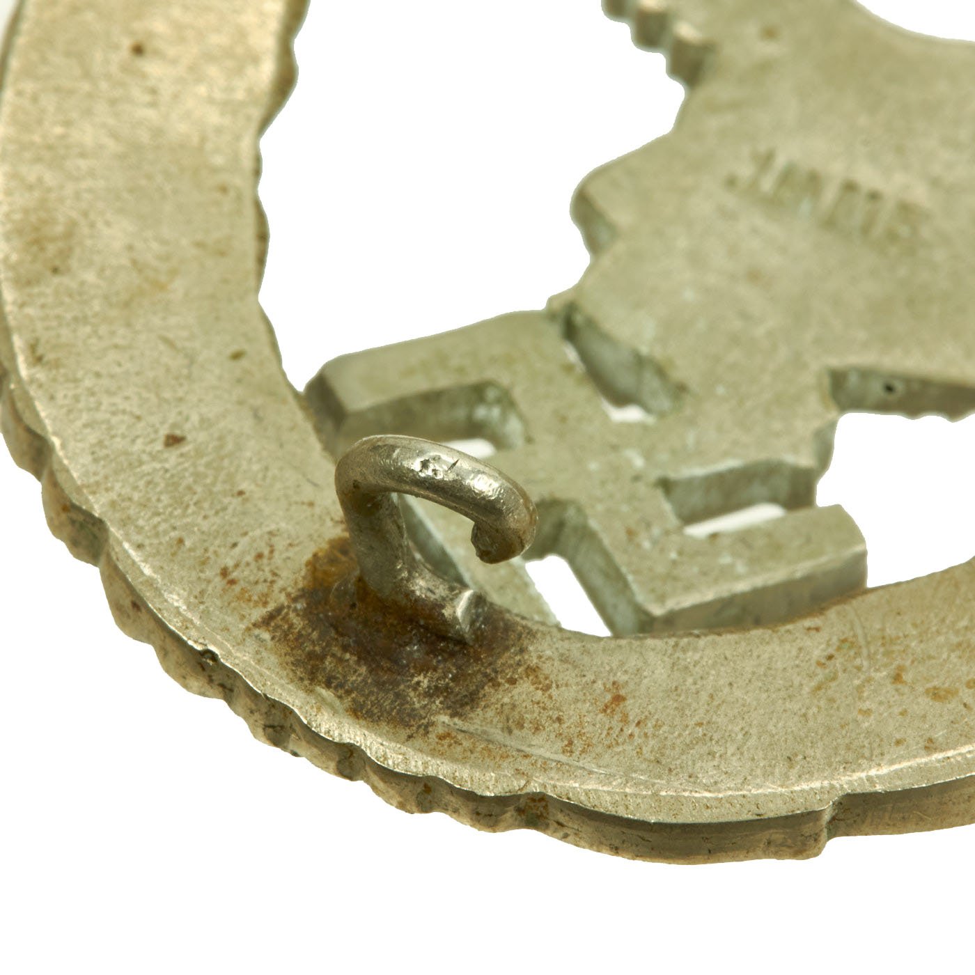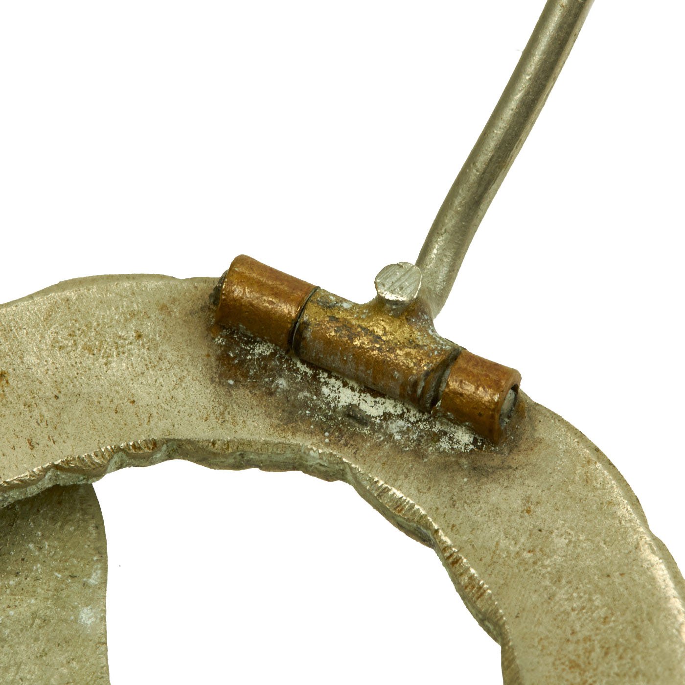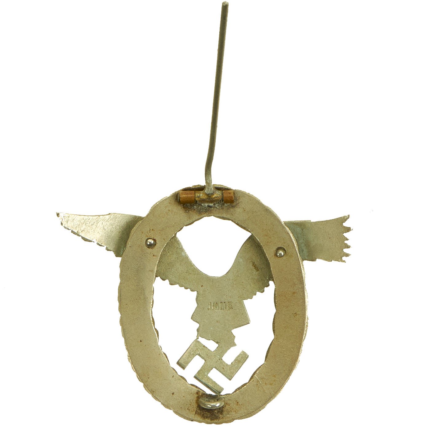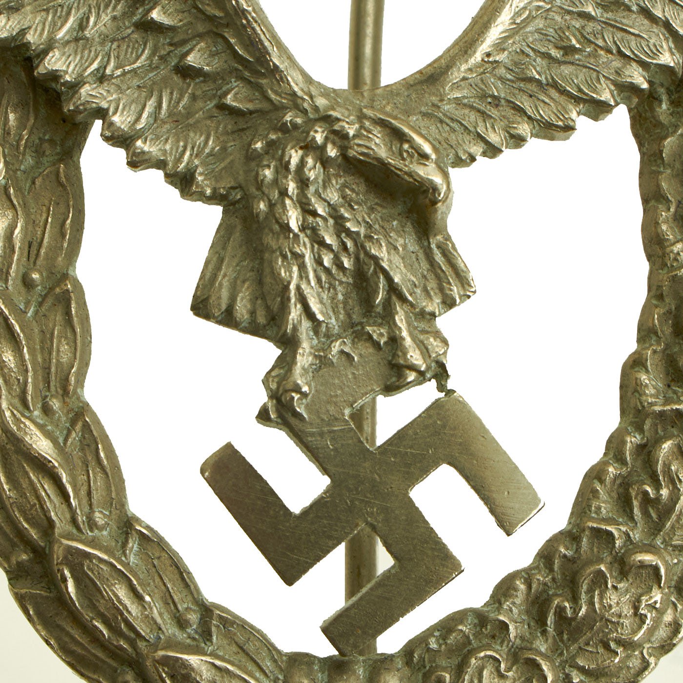 Original Items: Only One Available. This is a very good condition Luftwaffe Pilot's Badge, with the standard two-piece silvered zinc construction. The "swooping eagle" is held on by the usual two rivets. It has a non-magnetic vertical pin on the back, with a barrel hinge and bent wire catch. Condition is very good, with almost all of the original silvering retained, showing a lightly oxidized patina.