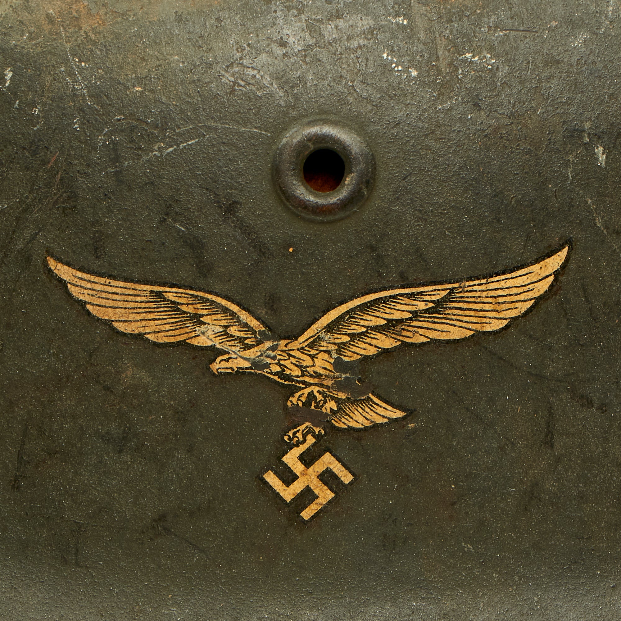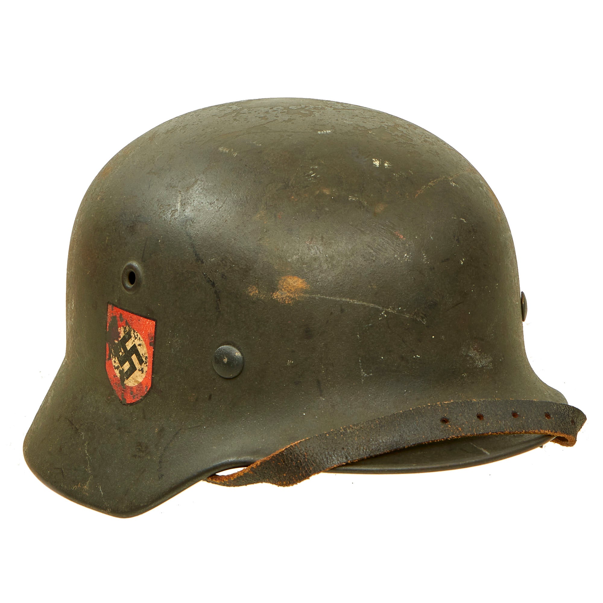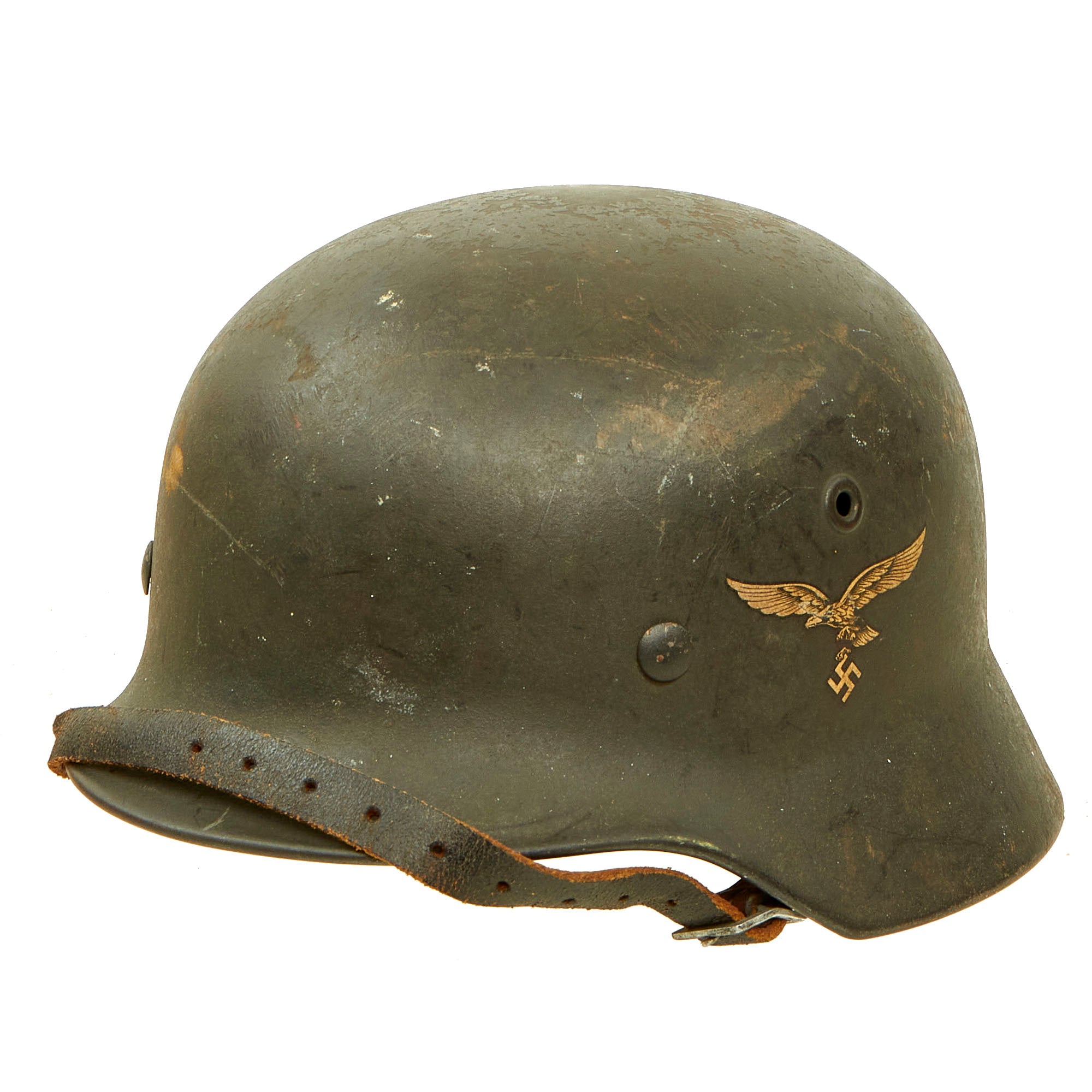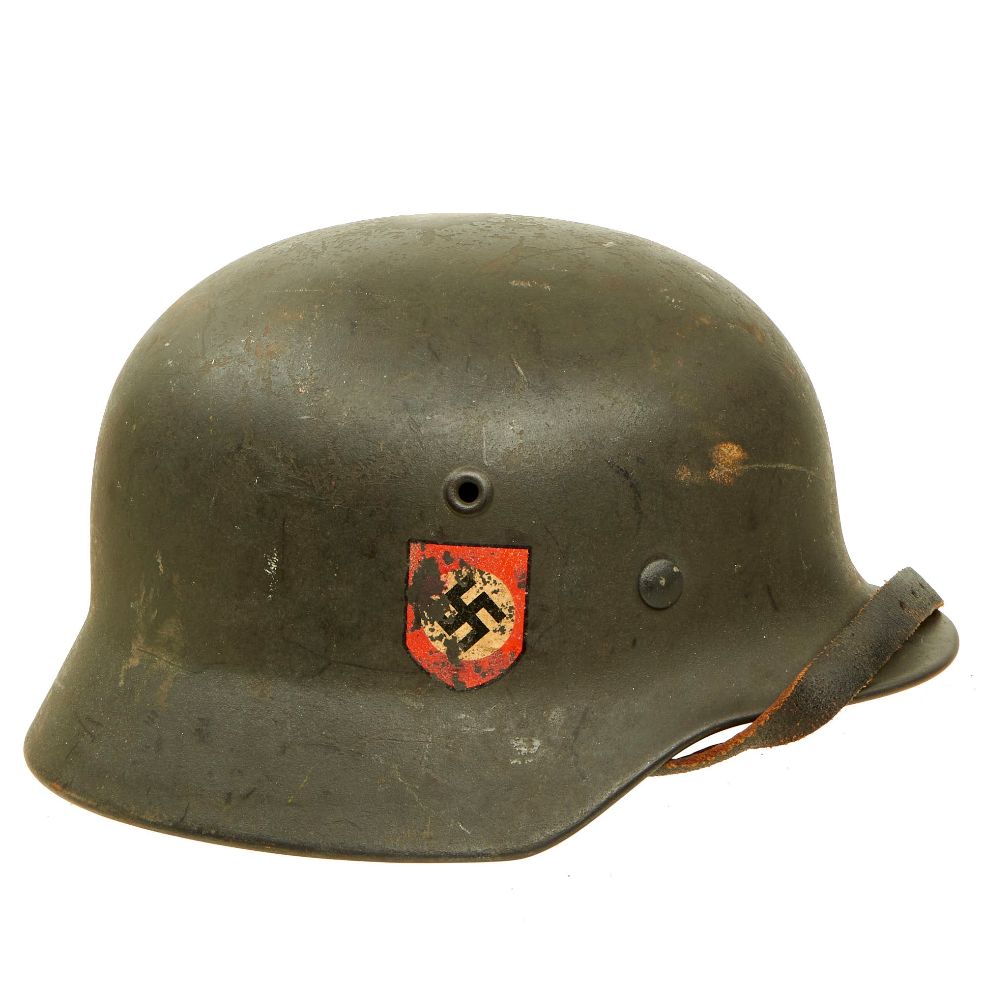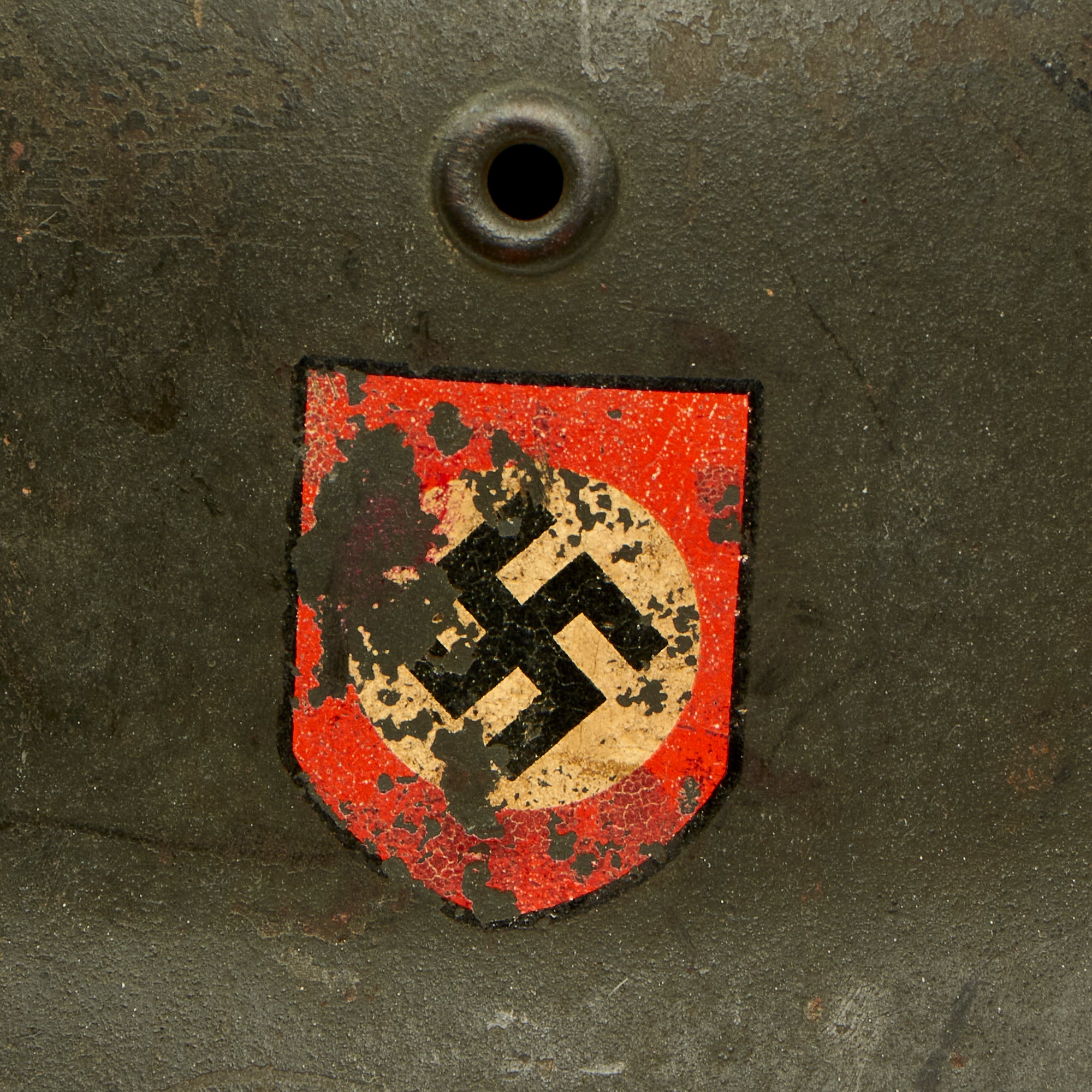 Original Item: Only One Available. This is a very nice all original Model 1940 German WWII "double decal" helmet with a Luftwaffe Eagle decal on the left side, and an "NSDAP Shield" on the right side, as used on Luftwaffe Police helmets. We do not see any signs that it ever had other decals installed, and this is the first example that we have had with decals in this configuration! The use of the second decal was discontinued in 1940, and in 1943 it was ordered that helmets with the national colors have them removed, so finding a helmet with both still intact is a real treat!