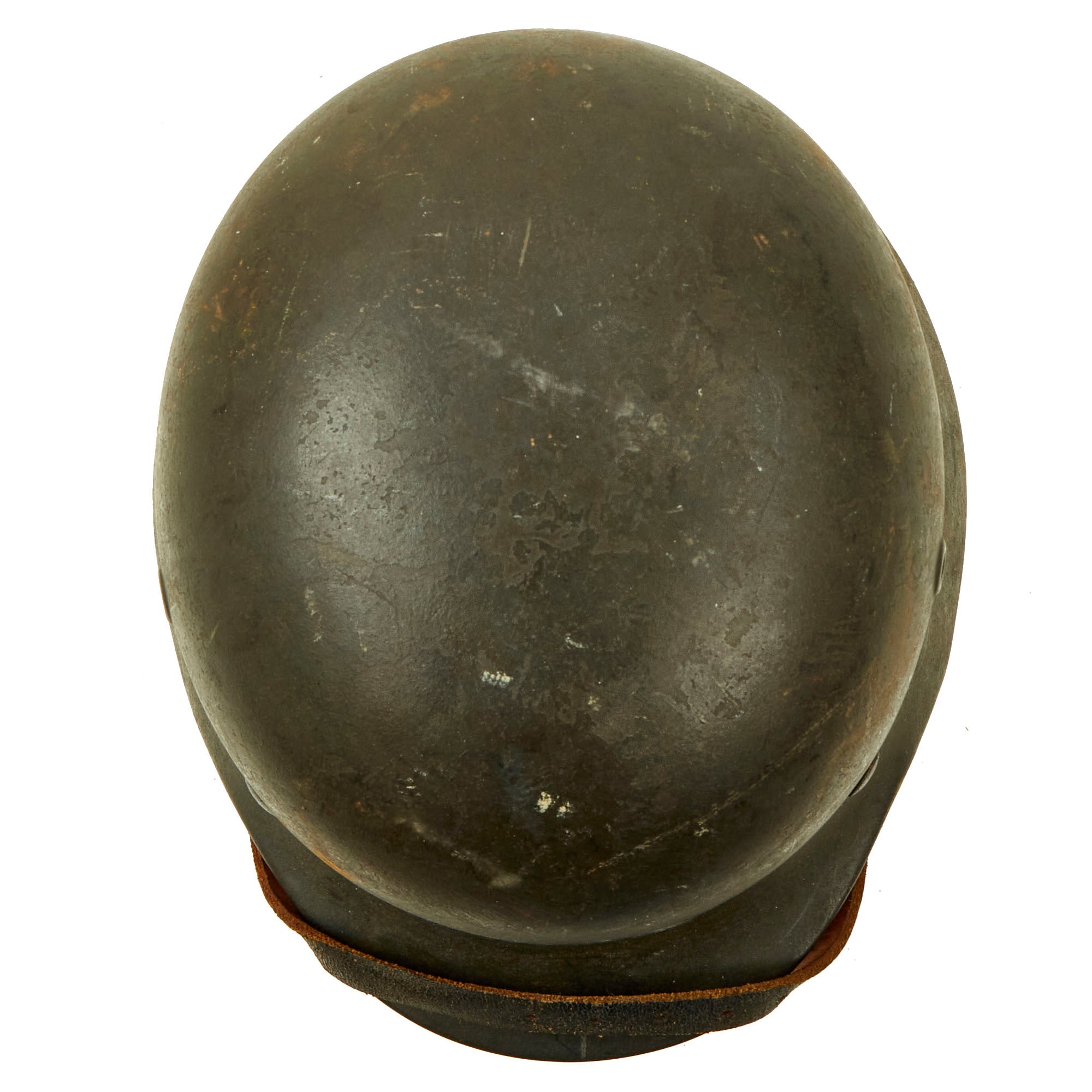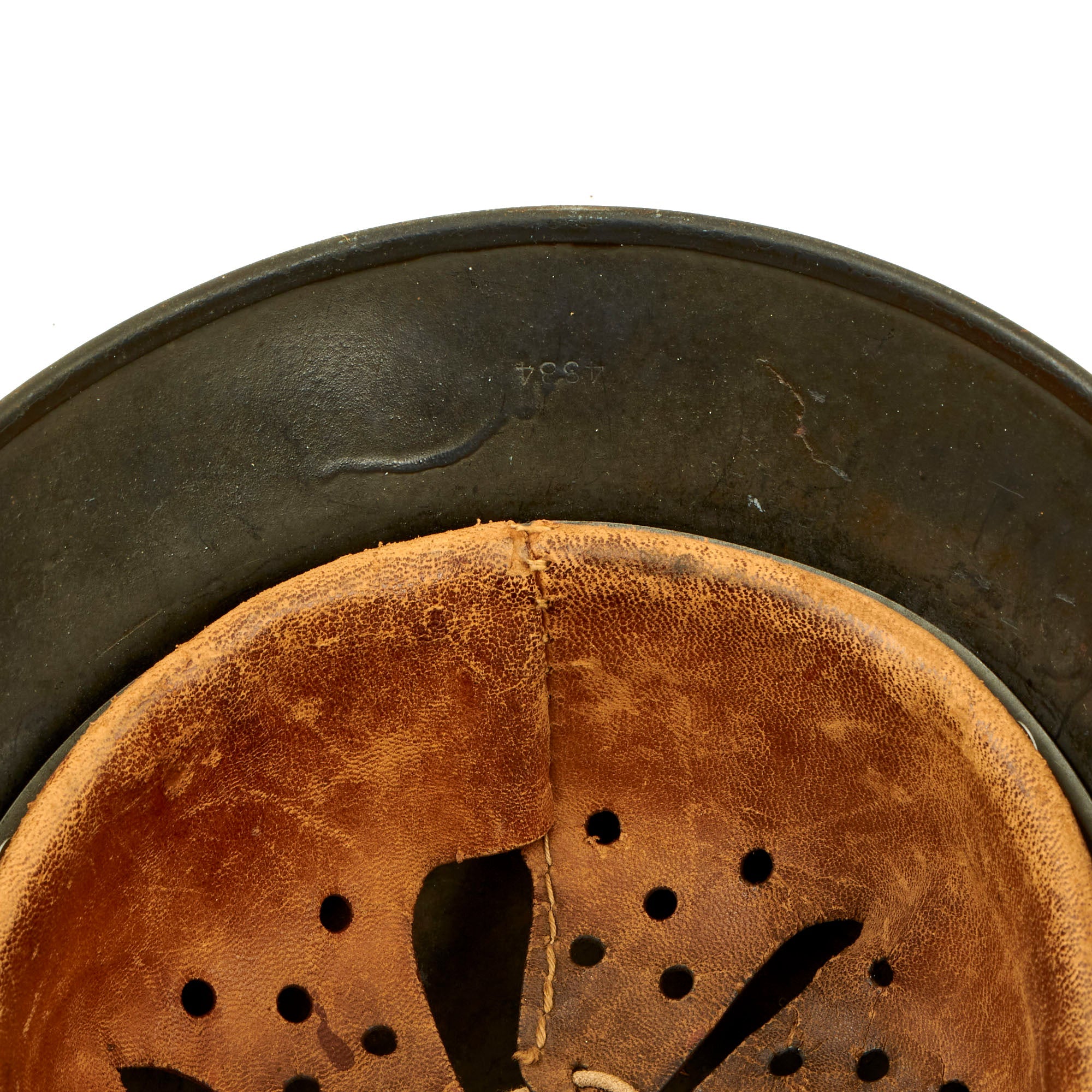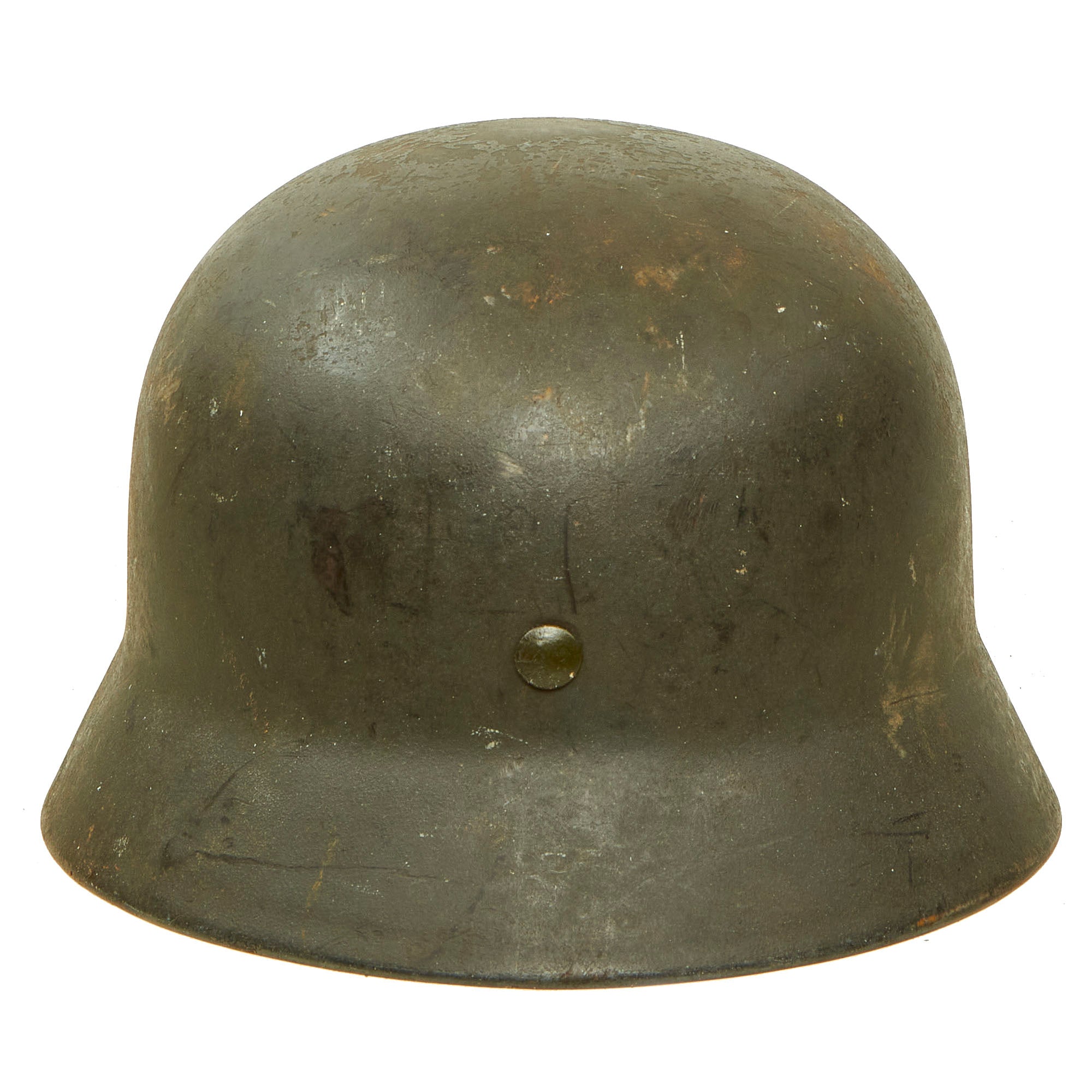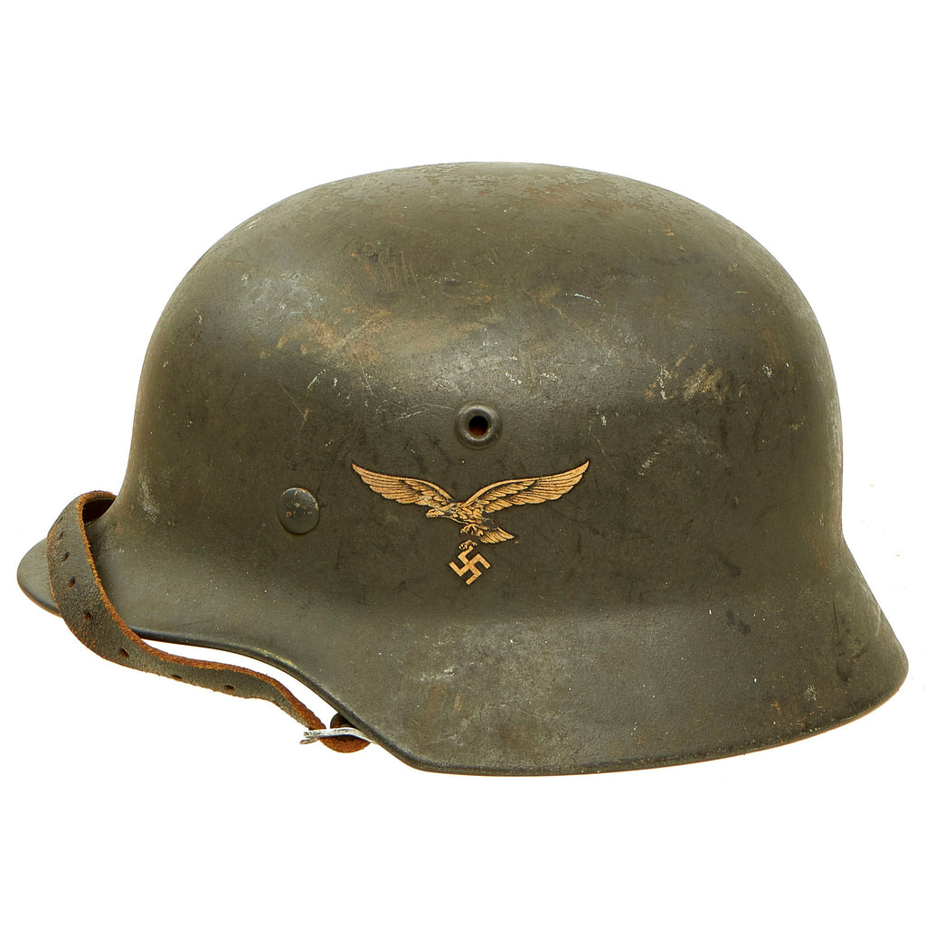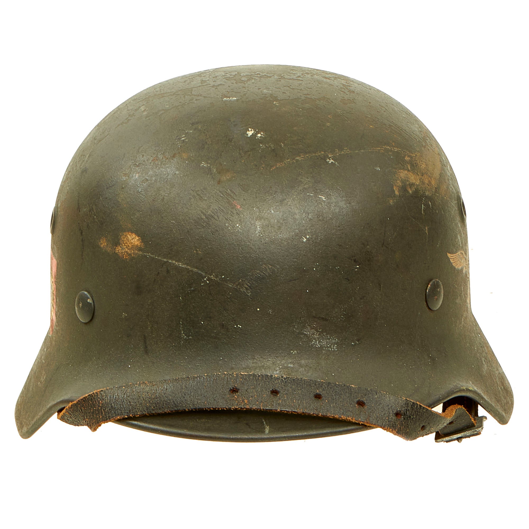 Original Item: Only One Available. This is a very nice all original Model 1940 German WWII "double decal" helmet with a Luftwaffe Eagle decal on the left side, and an "NSDAP Shield" on the right side, as used on Luftwaffe Police helmets. We do not see any signs that it ever had other decals installed, and this is the first example that we have had with decals in this configuration! The use of the second decal was discontinued in 1940, and in 1943 it was ordered that helmets with the national colors have them removed, so finding a helmet with both still intact is a real treat!