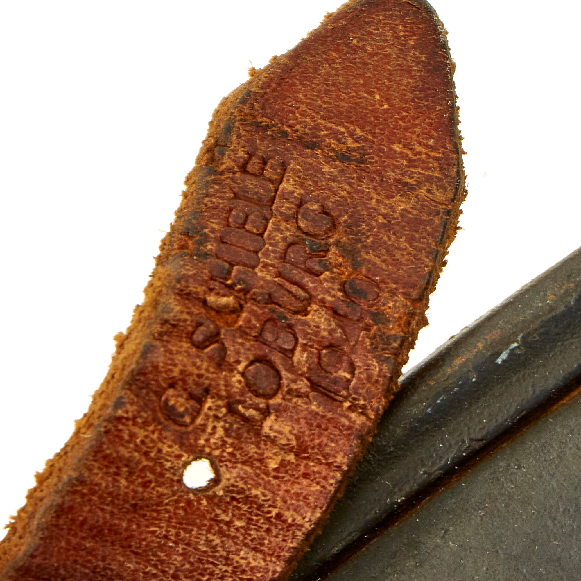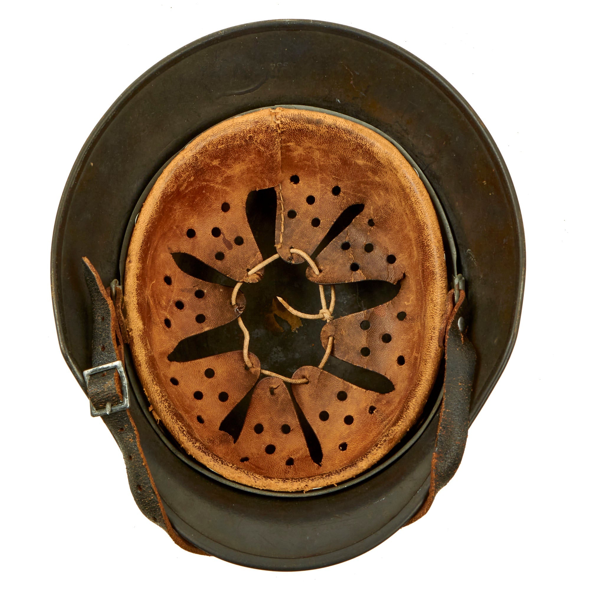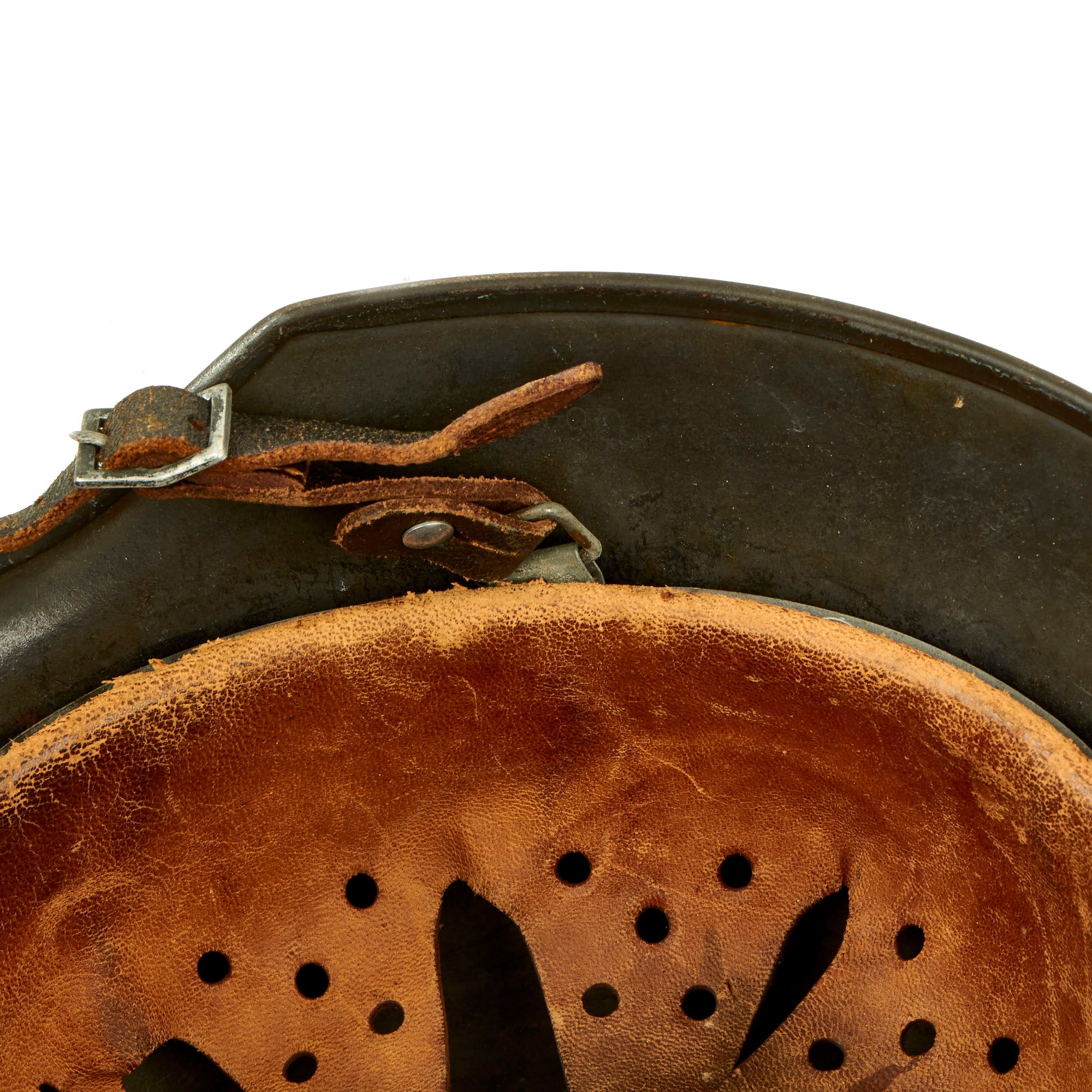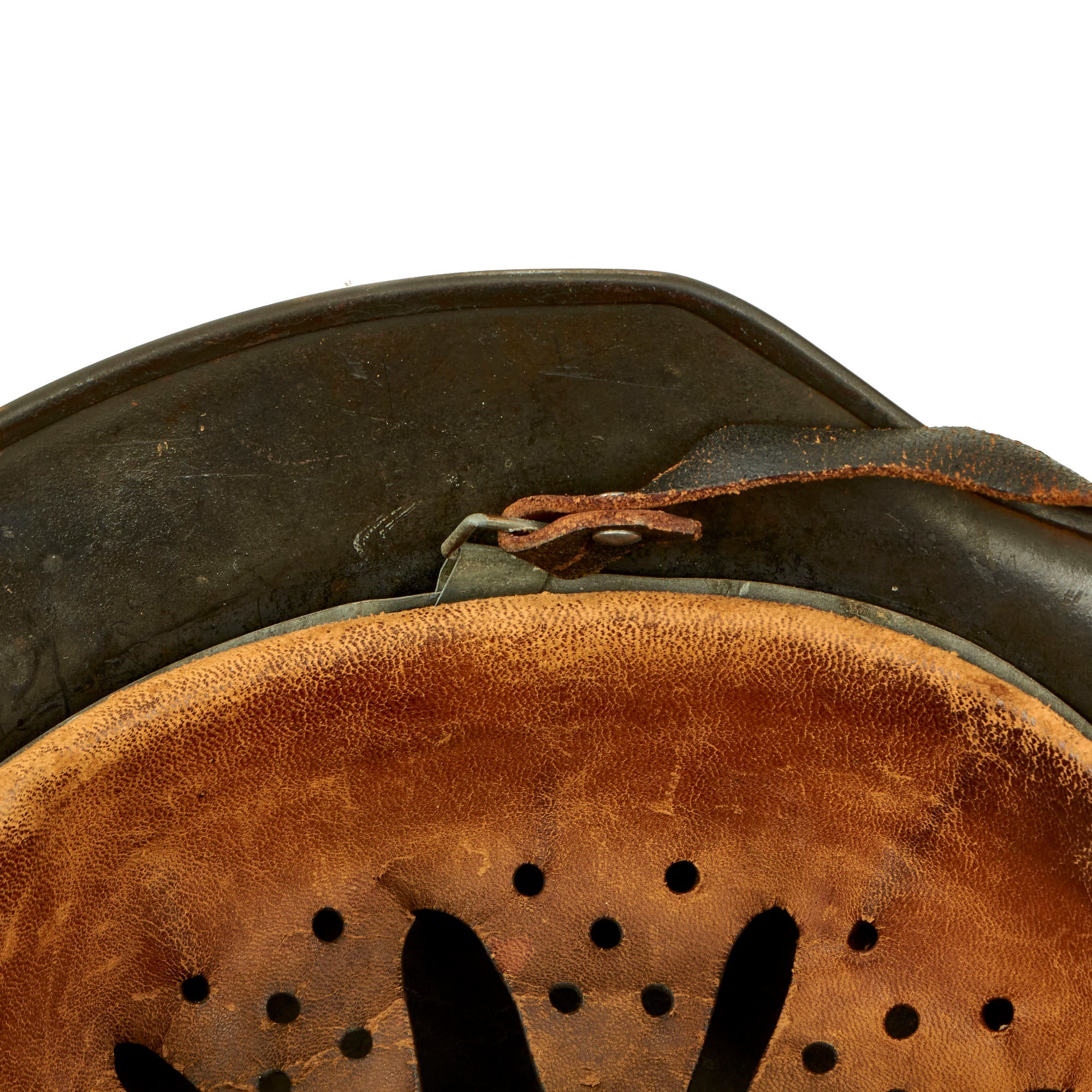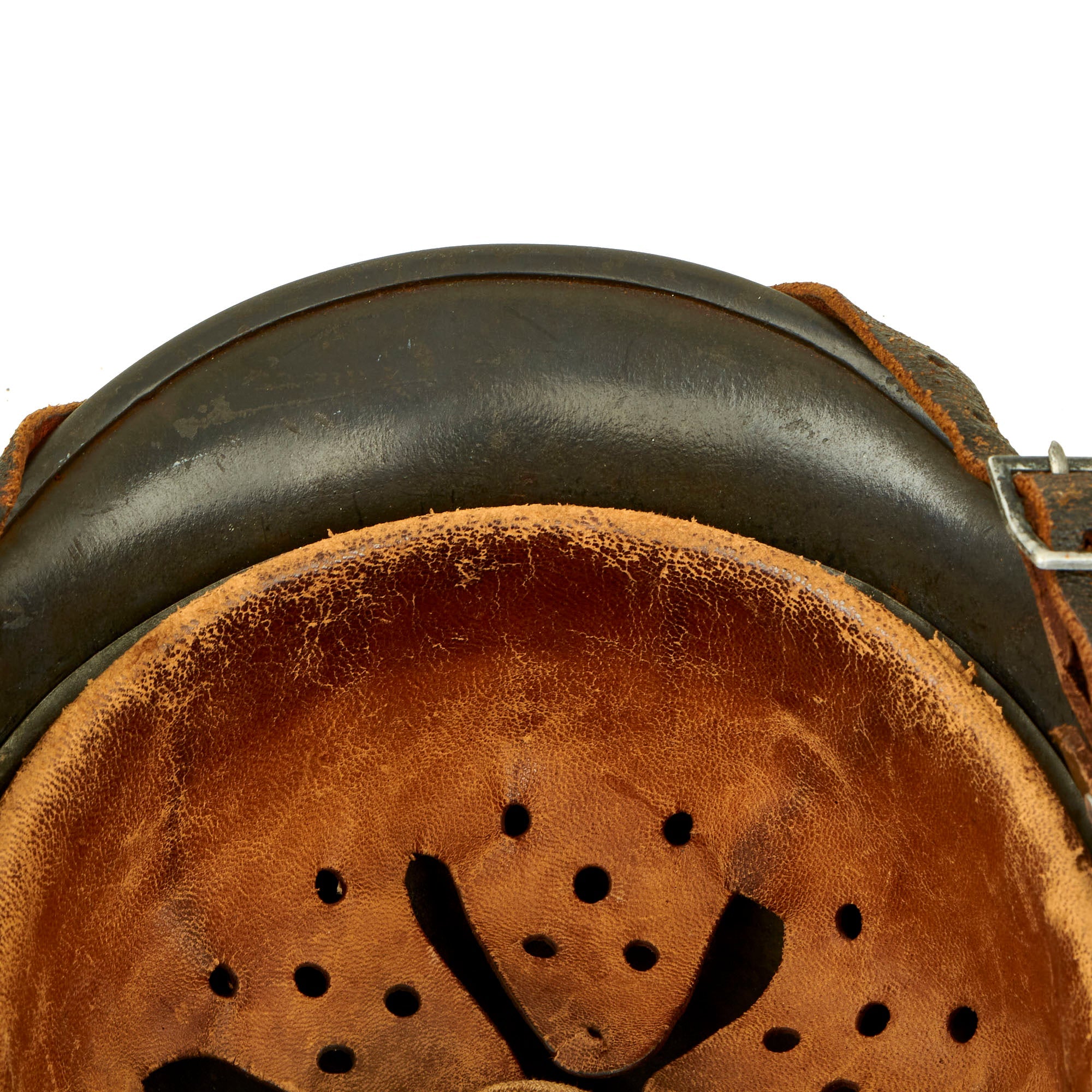 The original chin strap is present and complete, and has an early war aluminum buckle and studs. There is some degradation to the leather, which is a bit dried out, and shows cracking in the finish. It still has a complete manufacturer name and date on the end of the longer side: G. SCHIELE / LOBURG / 1940, which is right in period for this configuration.
