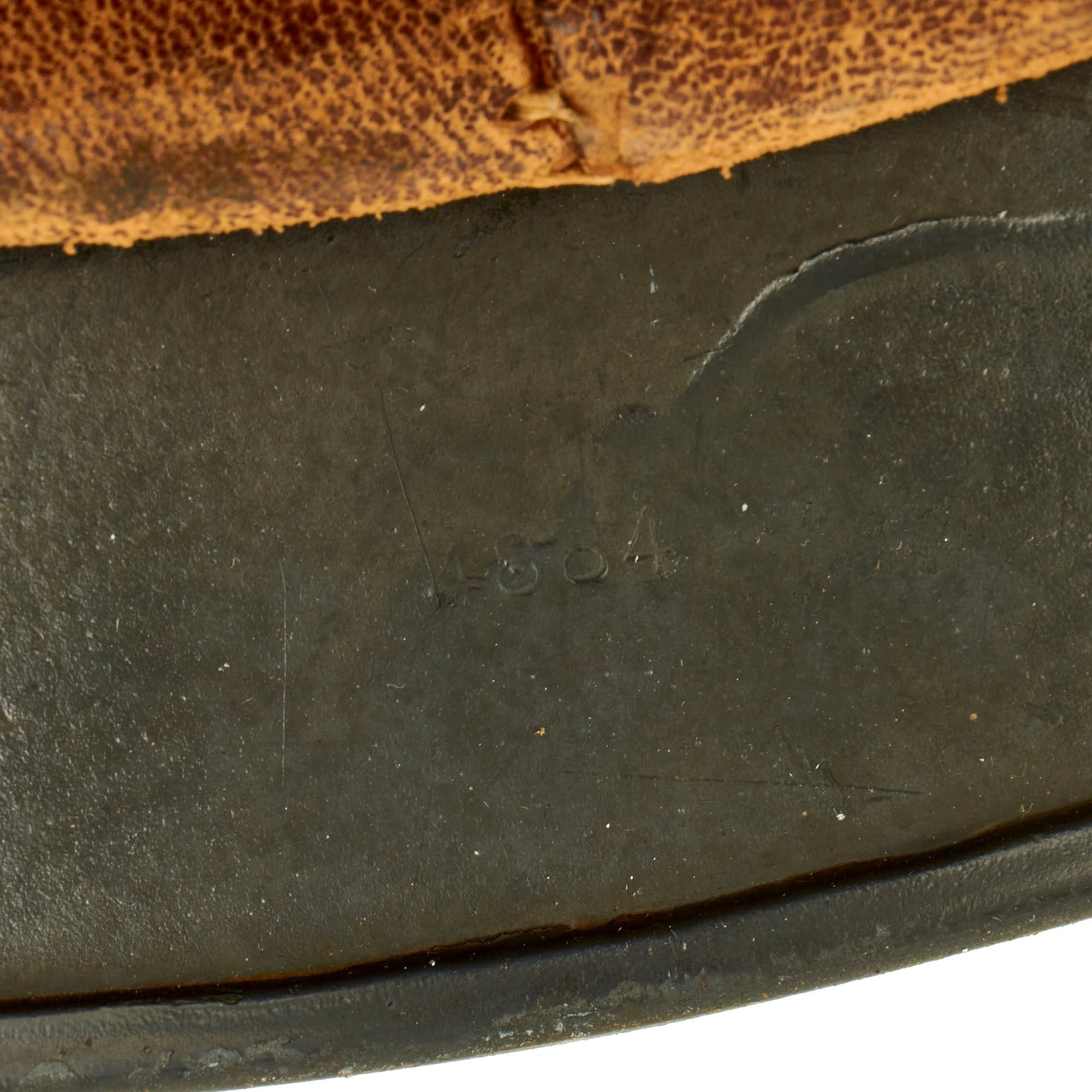 All three original liner retaining pins are intact and in good condition, with the smooth Luftwaffe blue gray paint well retained. The interior of the helmet still has its original leather liner with all 8 fingers intact, though the top tie is missing. The leather has a lovely color and worn look, with some flaking around the edge. The outer side of the galvanized steel liner band over the left ear is marked 64 n.A / 57, indicating that this is a size 57 liner for a size 64 shell. The right side displays the full manufacture information, as well as a date, which are very faint: