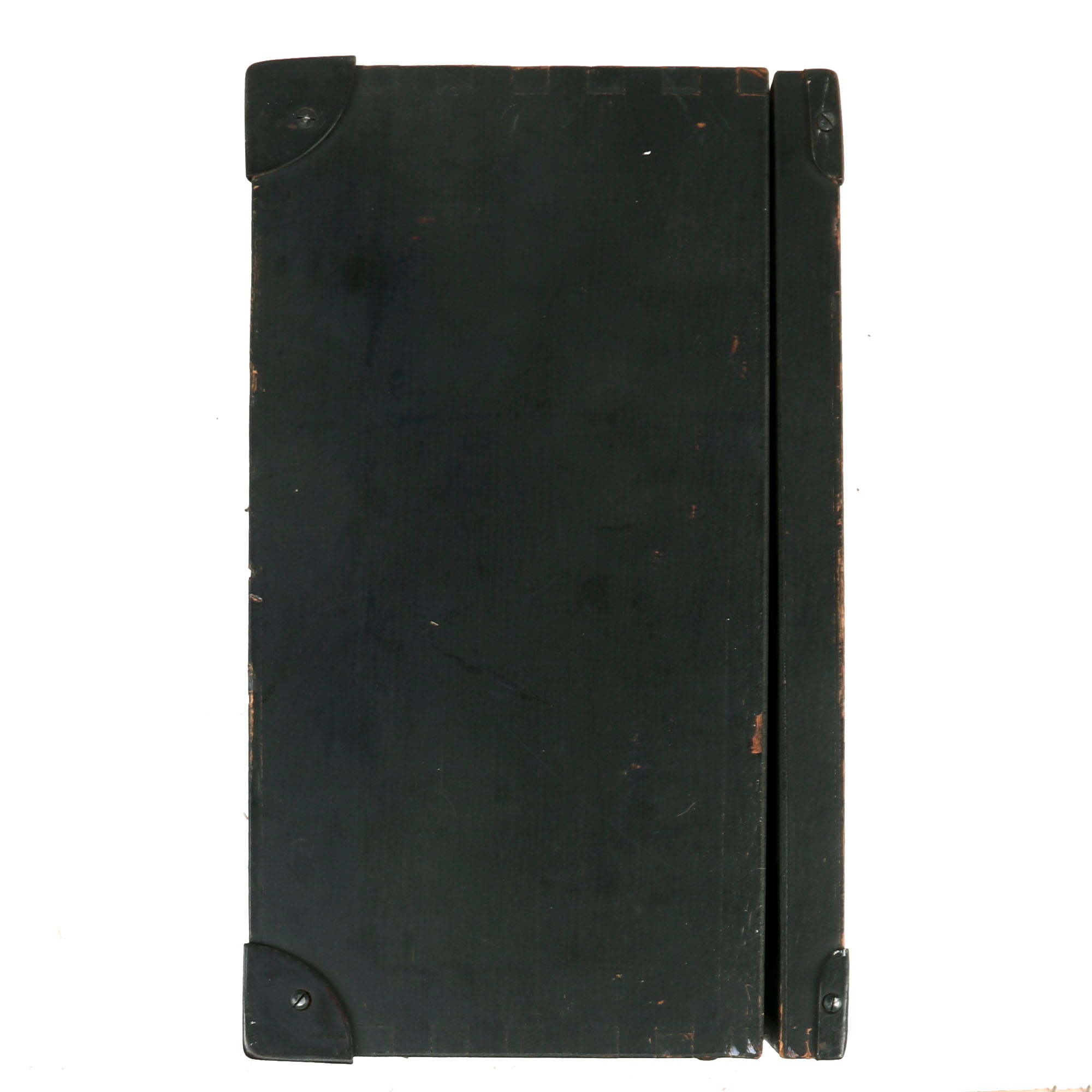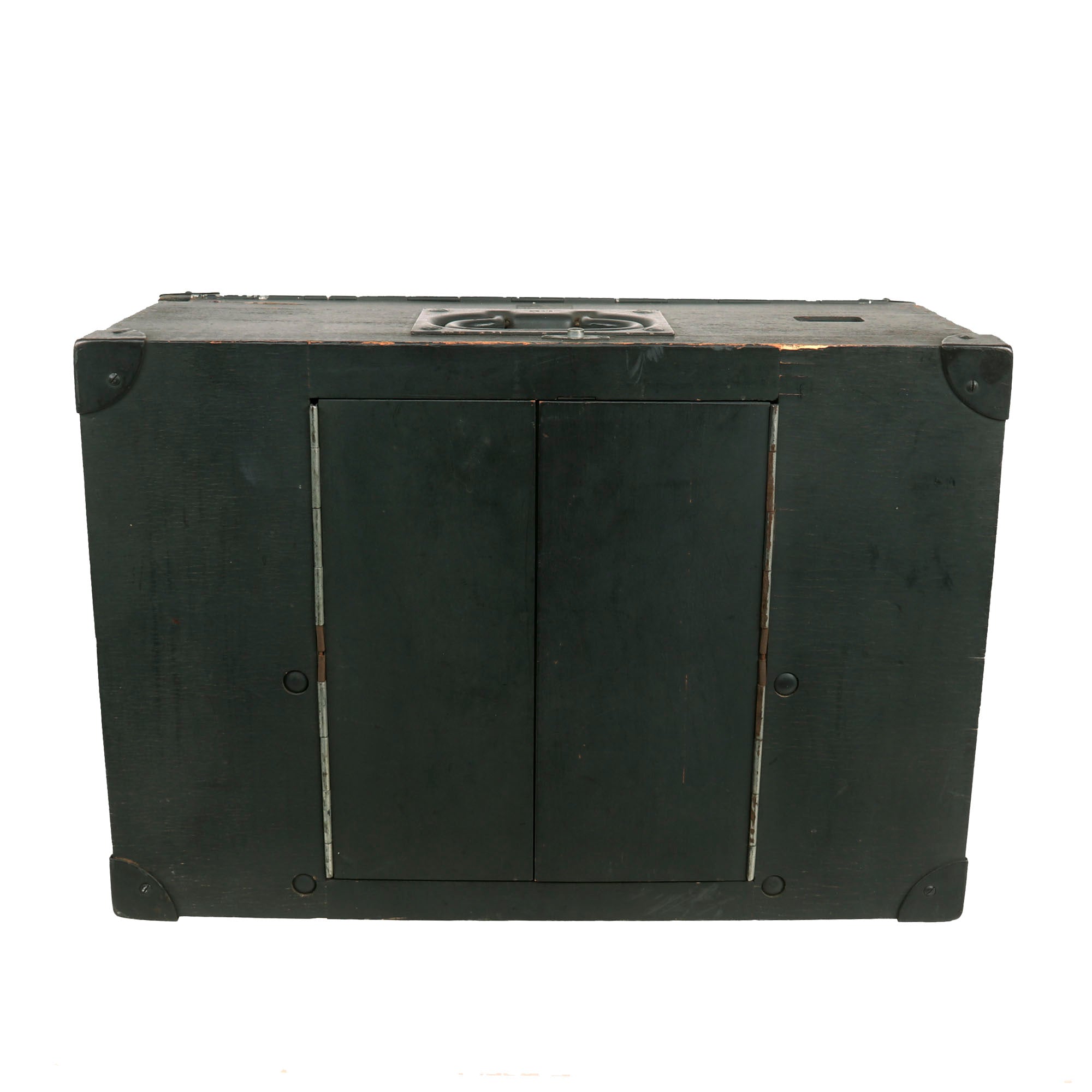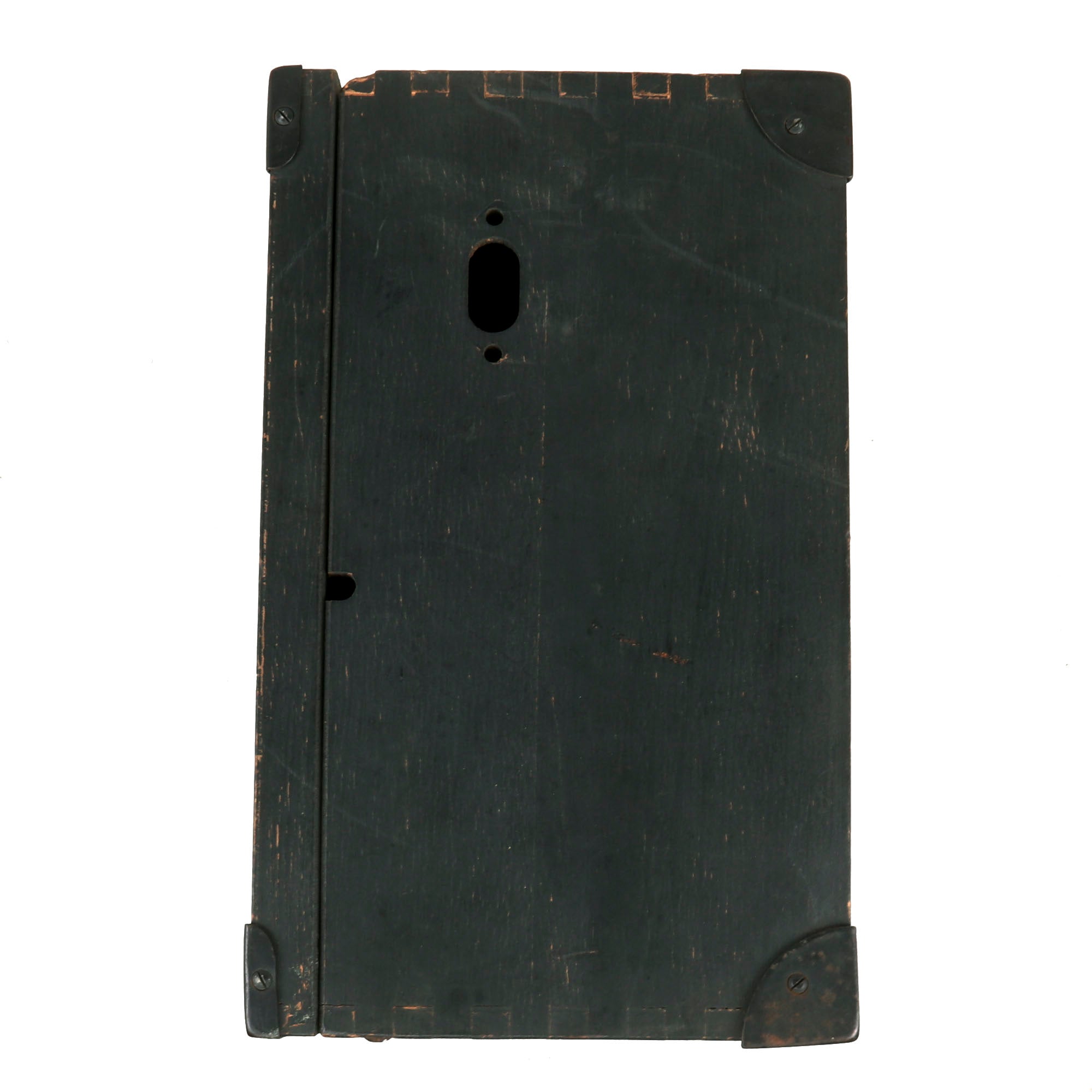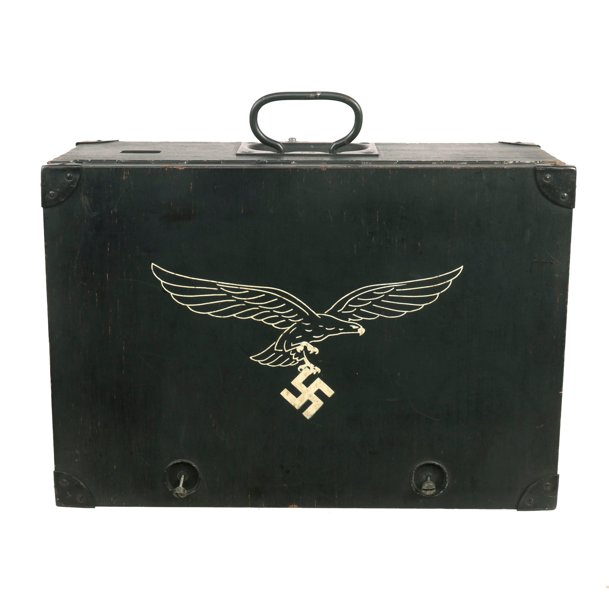 It measures 12 1/8" tall x 17 3/4" wide x 7 1/4" deep. It still retains the original deep grey/blue Luftwaffe paints over multi-panel hardwood construction, with mortised corner joints, and molded black Bakelite and metal fittings.