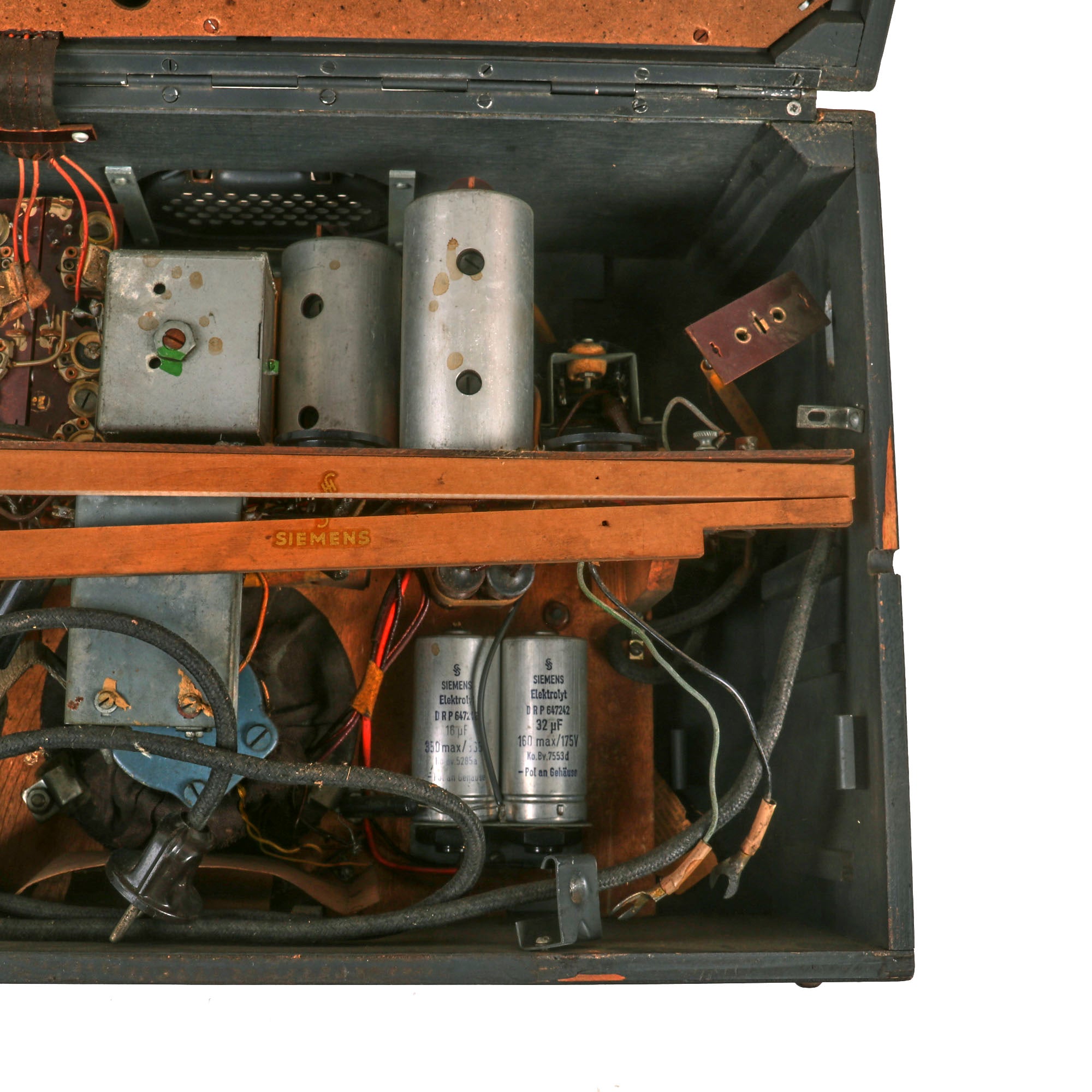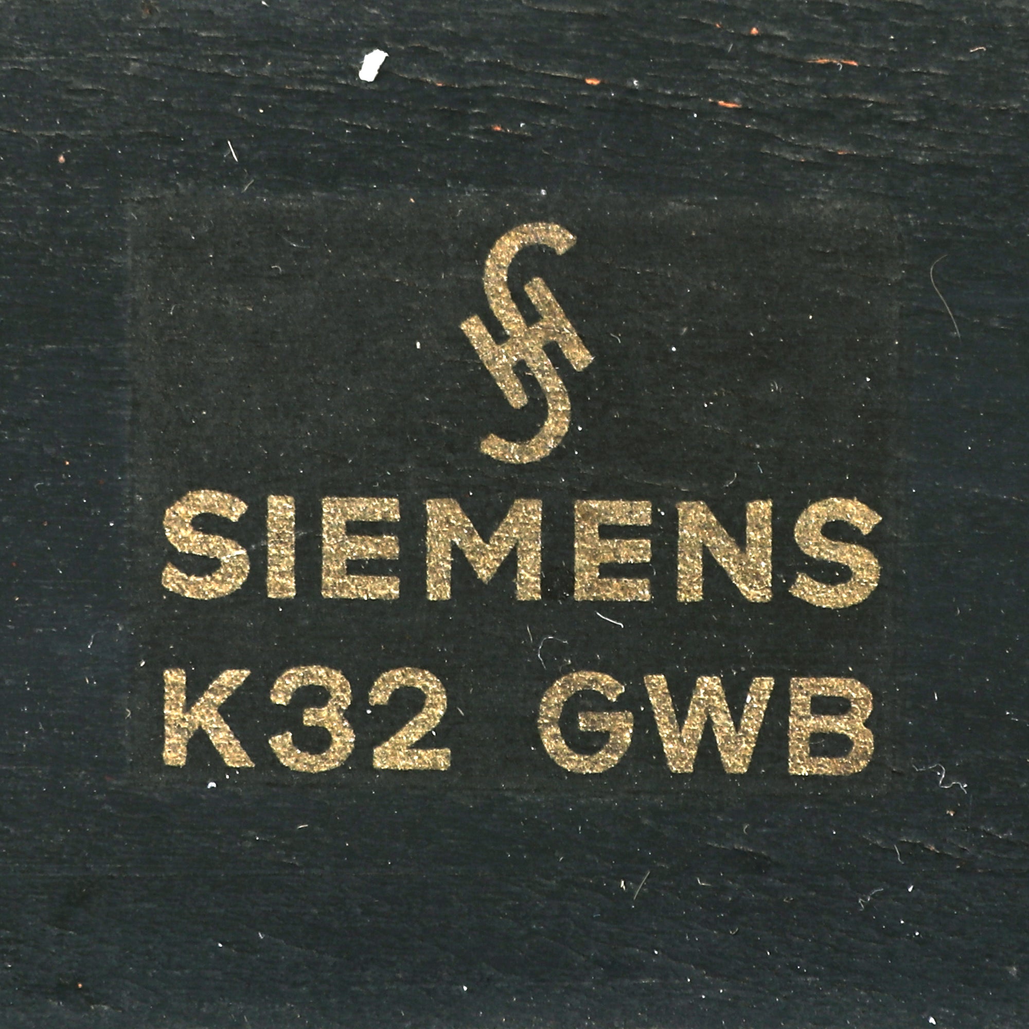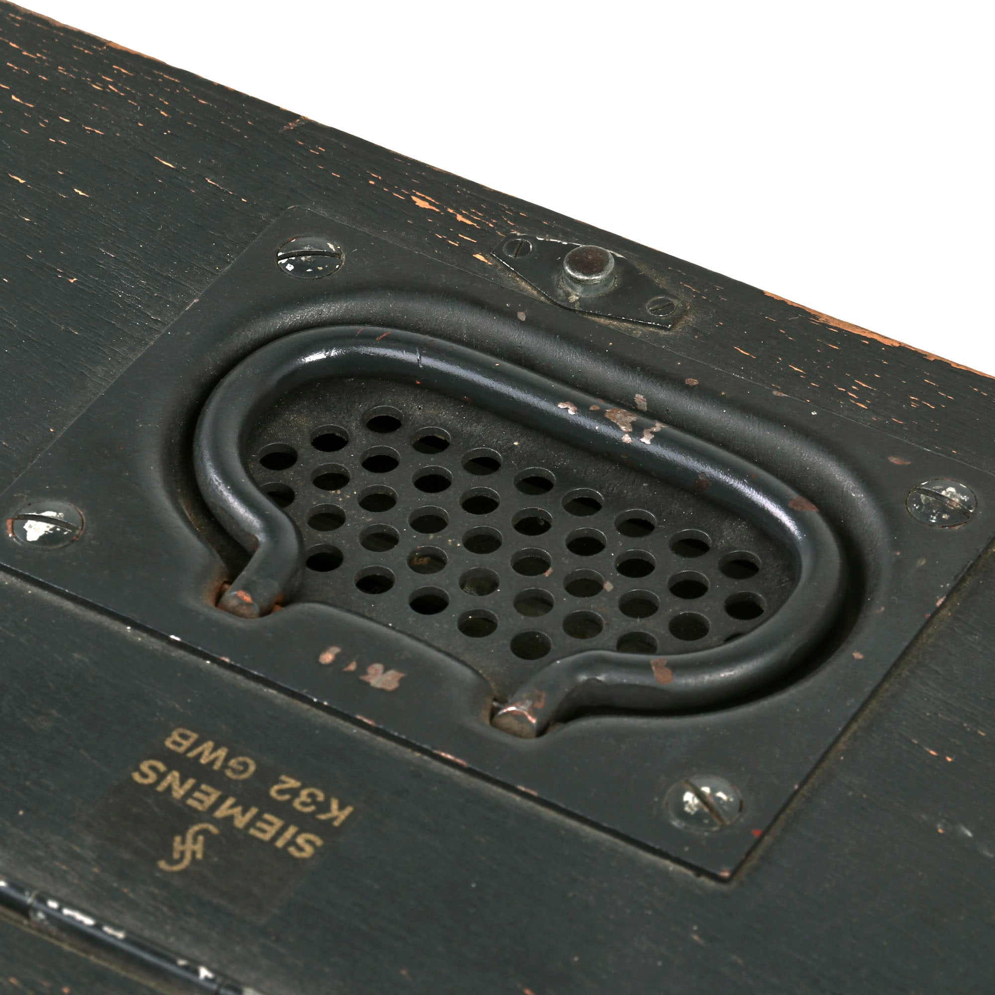 This is a nice example of one of these early Luftwaffe radios, which are very rare. This is a Siemens model K32 GWB barracks radio, with long and short wave capabilities. It is marked with serial number 2319 by the top handle, and was most likely manufactured for the Luftwaffe in 1942 based on the data labels. It appears to be complete, with internals minus batteries, plus instructions on internal reverse side door. It has a Super-Heterodyne IF-Frequency of 468khz, 6 AM tuned circuits, moving coil dynamic speaker, and ability to be powered by battery or wall outlet.