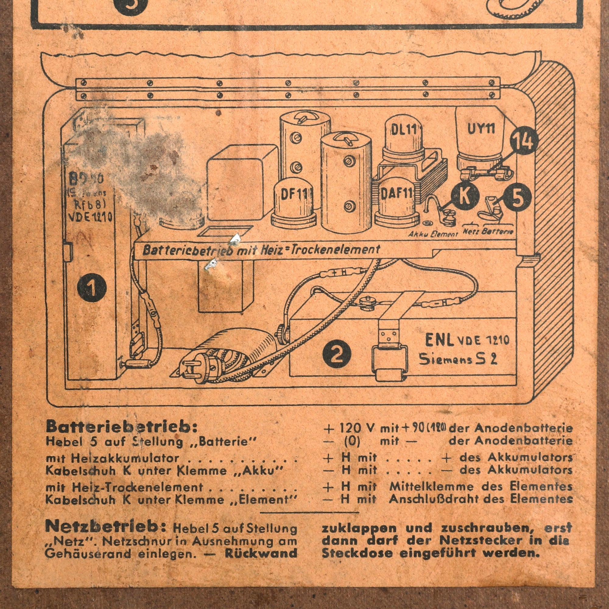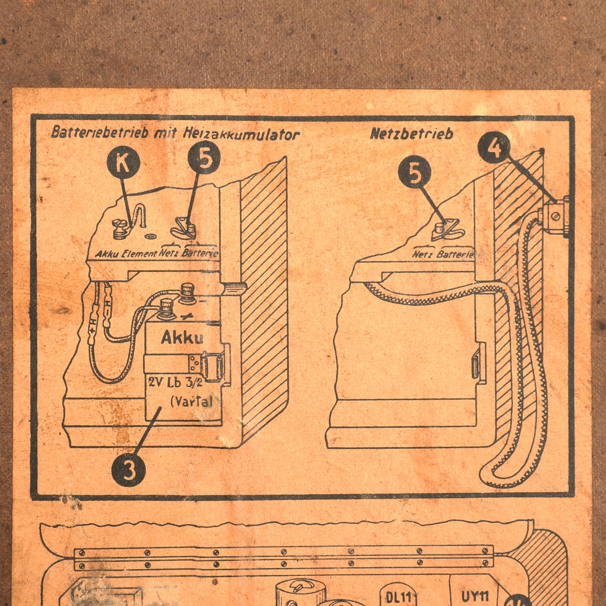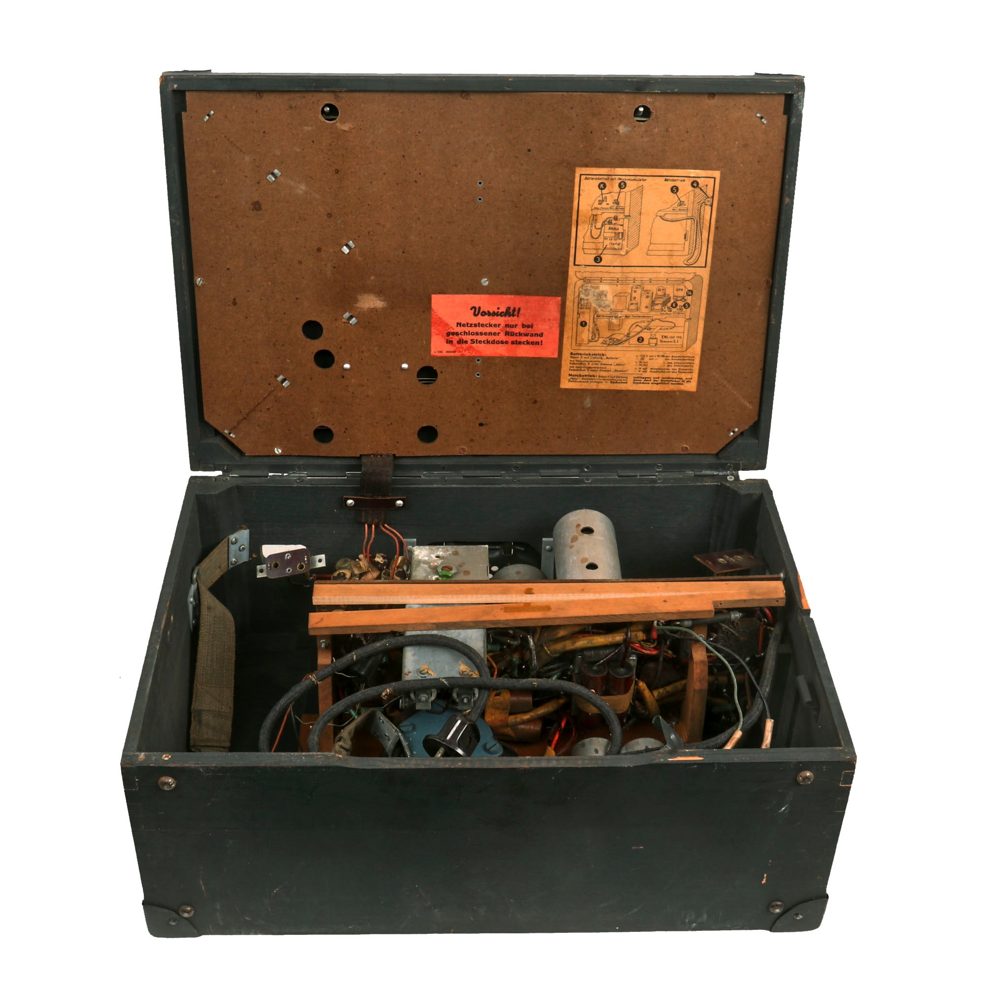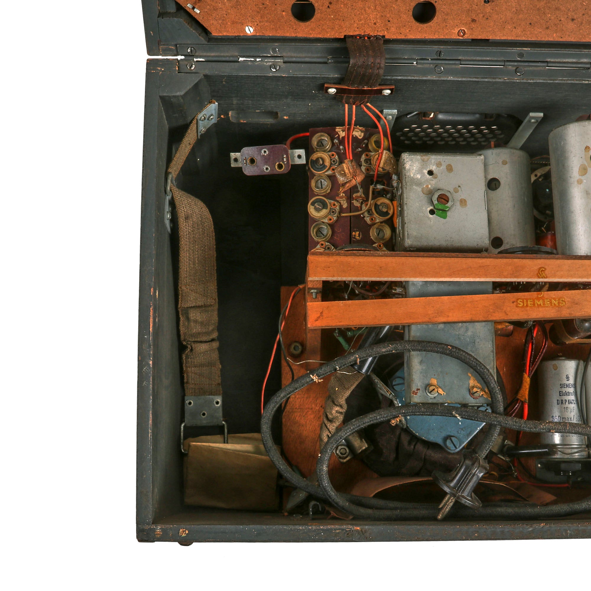 This is a nice example of one of these early Luftwaffe radios, which are very rare. This is a Siemens model K32 GWB barracks radio, with long and short wave capabilities. It is marked with serial number 2319 by the top handle, and was most likely manufactured for the Luftwaffe in 1942 based on the data labels. It appears to be complete, with internals minus batteries, plus instructions on internal reverse side door. It has a Super-Heterodyne IF-Frequency of 468khz, 6 AM tuned circuits, moving coil dynamic speaker, and ability to be powered by battery or wall outlet.