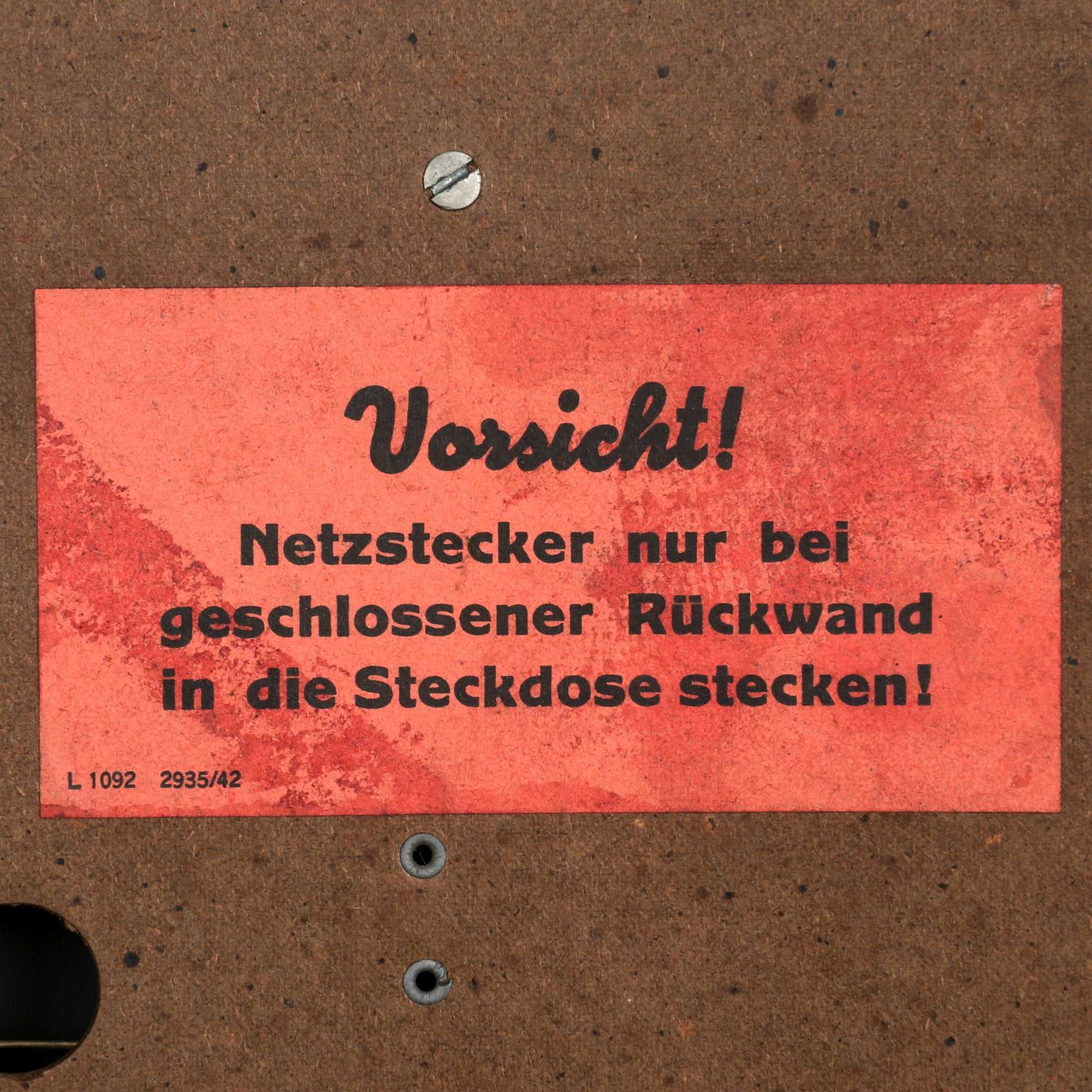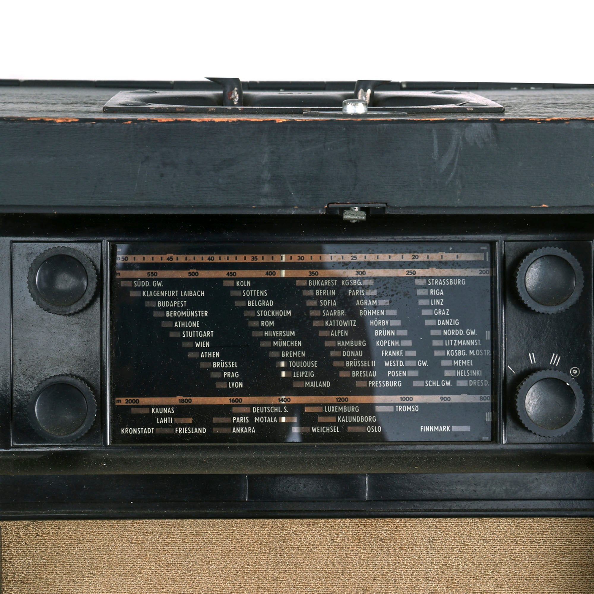 The cabinet is in good condition with some damage to the paint and wood due to age and wear. There are a few chips out of the wood. The doors function: press the release button and two spring-loaded doors open, revealing the control panel. However, either the springs are weak or the hinges are stiff, as they need "help" to open fully. The cabinet has 3 white Luftwaffe eagles with swass, which are quite crisp, showing only light wear. The fabric covering the speaker is perfect (often torn or stained) and the rear panel opens with little effort to examine the interior. Original power cord is still present with the correct German style plug.