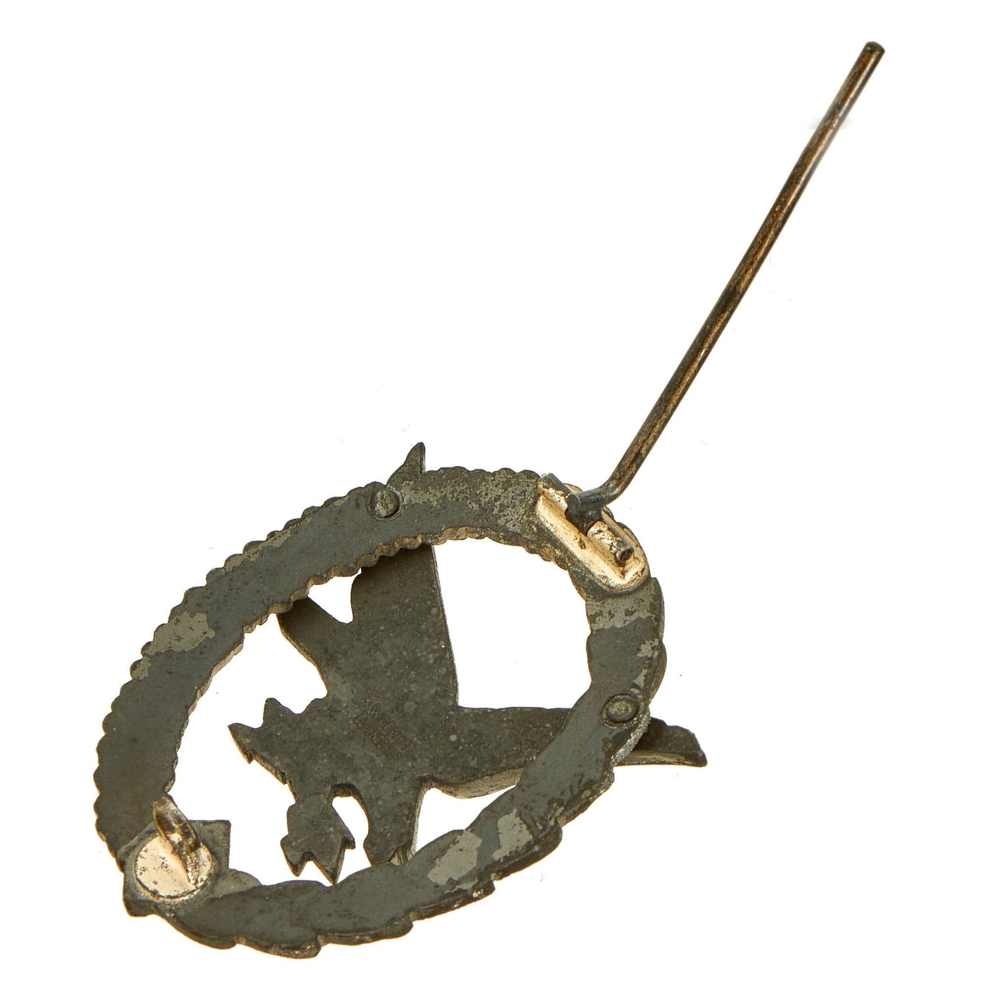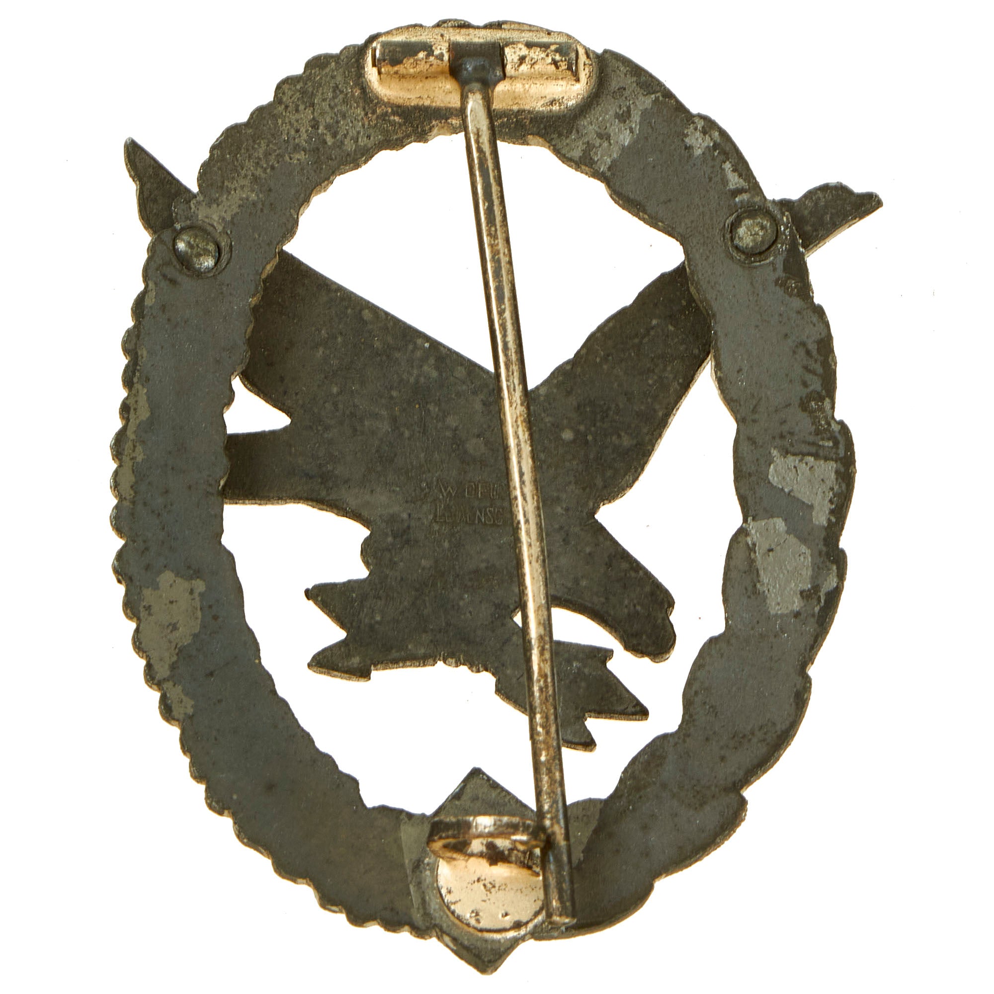 Original Item: Only One Available. The Radio Operator & Air Gunner's Badge (Fliegerschützenabzeichen für Bordfunker) is a commonly accepted title for the Luftwaffen-Fliegerschützen-Bordfunker-und Bordmechanikerabzeichen (Combined Air Gunner, Radio Operator and Flight Engineer Badge). It was a German military decoration awarded to radio operators, air gunners and mechanics (flight engineers) who were members of the German Air Force (Luftwaffe) after they completed two months training or had taken part in at least five operational flights. If wounded during an operational flight, the badge could be awarded and worn earlier. Later in June 1942, a separate badge was introduced for air gunners and flight engineers. That badge had the same qualifications, and was identical, except that the eagle is not clutching lightning bolts.