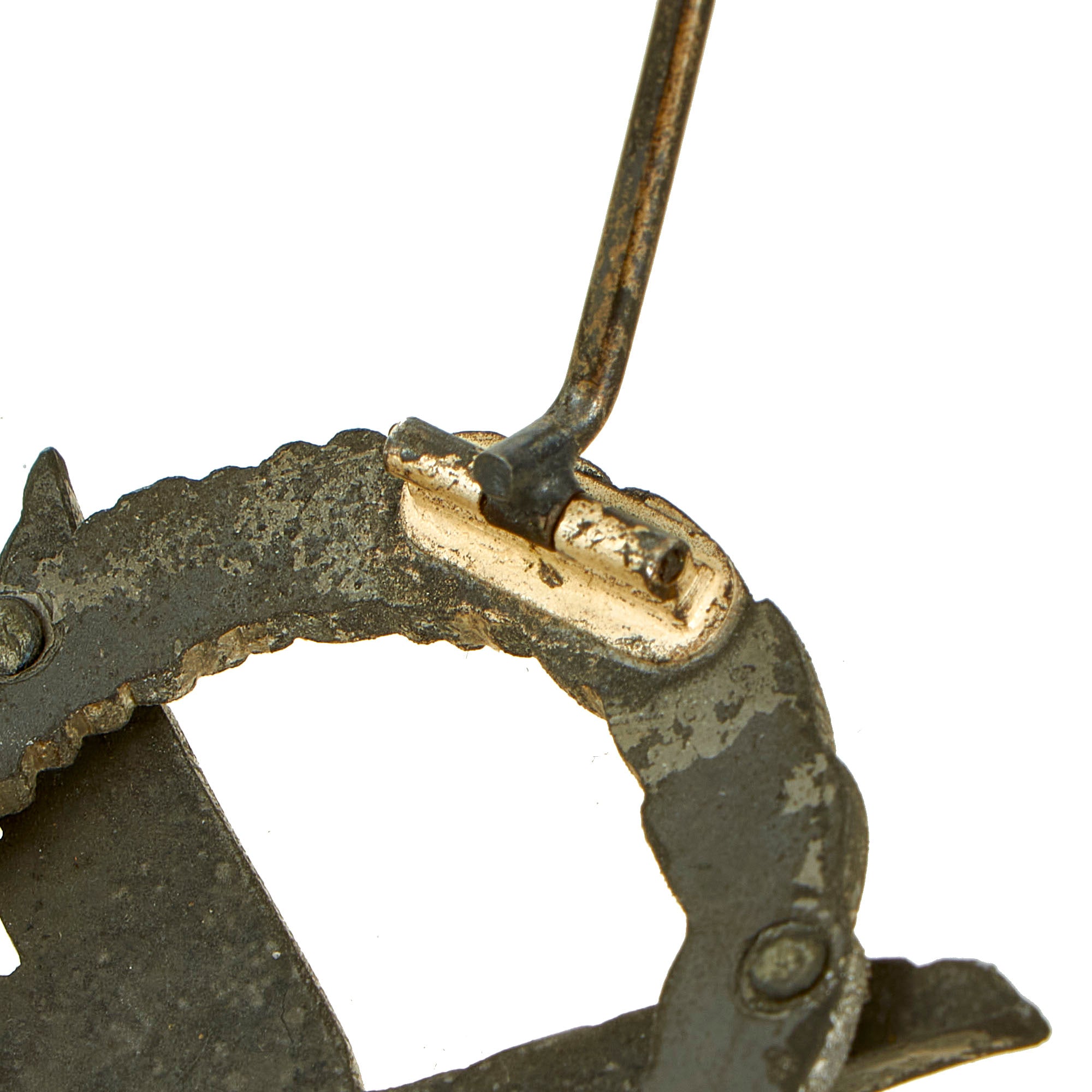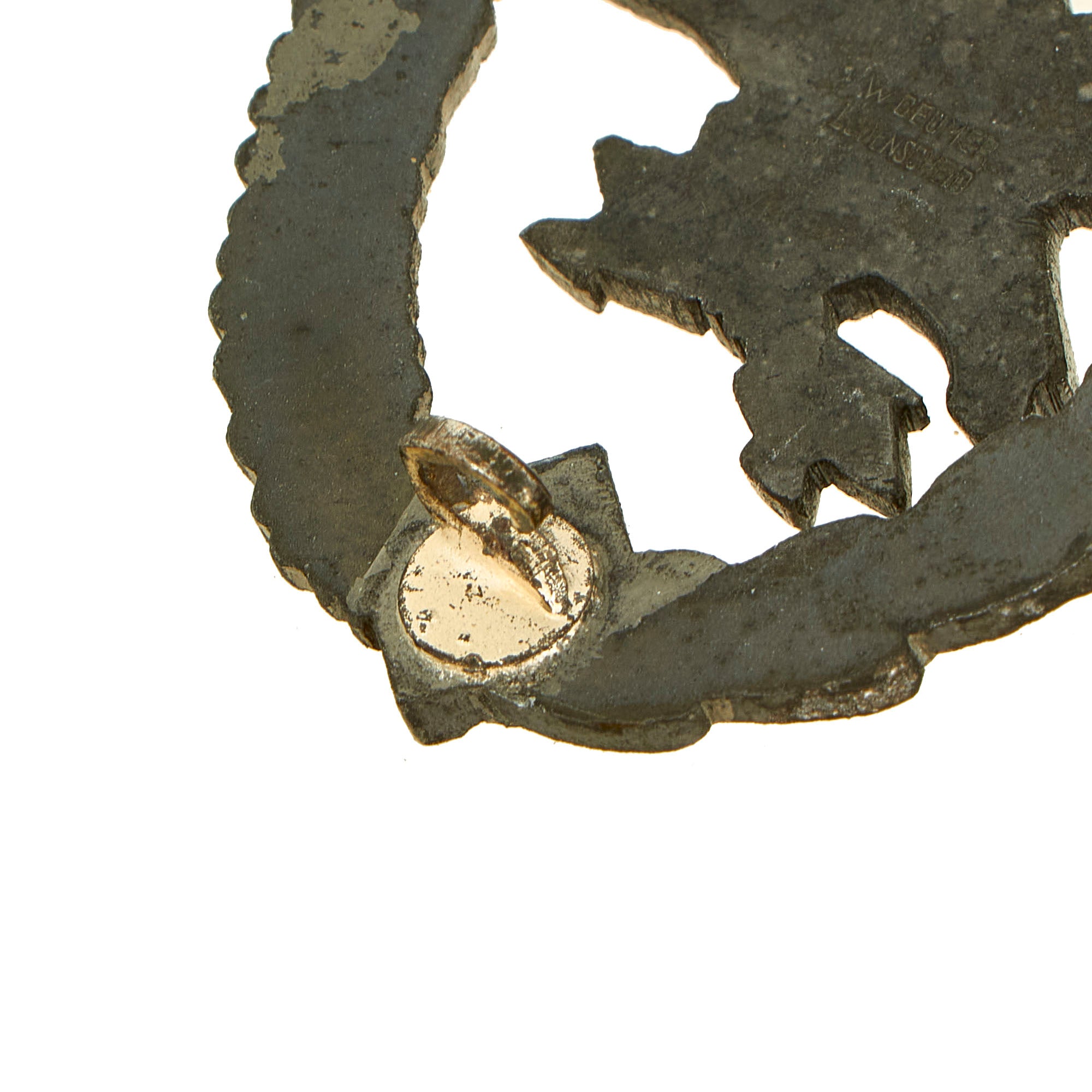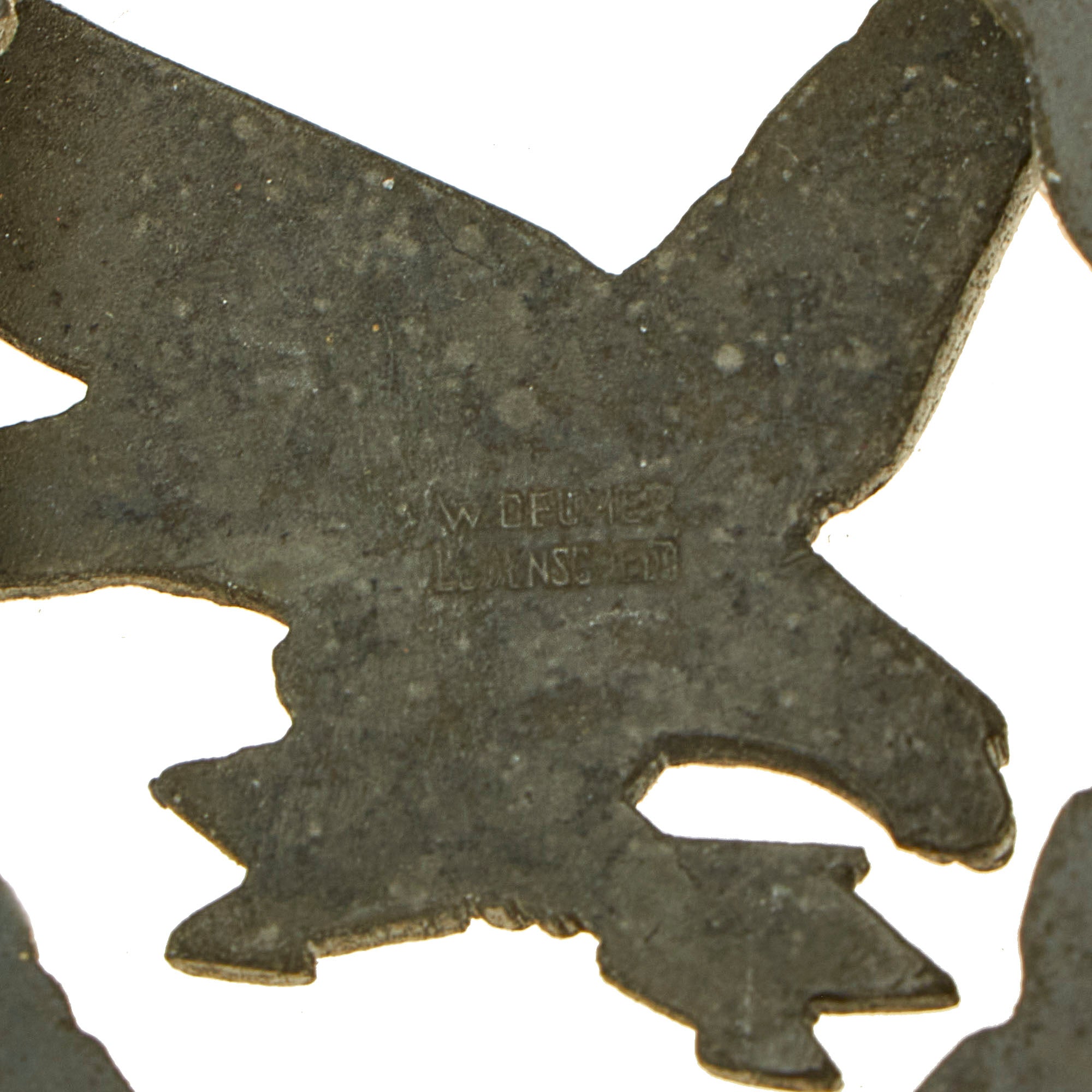 This example looks to be manufactured from mid-war zinc alloy. The obverse of the badge consists of a half oak half laurel wreath with a mobile swas (hook cross) at the base, with an an "in flight eagle" superimposed on the badge holding lightning bolts in it's talons. The reverse plain, with a vertical pin, a barrel hinge, and a flat wire catch. The back of the eagle is maker marked with W. DEUMER / LÜDENSCHEID, for Wilhelm Deumer of Lüdenscheid, a famous maker of medals, belt buckles, buttons, and other accoutrements.