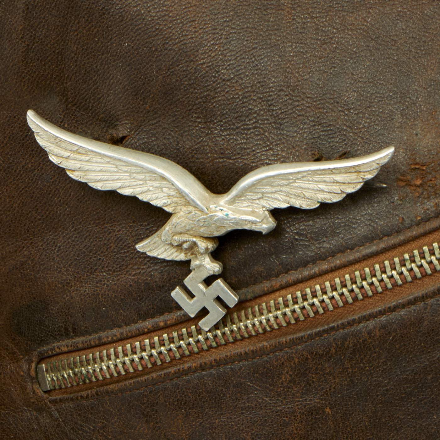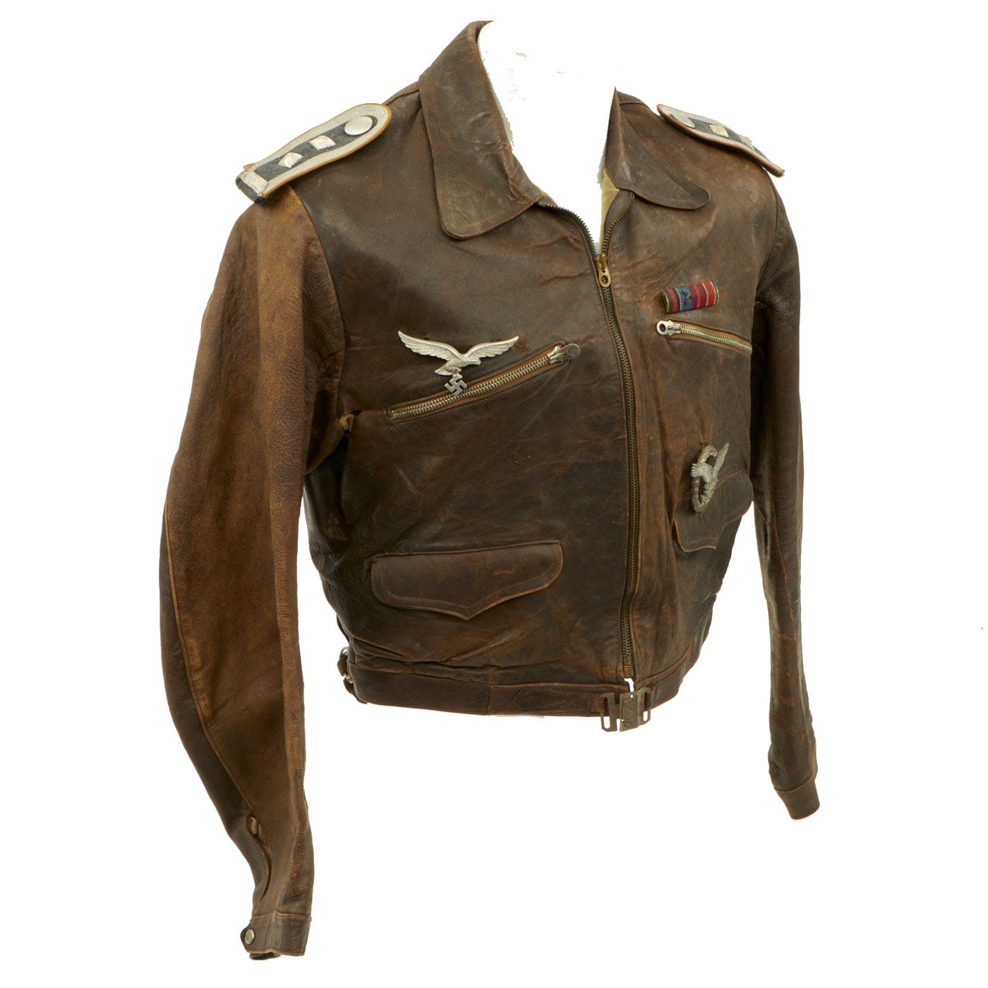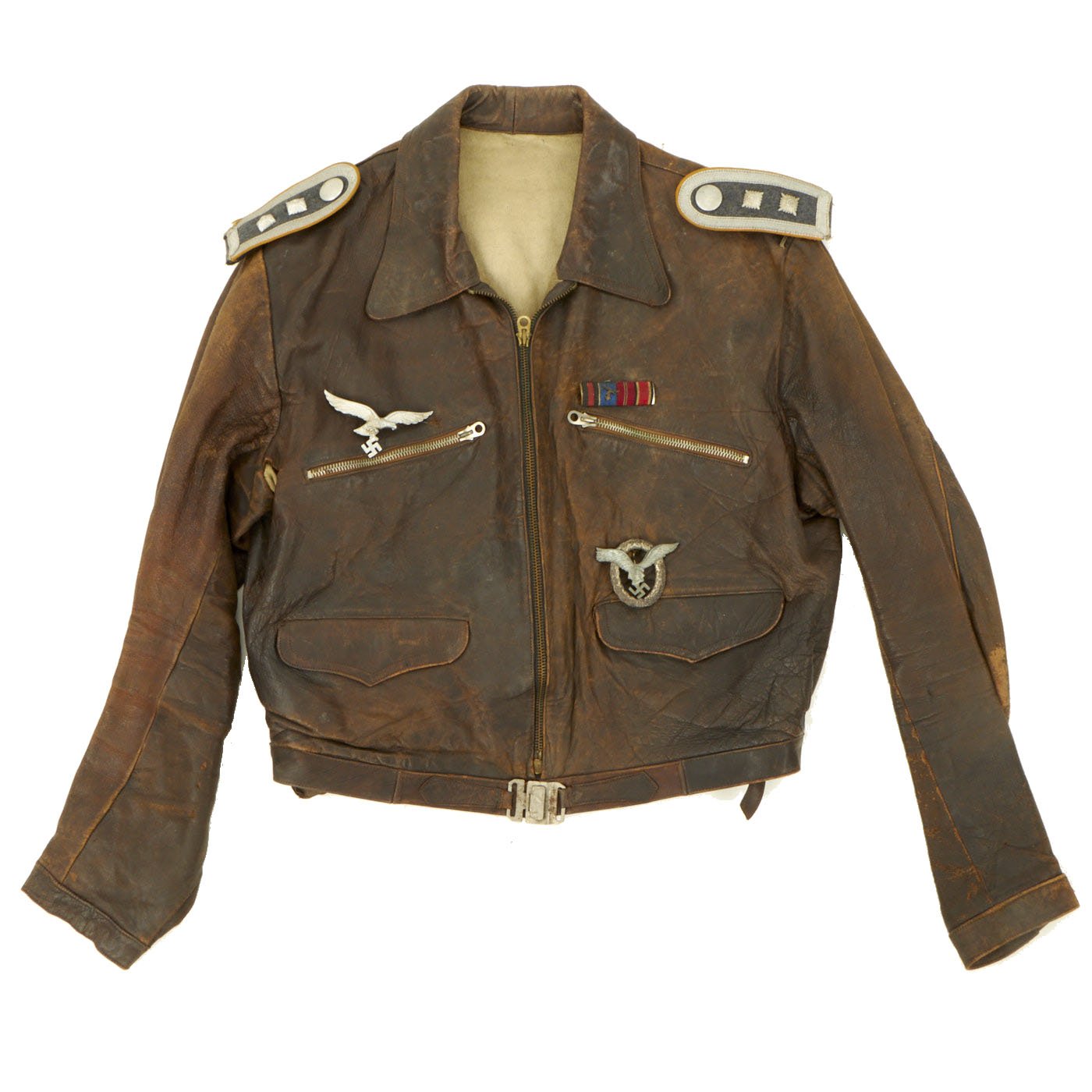 This example is a high quality, French made private purchase, non-regulation, milk chocolate brown leather construction fully lined. Features two zipper pockets with ECLAIR zips and two flap pockets on front. All zippers function well. Correct senior NCO Fahnenjunker-Oberfeldwebel shoulder boards and pin back breast eagle. Complete with Luftwaffe pilot badge and medal ribbon bar. Overall offered in very good condition.