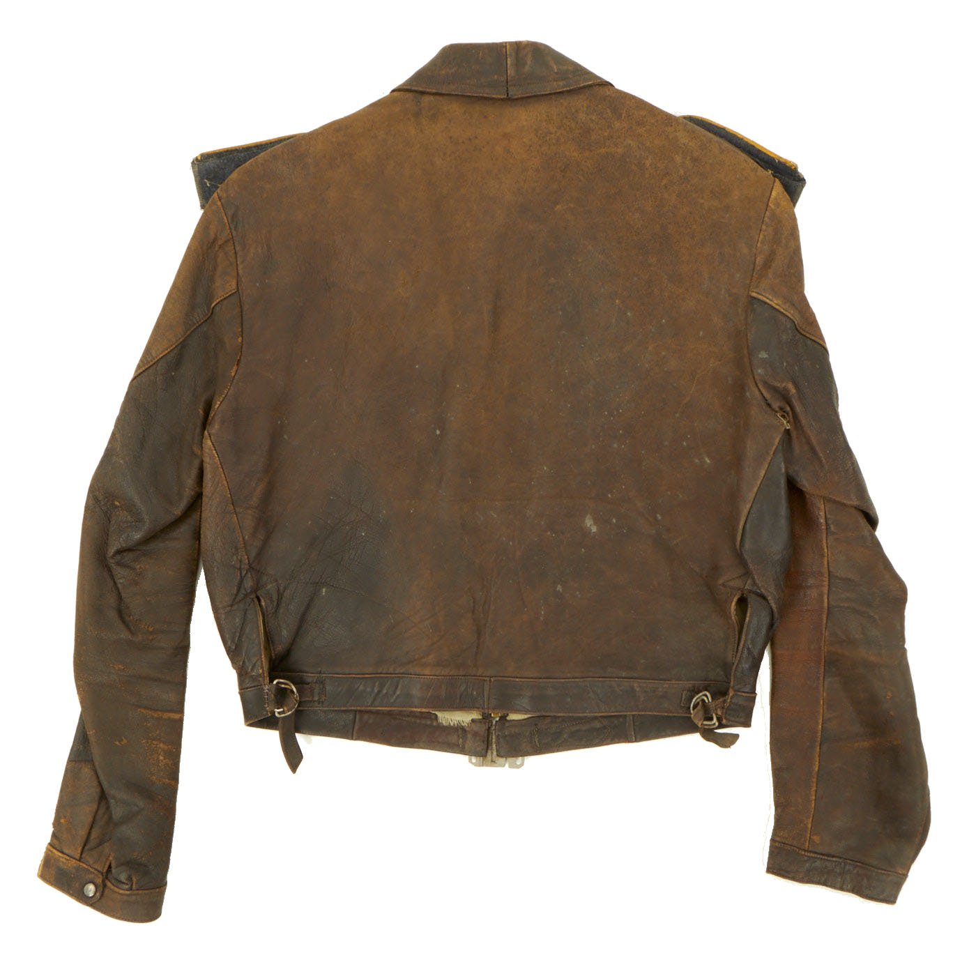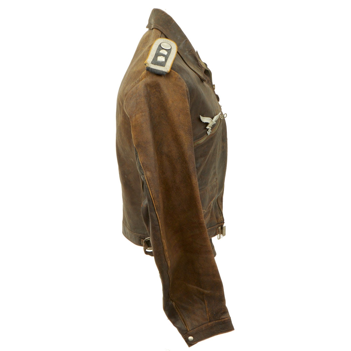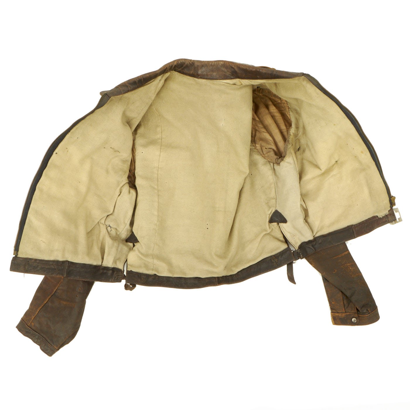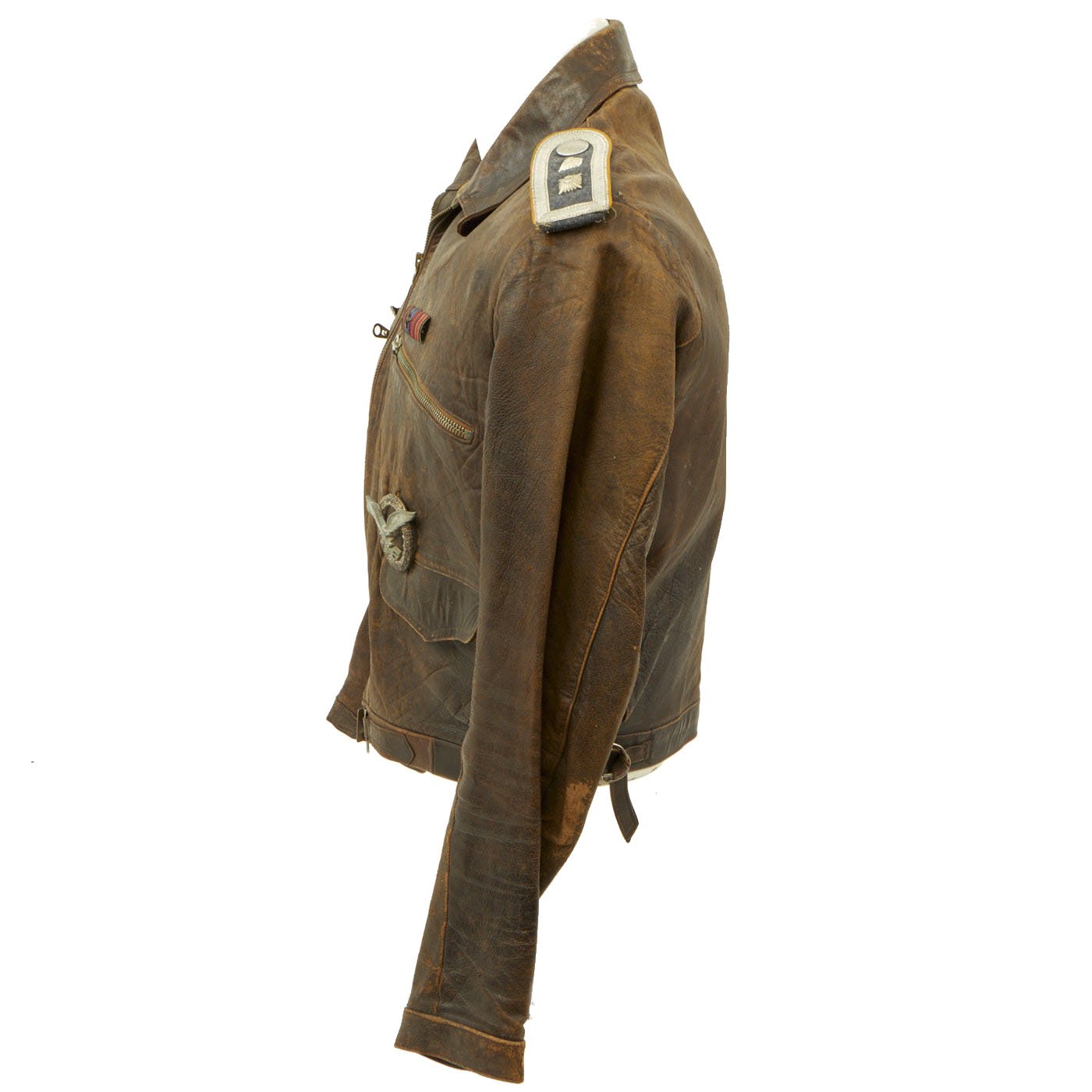 This example is a high quality, French made private purchase, non-regulation, milk chocolate brown leather construction fully lined. Features two zipper pockets with ECLAIR zips and two flap pockets on front. All zippers function well. Correct senior NCO Fahnenjunker-Oberfeldwebel shoulder boards and pin back breast eagle. Complete with Luftwaffe pilot badge and medal ribbon bar. Overall offered in very good condition.