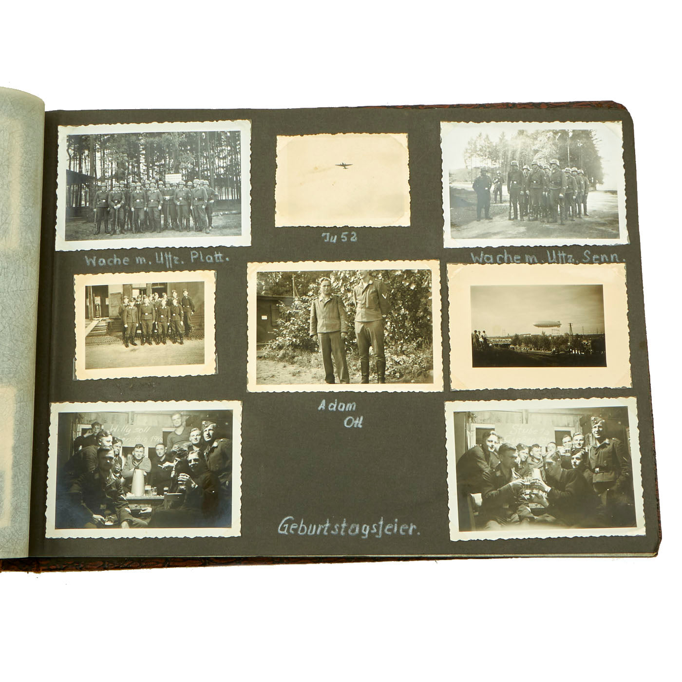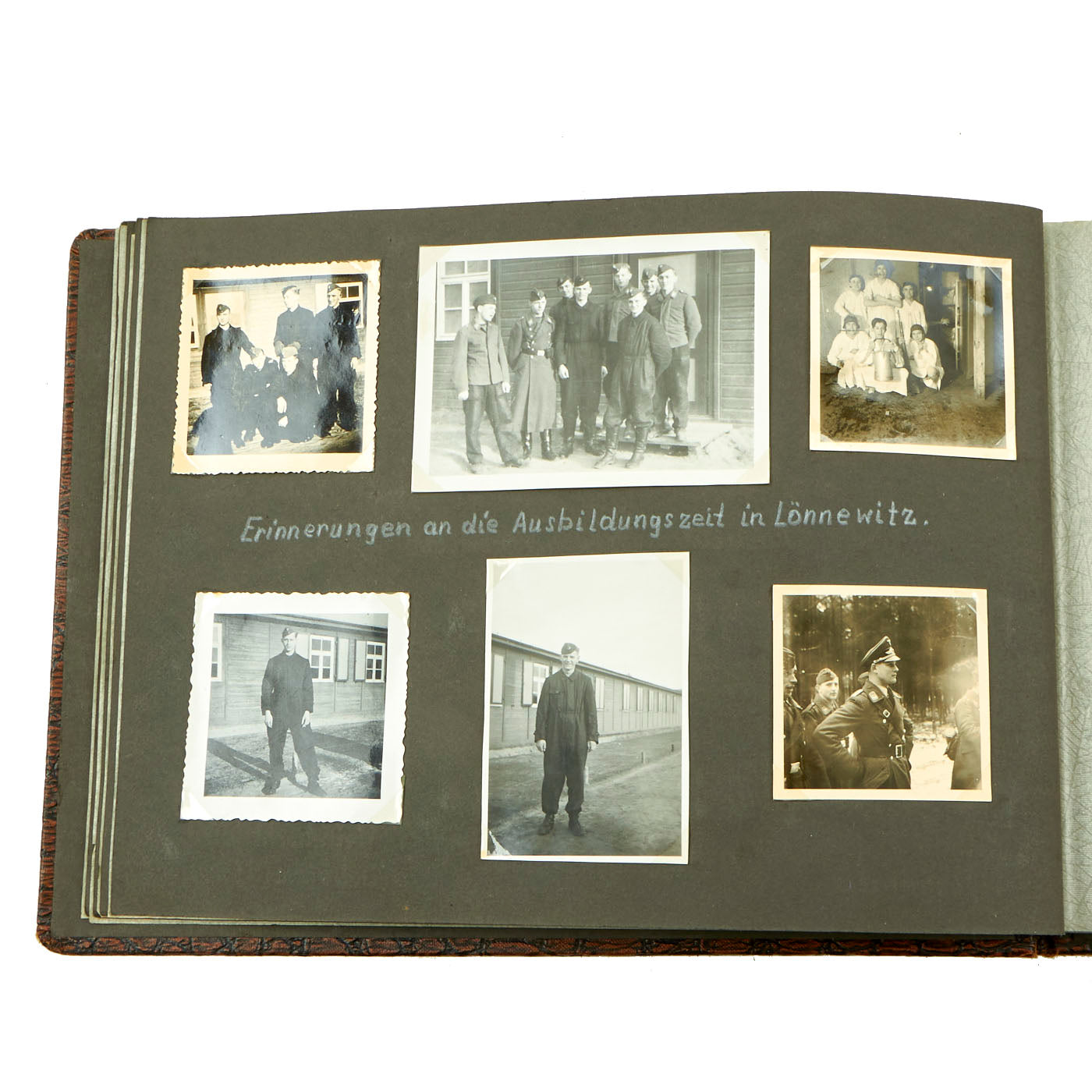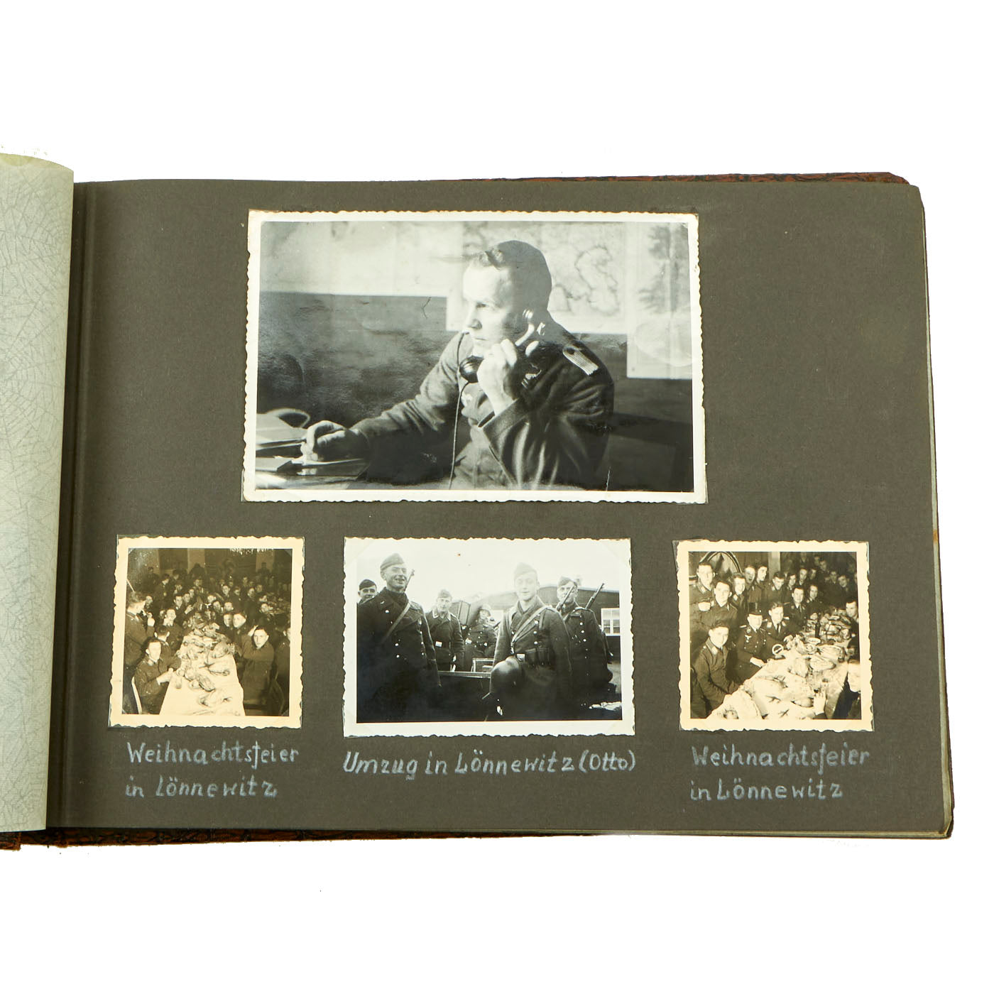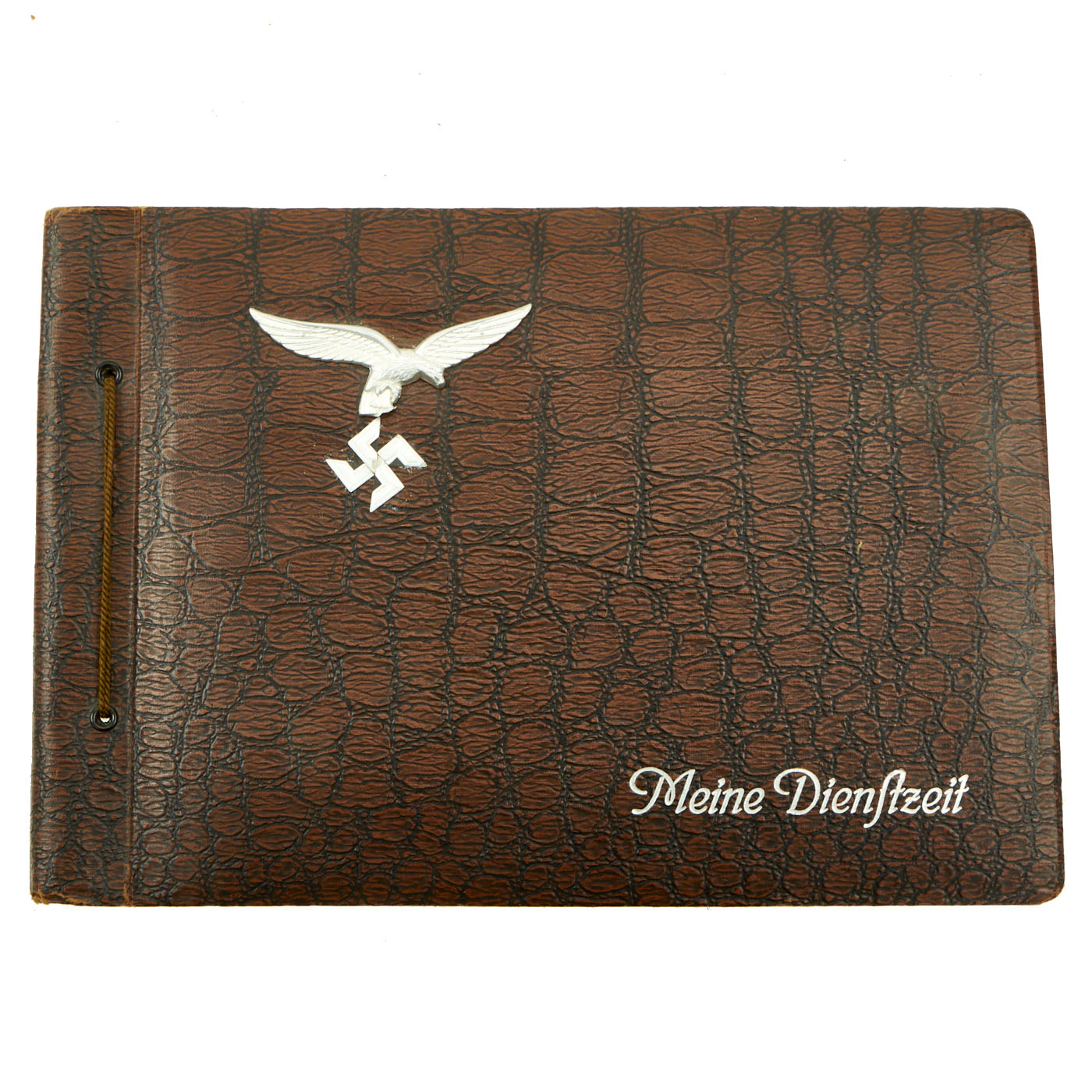 Original Item: One-Of-A-Kind. A wonderful personal photo album with some professional shots as well as personal snapshots, some of which have military aircraft and Luftwaffe officers. All photos are held in place with period corner tabs. Front cover features a silver embossed Meine Dienstzeit (My Service Time) and Luftwaffe Eagle cap badge with silver corner tabs replacing the Swas.