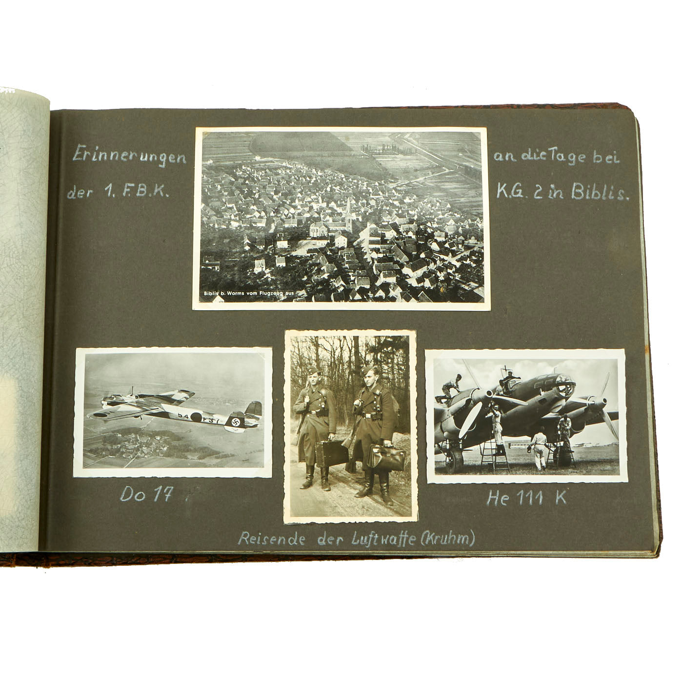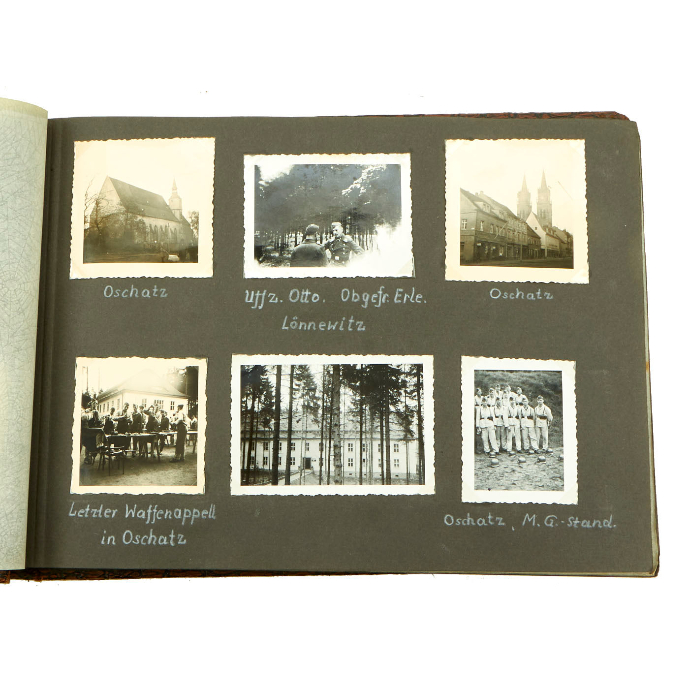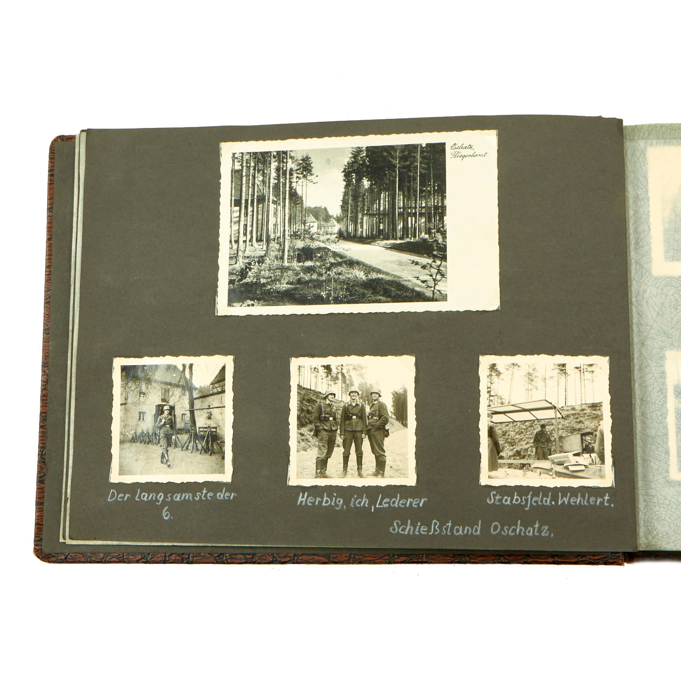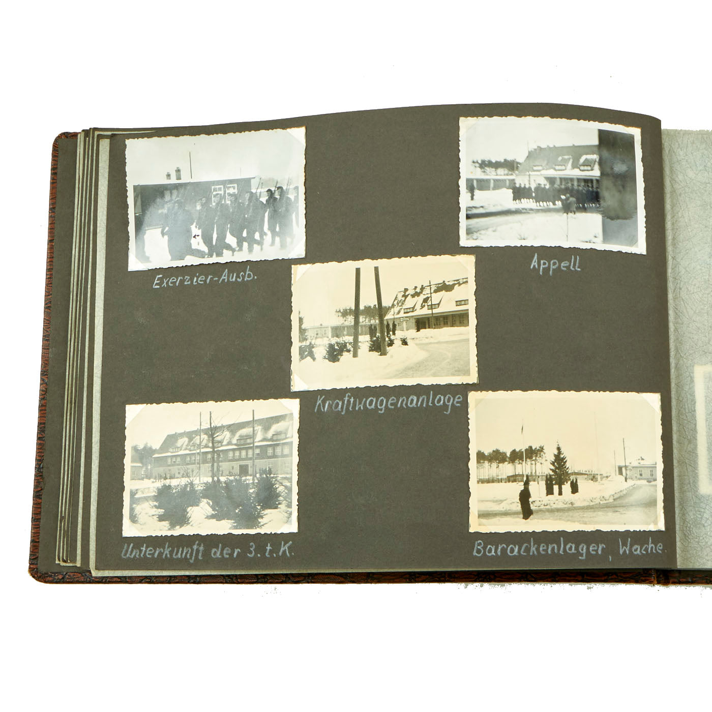Original Item: One-Of-A-Kind. A wonderful personal photo album with some professional shots as well as personal snapshots, some of which have military aircraft and Luftwaffe officers. All photos are held in place with period corner tabs. Front cover features a silver embossed Meine Dienstzeit (My Service Time) and Luftwaffe Eagle cap badge with silver corner tabs replacing the Swas.