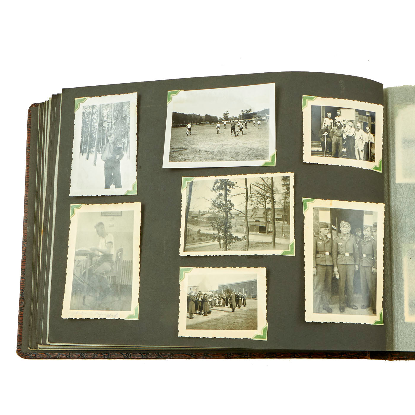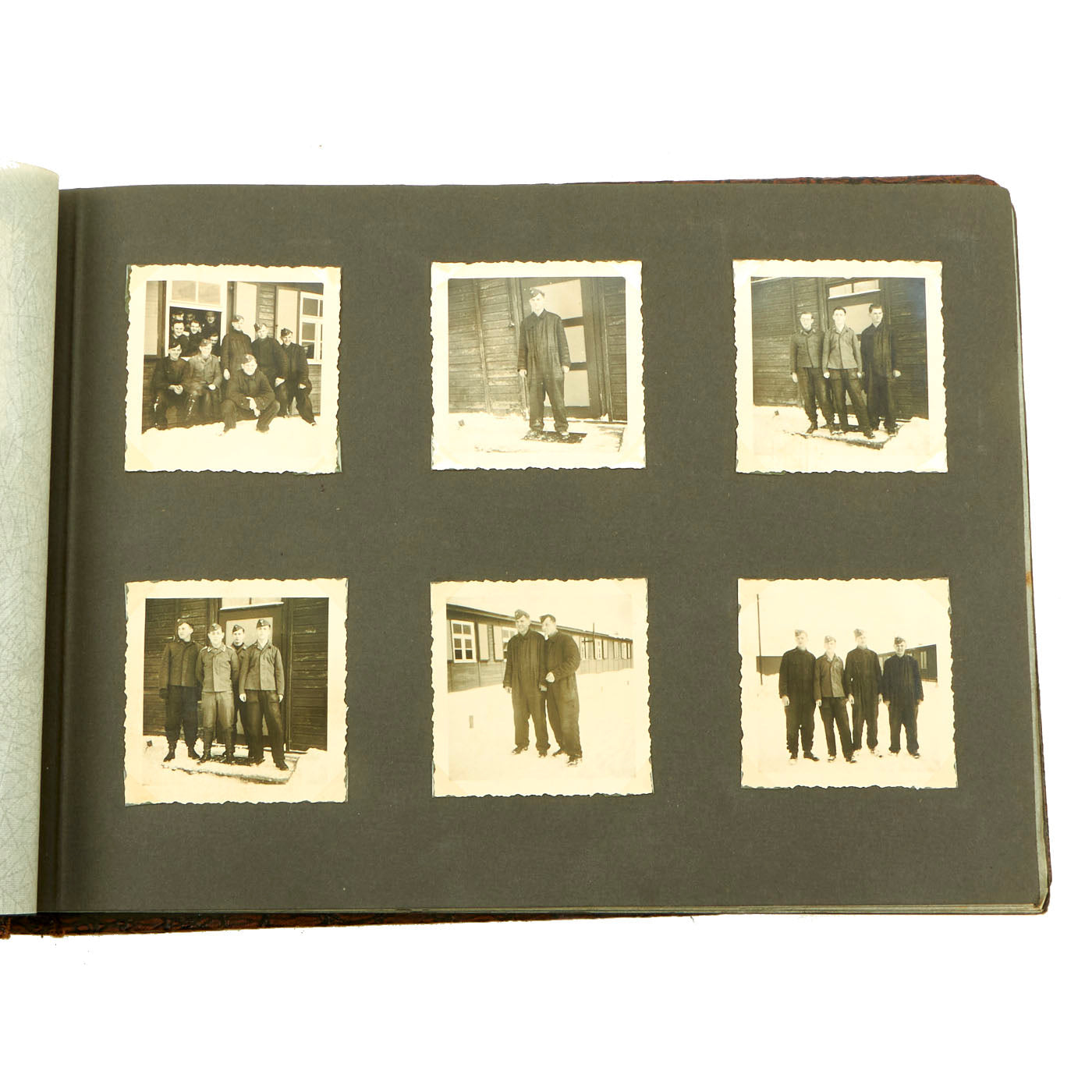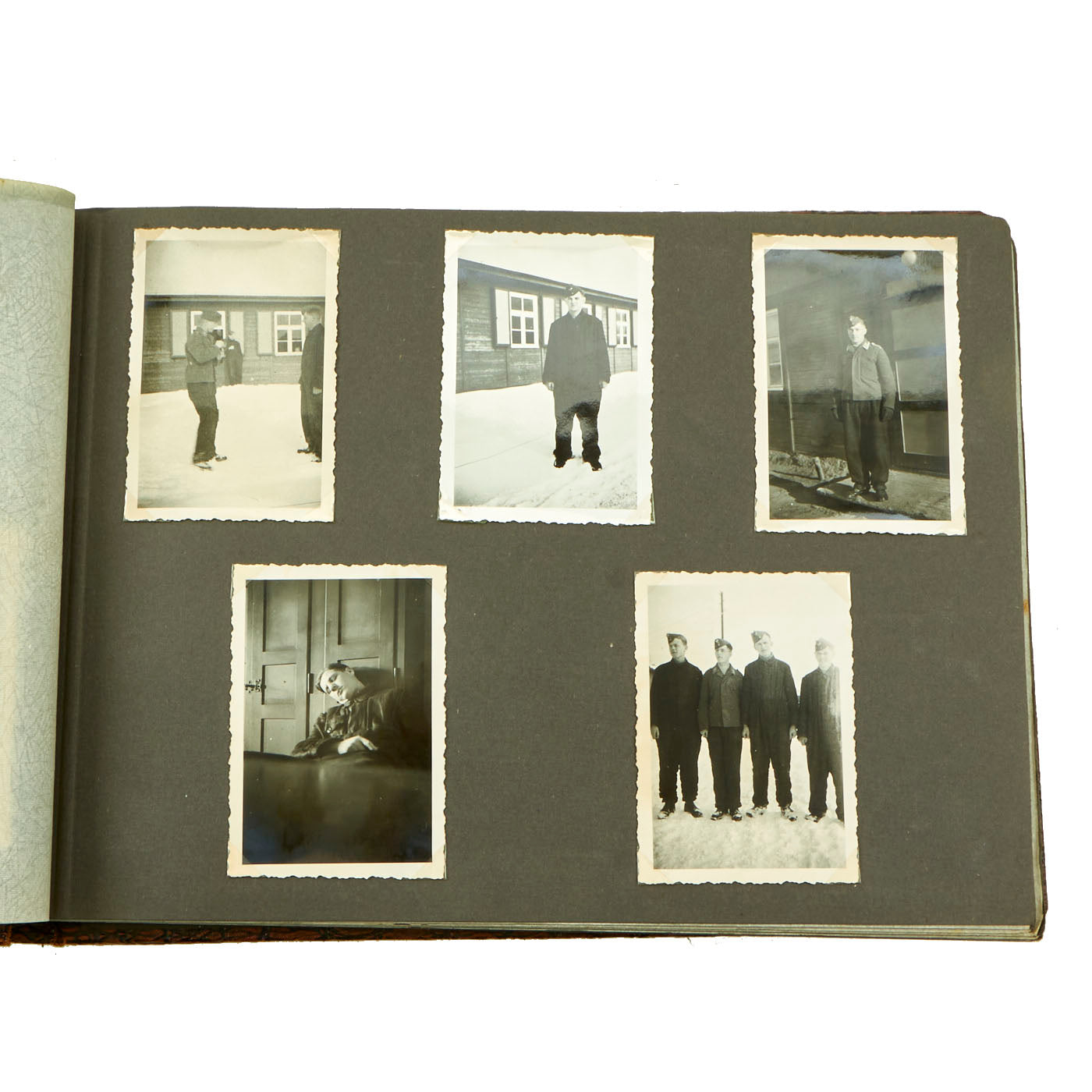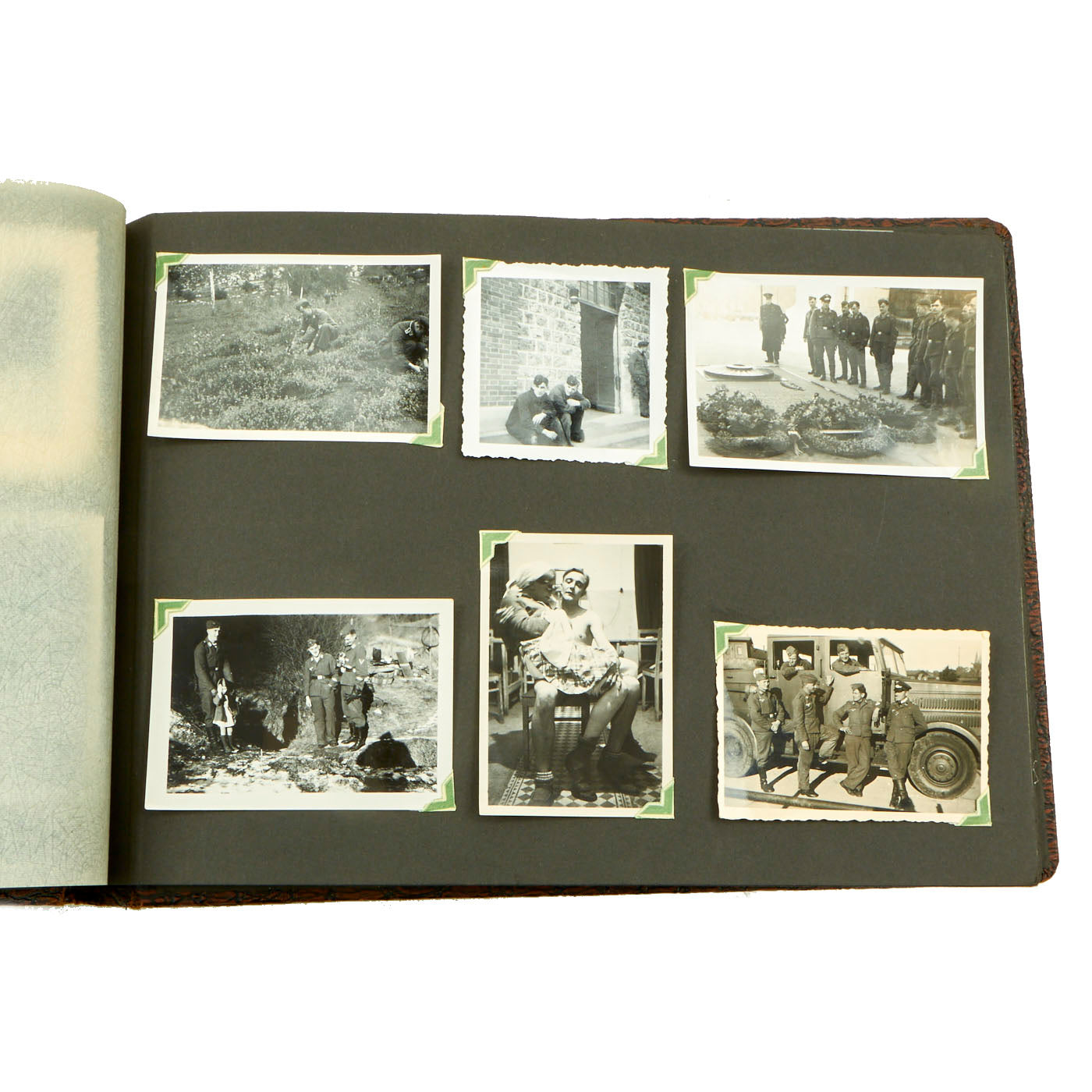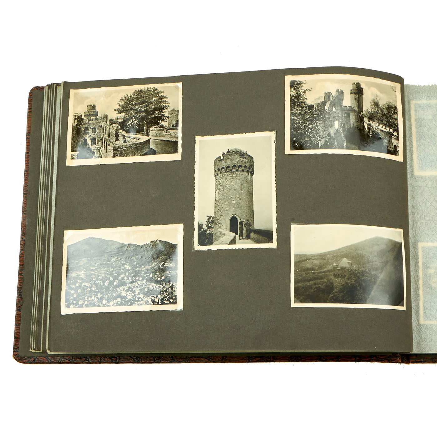 Original Item: One-Of-A-Kind. A wonderful personal photo album with some professional shots as well as personal snapshots, some of which have military aircraft and Luftwaffe officers. All photos are held in place with period corner tabs. Front cover features a silver embossed Meine Dienstzeit (My Service Time) and Luftwaffe Eagle cap badge with silver corner tabs replacing the Swas.