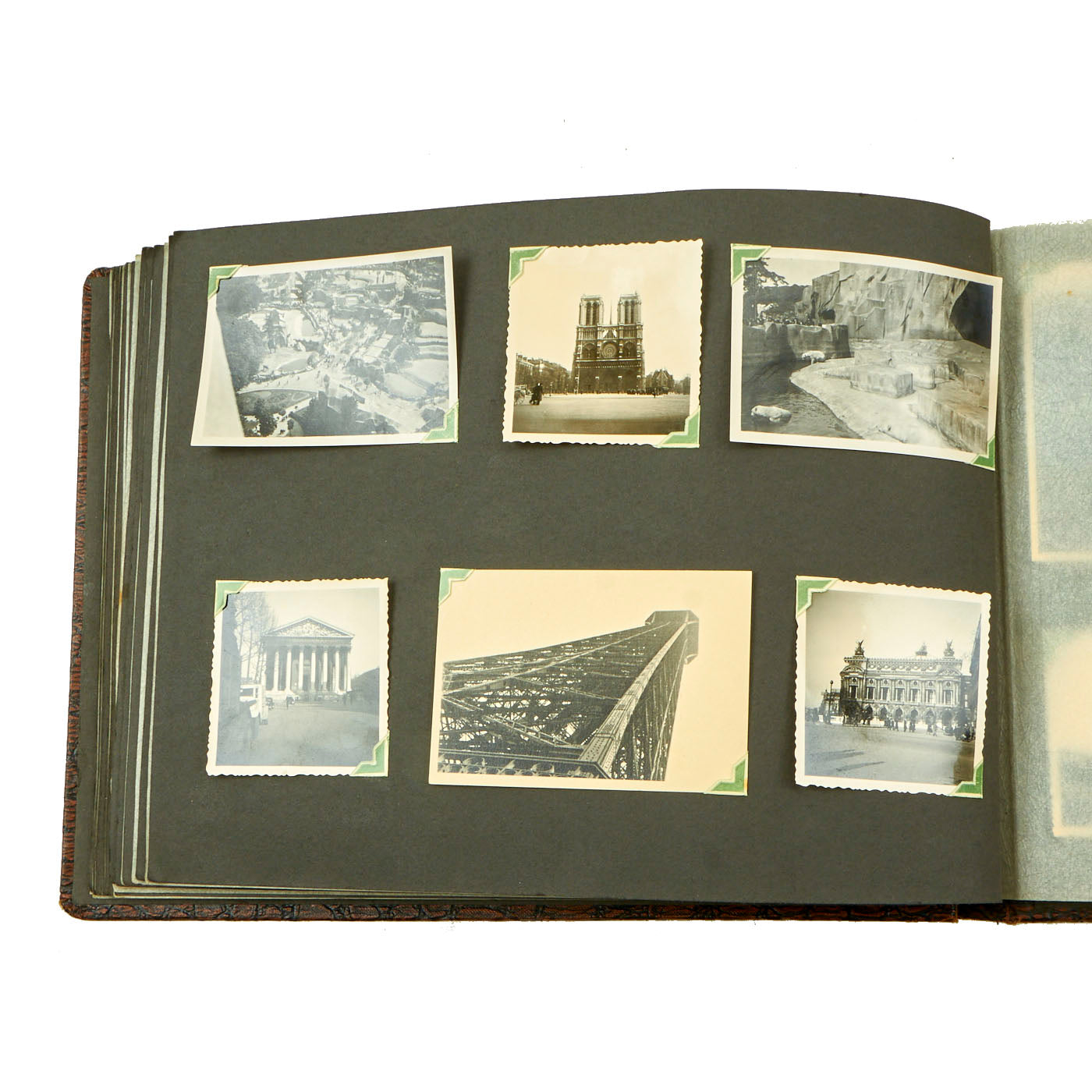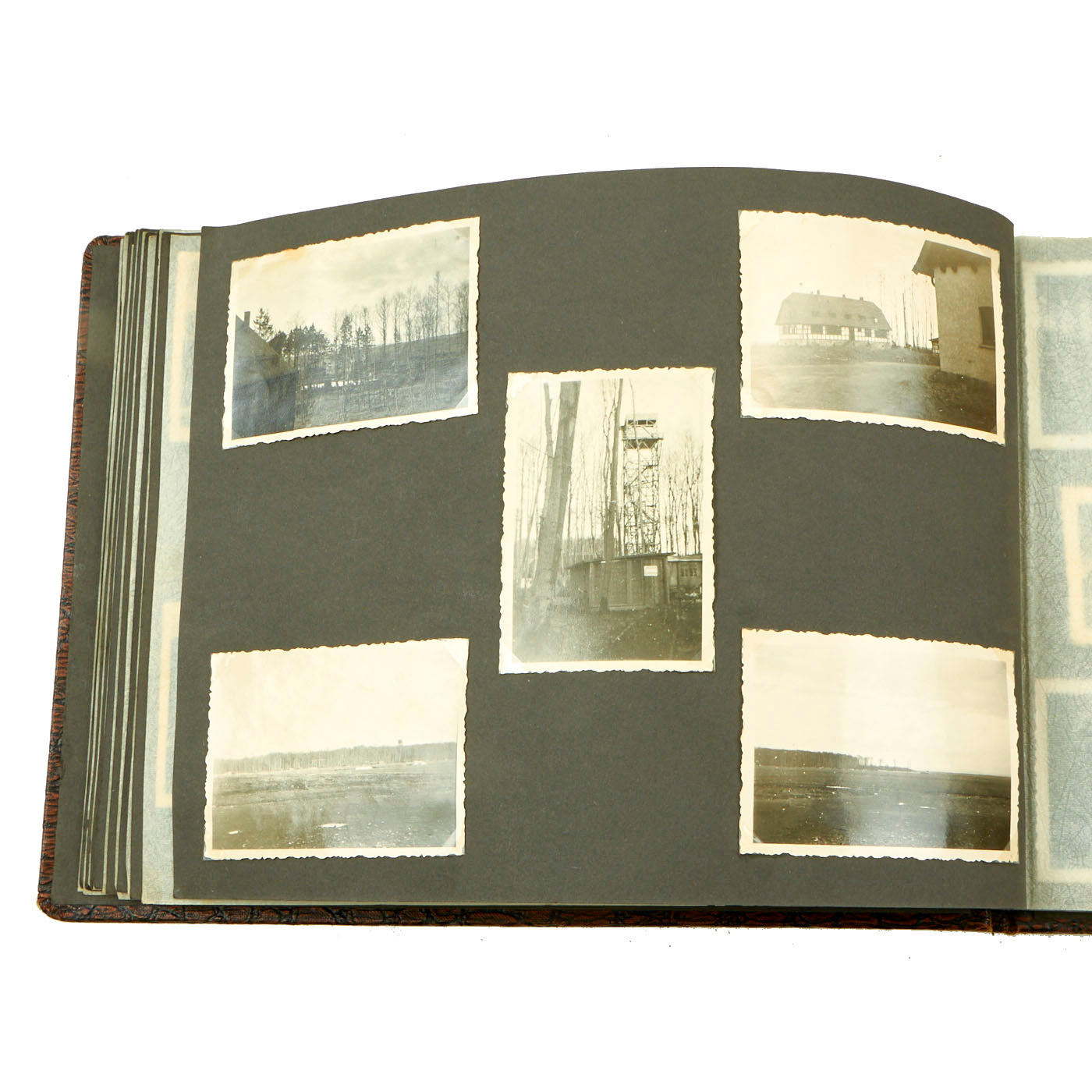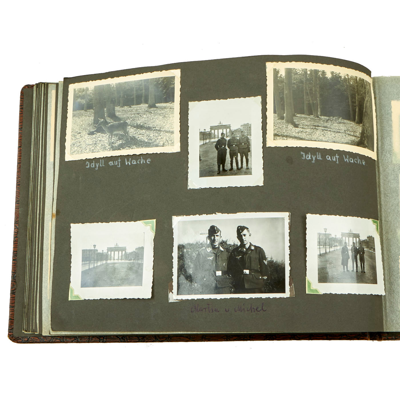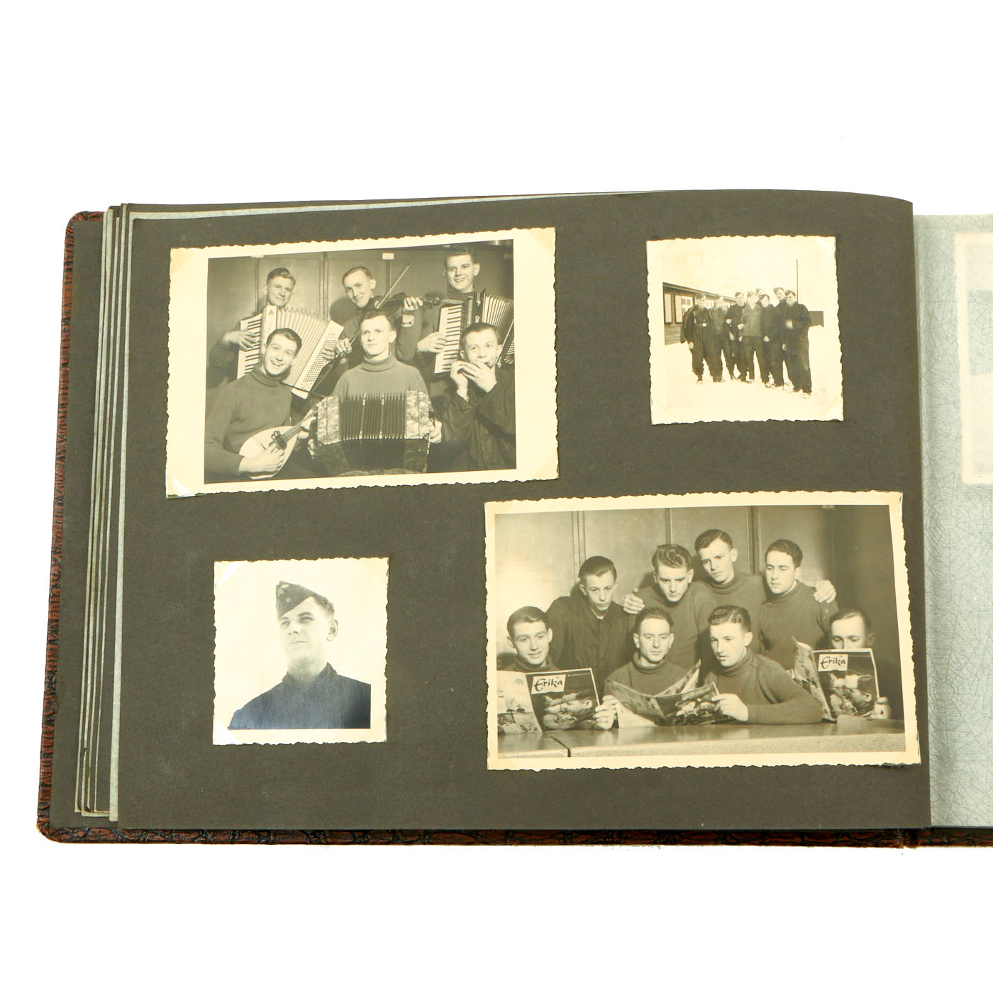 Original Item: One-Of-A-Kind. A wonderful personal photo album with some professional shots as well as personal snapshots, some of which have military aircraft and Luftwaffe officers. All photos are held in place with period corner tabs. Front cover features a silver embossed Meine Dienstzeit (My Service Time) and Luftwaffe Eagle cap badge with silver corner tabs replacing the Swas.