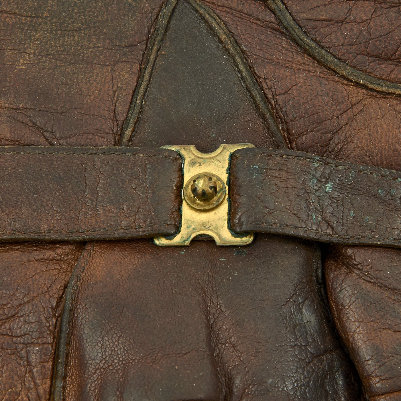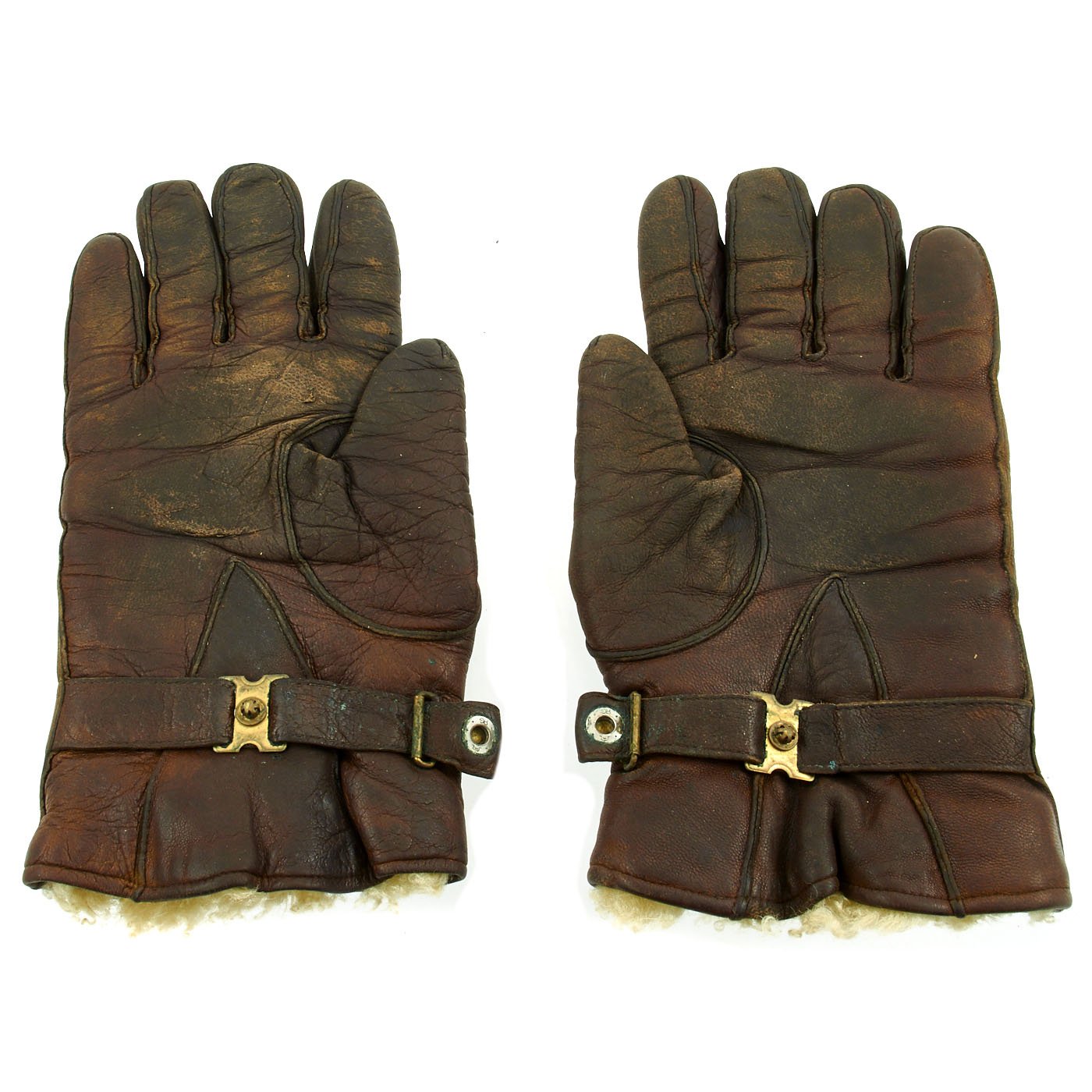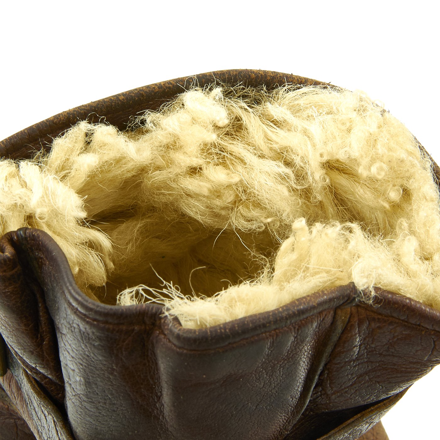 Original Item: Only one pair available. This is a Genuine very nice pair of German WWII Luftwaffe "Short Pattern" Flight gloves, made of very nice brown sheepskin shearling leather. While the mature wool is not as soft as lamb shearling, the leather itself is much more robust when using a mature sheep, making these more durable. They have a belted wrist adjustment, with a sliding snap buckle for size adjustment.