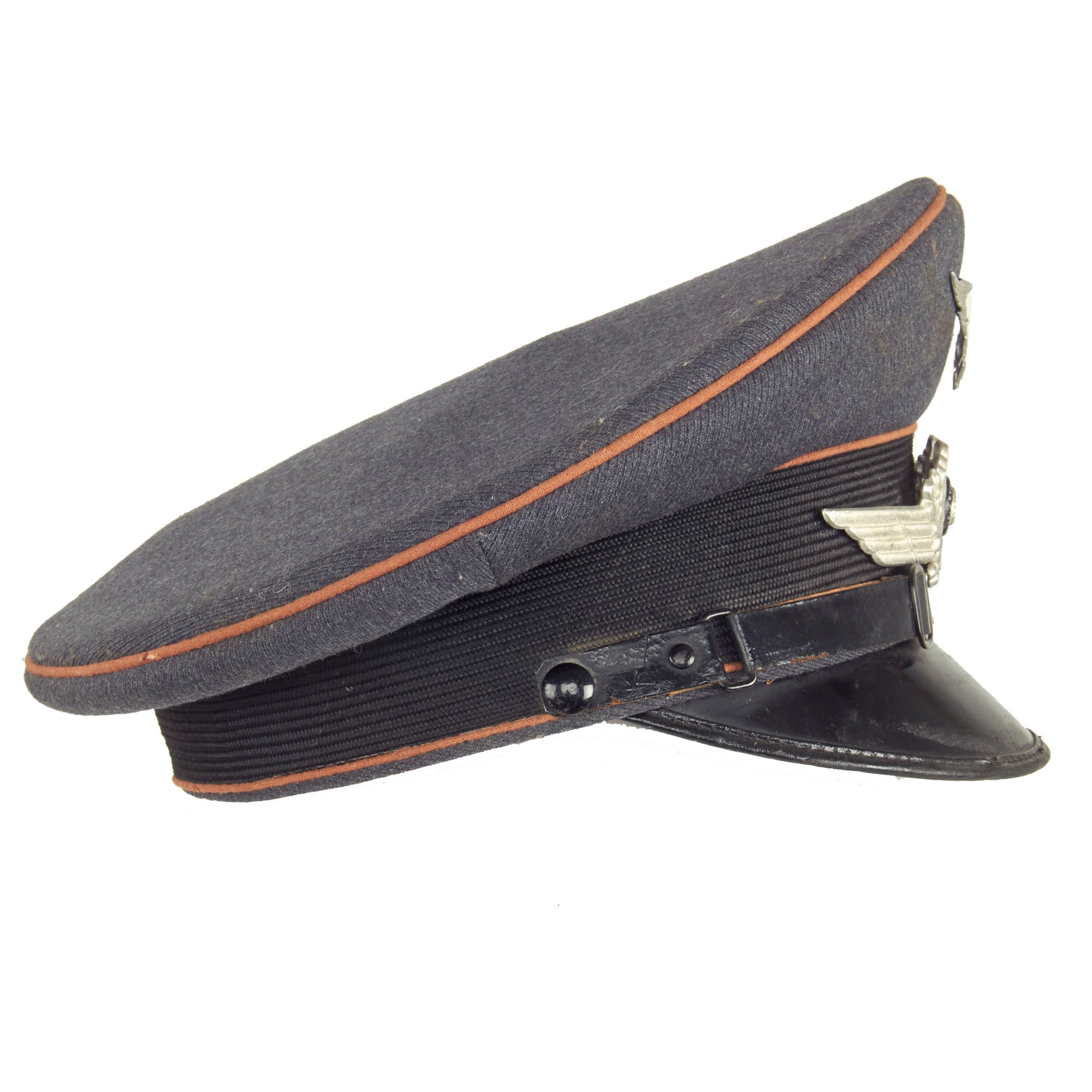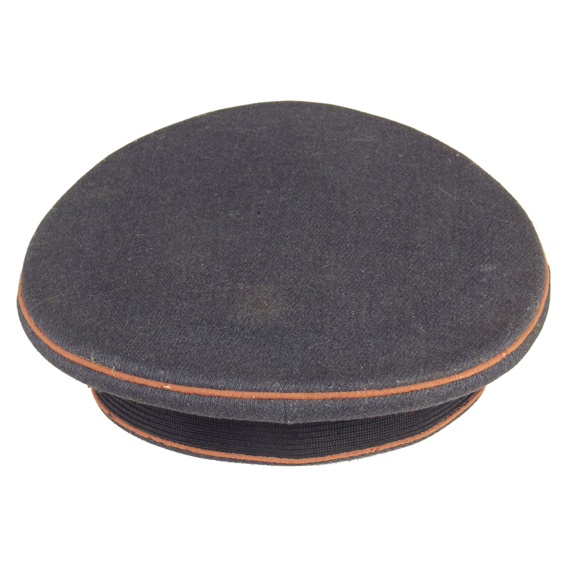 Original Item: Only One available. This is a very nice lightly used condition Luftwaffe Signals EM/NCO Schirmmütze (Visor Cap), made by the very desirable EREL company, a top class maker of headwear during the war. It still has the original crown stiffener installed, so the sides have not sunken down much over the years, giving it a great gently swept back look. This NCO Schirmmütze Visor Cap is an original high quality manufactured cap. It is fabricated in Luftwaffe blue gray Fliegerblau (Flier's Blue) "whipcord weave' wool, with wide black wool cap band, plus three rows of saddle brown (braun) color piping around the circumference. This is the Luftwaffe Waffenfarbe (corps color) for the Air communications corps (Luftnachrichtentruppe), usually referred to as "Signals".