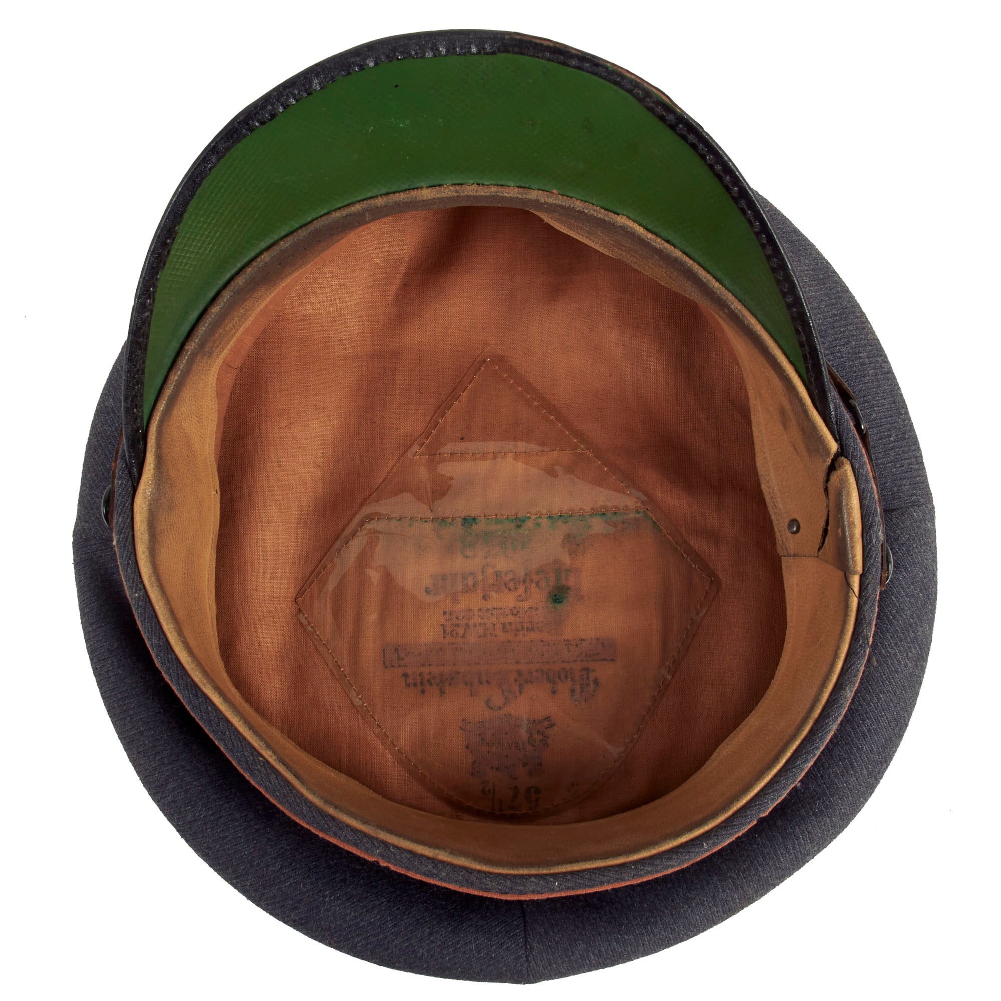 The interior of the cap is lined with light brown "service cloth" type material, showing very little in the way of staining or wear. The top celluloid sweat shield is fully intact with great stitching, and it shows a partly legible maker logo under size 57 1/2: