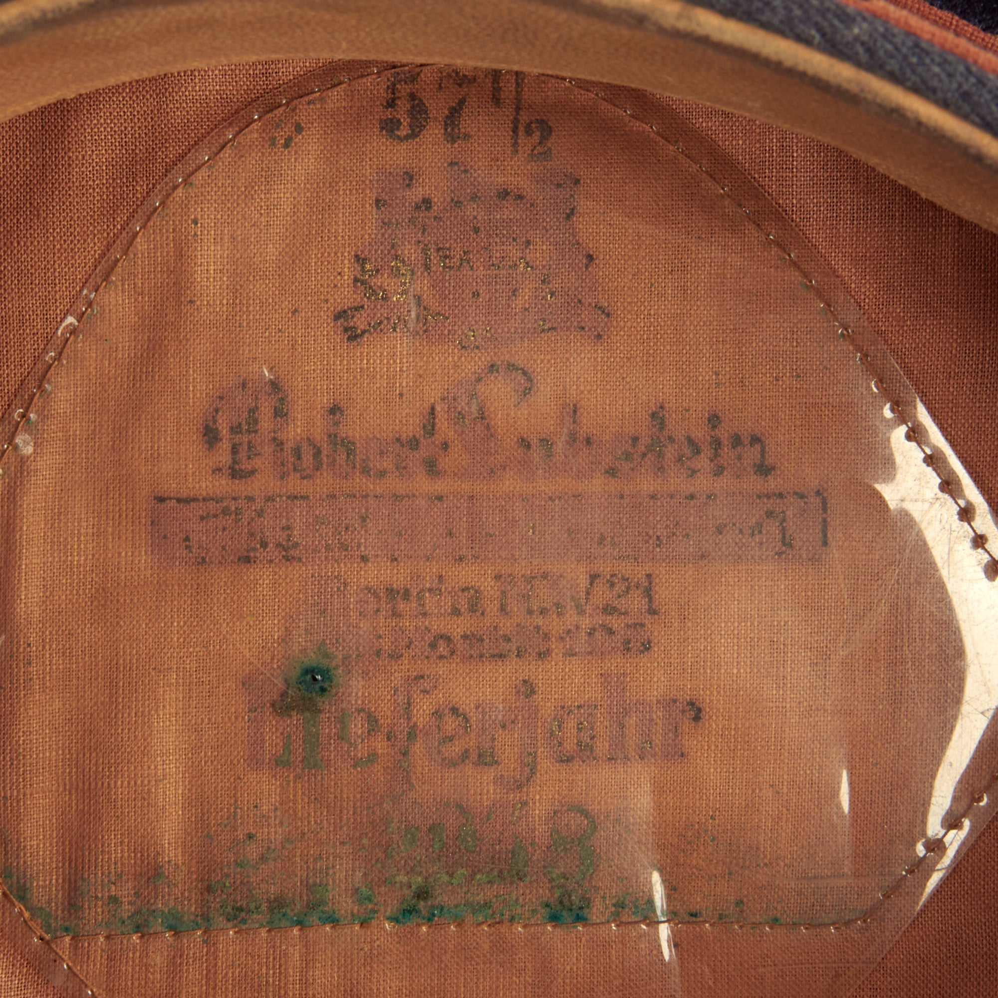 The maker information is made from silver paint, which has mostly fallen off and now oxidized into verdigris under the shield. Most lines can still be read however. "Lieferjahr" translates to "Delivery Year", so that is when the cap was slated to be delivered to the Luftwaffe. Robert Lubstein was a very well known distributor of caps, and was particularly known for retailing their trademark EREL brand headgear.
