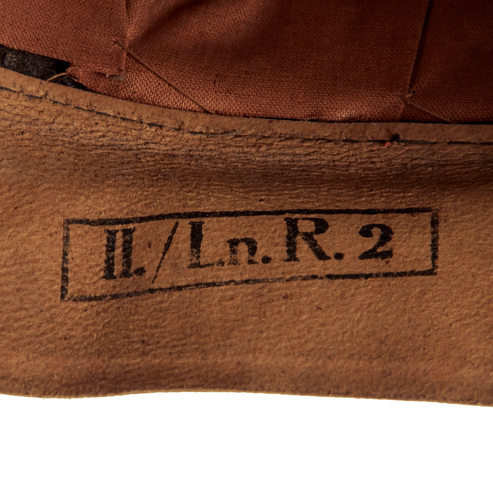 The sweatband is tan leather, and in very good condition, still supple, showing moderate wear and staining from service. There is a tear near the securing rivet, but otherwise there is no major damage. On the underside of the leather, it is stamped with unit number II. / Ln. R. 2, which we assume would be for the 2nd Company, Luftnachrichten (Signal Intelligence) Regiment 2. Definitely some great research potential here!