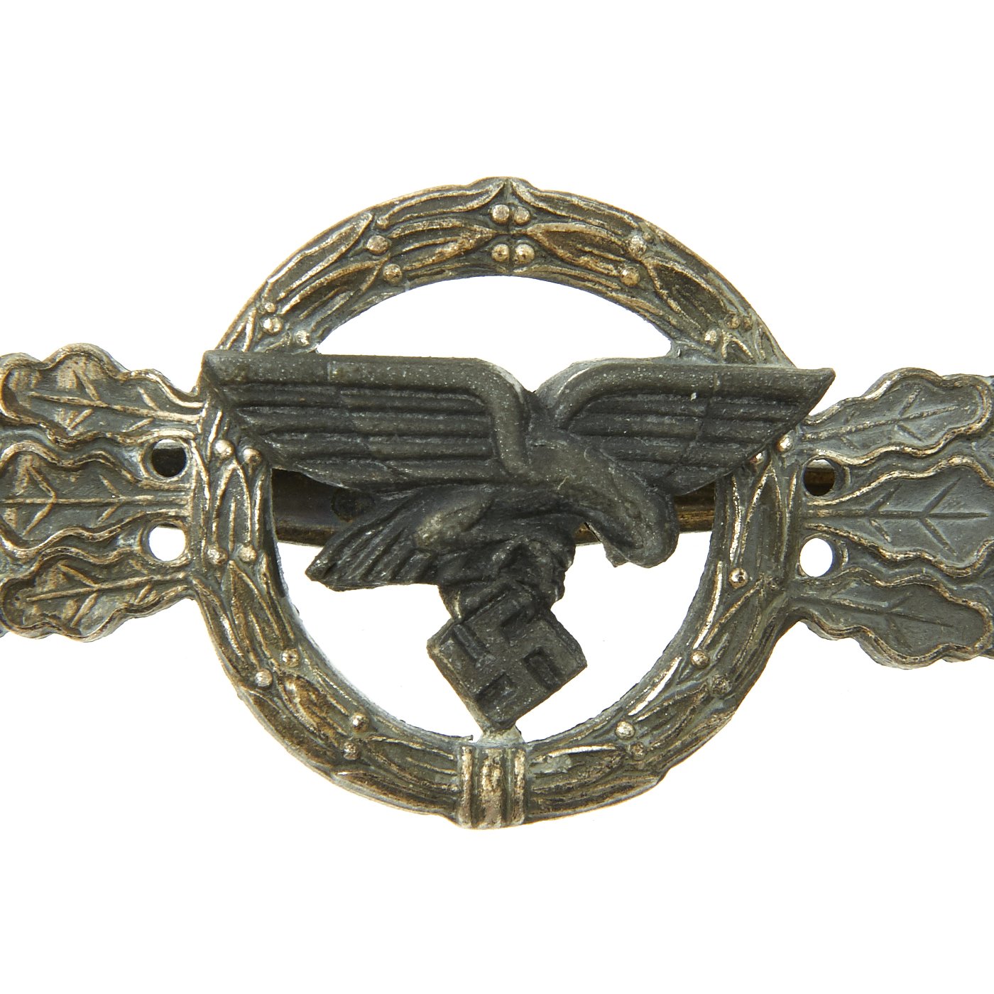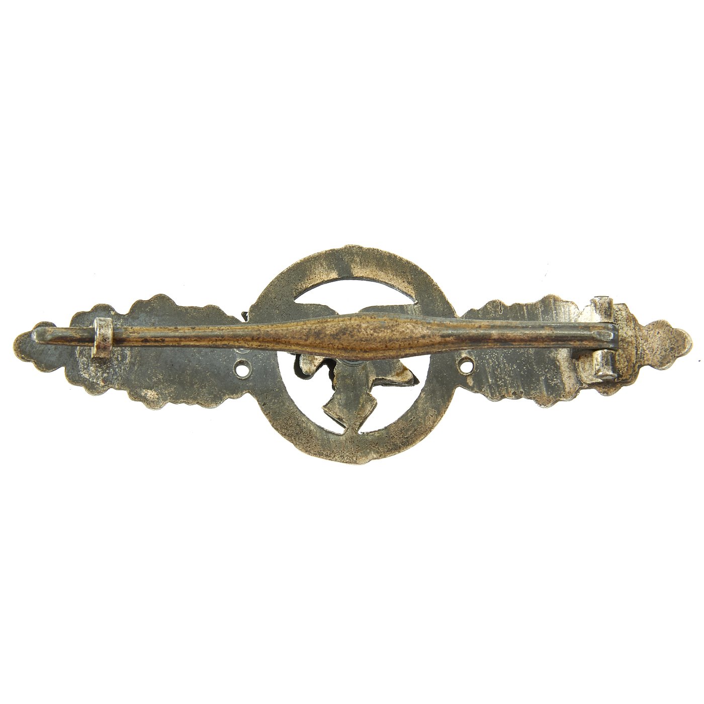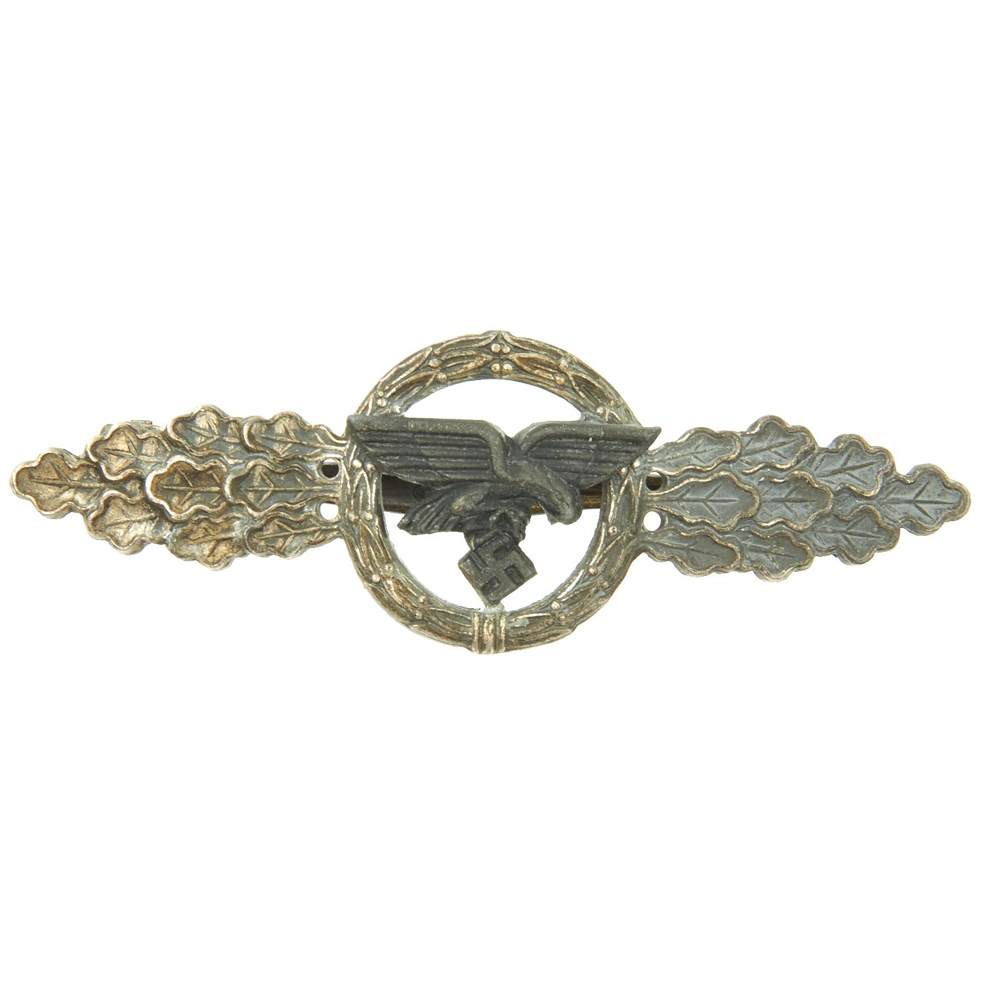 Original Item: Only One Available. This is a very nice condition German WWII Luftwaffe Front Flying Clasp in Silver Grade, as issued to Transport and Glider pilots who had flown 60 missions. Officially this version of the award is termed the Frontflugspange für Transport- und Luftlandflieger in Silber in German. This example is in very nice condition, with some age-related oxidation, which gives it a lovely aged patina. The central device is blackened, as standard, and it does not show any wear. The back clip is intact, and works beautifully. A great example of a hard to find military decoration!