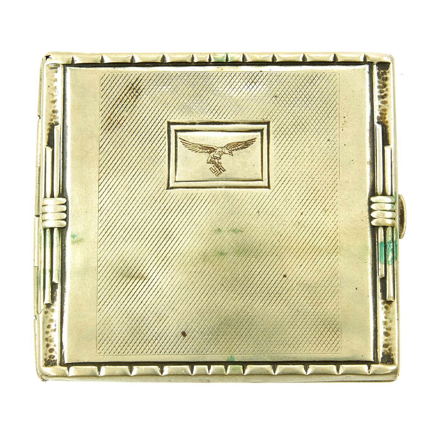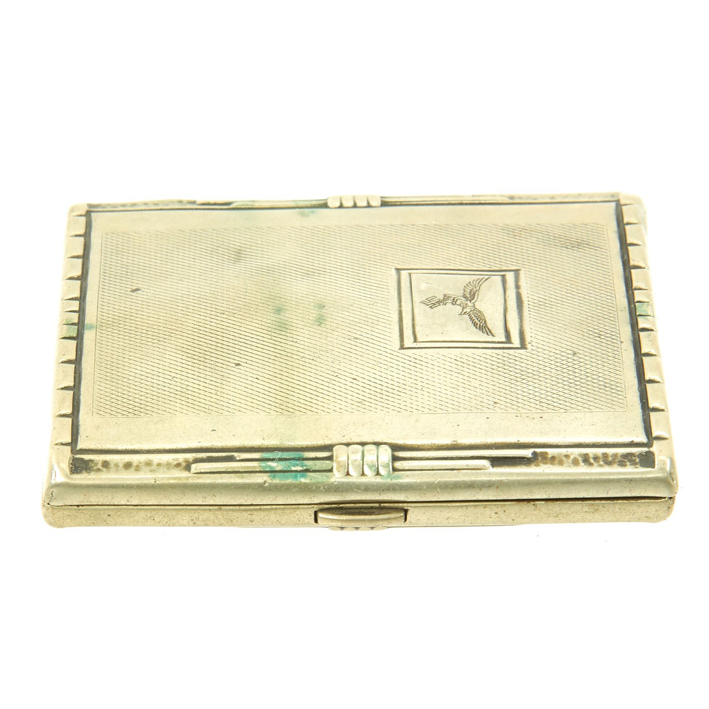 Original Item: One of a Kind. This was just acquired from a collector at a large military collection. This is a very nice German WWII Cigarette case, made from Nickel Silver, with a Luftwaffe "droop-tail" eagle in a box on the front. The inside is marked in German "Black Letter" type face with the following inscription:
