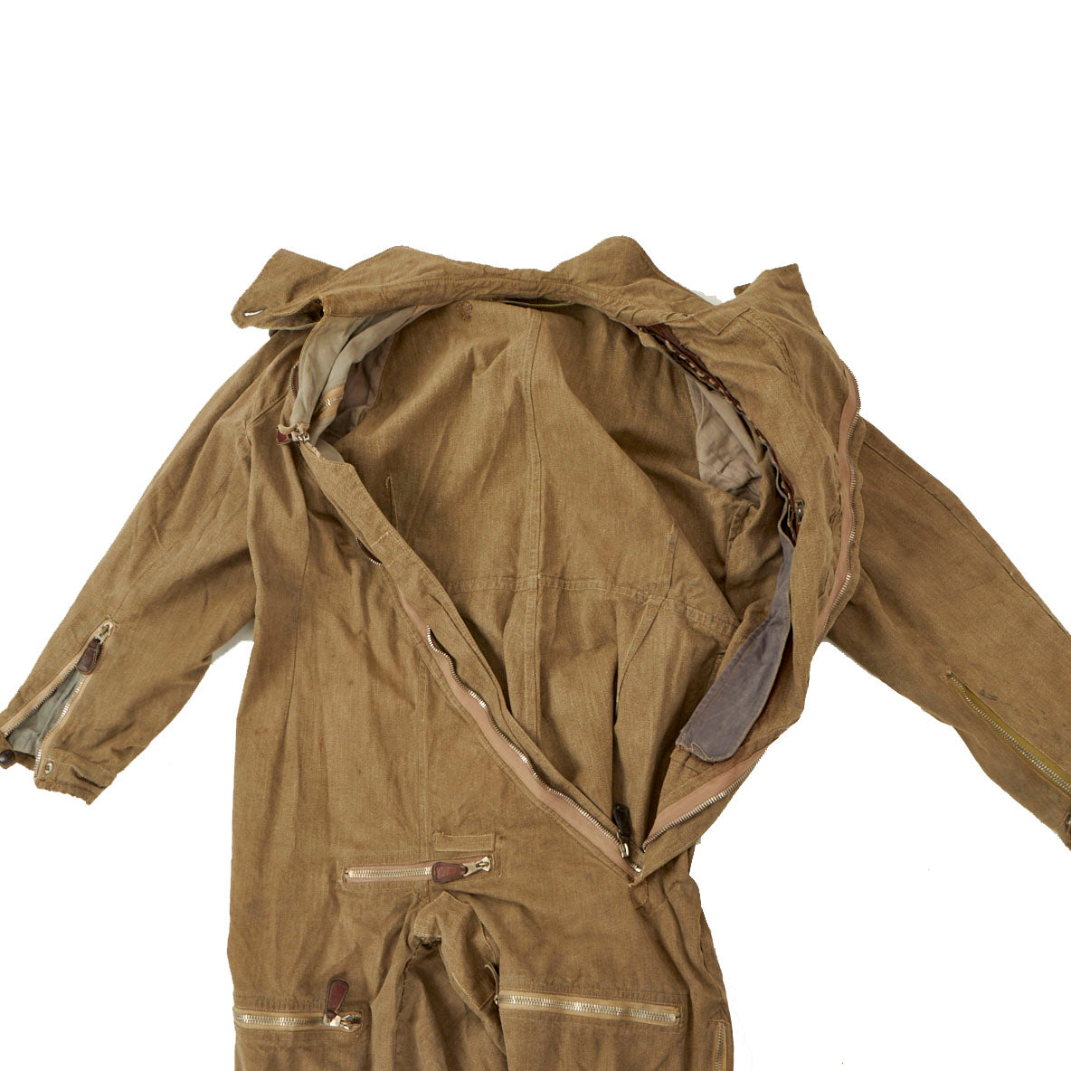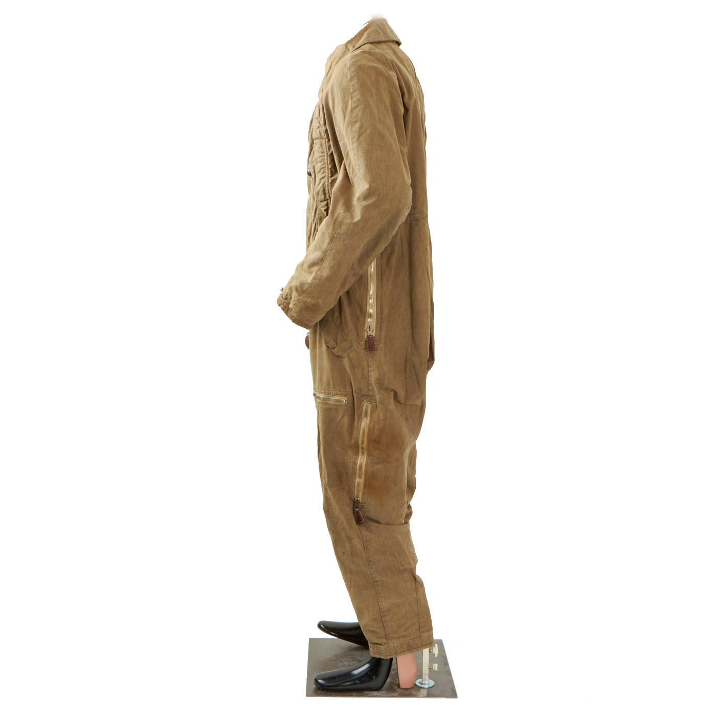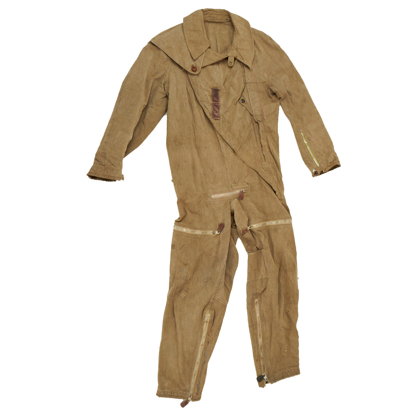 Original Item: Only One Available. WWII German Luftwaffe Summer Flyers Suit. This is a one piece, coverall style summer flight suit constructed in slightly mottled, white flecked, tan cotton with leather and metal fittings. All buttons, snaps and zippers are complete, however, the main zipper on the front of the jacket will not stay zipped when fully zipped up. The buttons are marked PRYM 6H. Zippers are a mix of Rheinnadel, Zipp, Wico, and Elite. All zippers retain their leather pull tabs. We do not see any labels or maker markings to the interior of any kind.