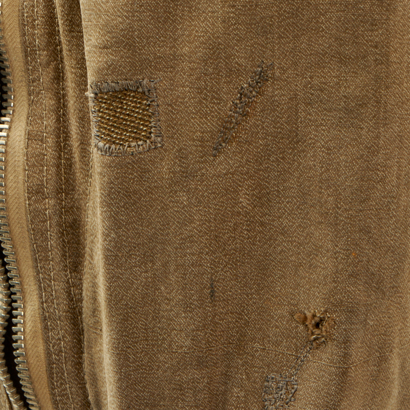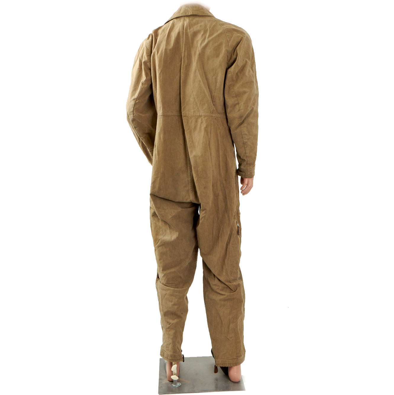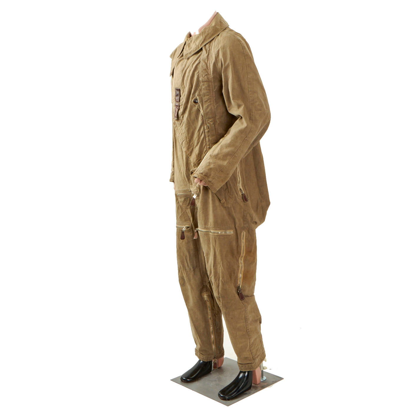 Original Item: Only One Available. WWII German Luftwaffe Summer Flyers Suit. This is a one piece, coverall style summer flight suit constructed in slightly mottled, white flecked, tan cotton with leather and metal fittings. All buttons, snaps and zippers are complete, however, the main zipper on the front of the jacket will not stay zipped when fully zipped up. The buttons are marked PRYM 6H. Zippers are a mix of Rheinnadel, Zipp, Wico, and Elite. All zippers retain their leather pull tabs. We do not see any labels or maker markings to the interior of any kind.