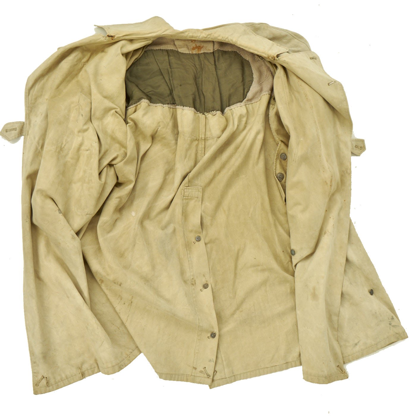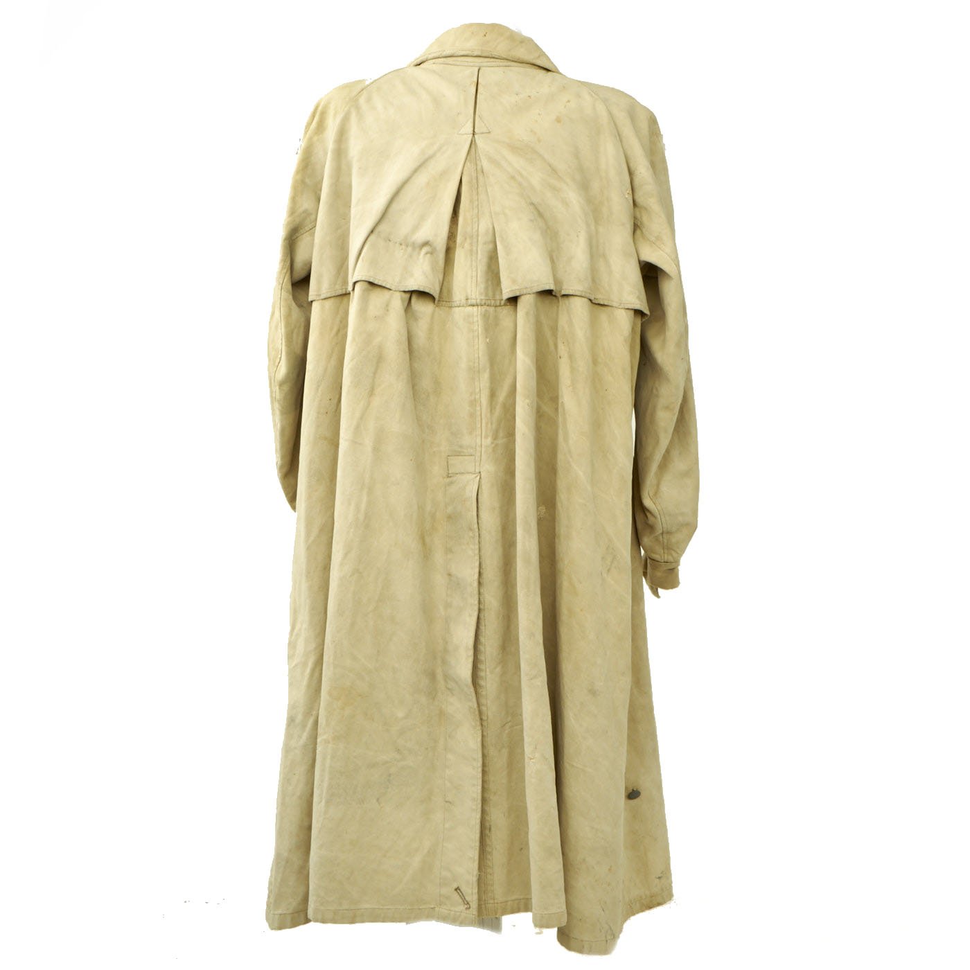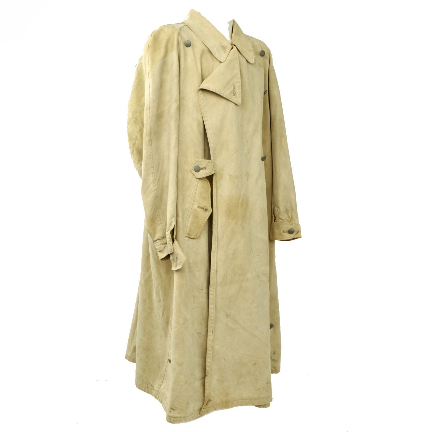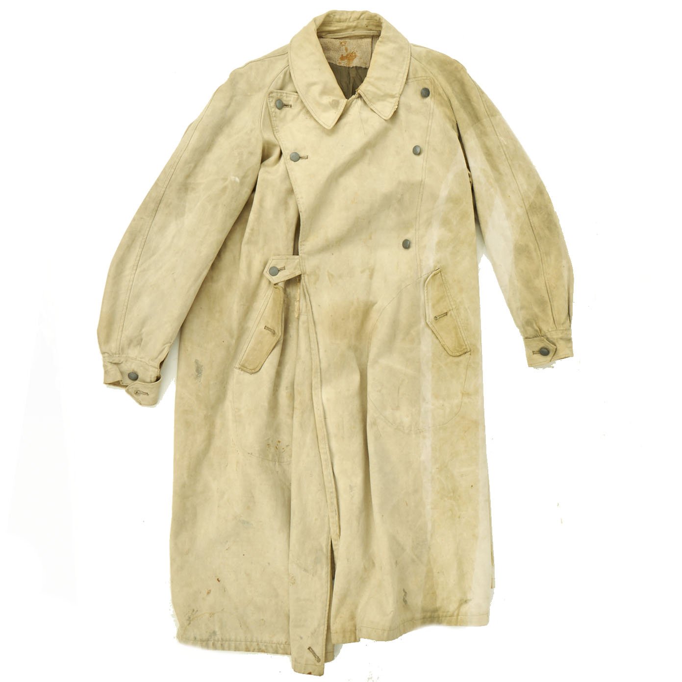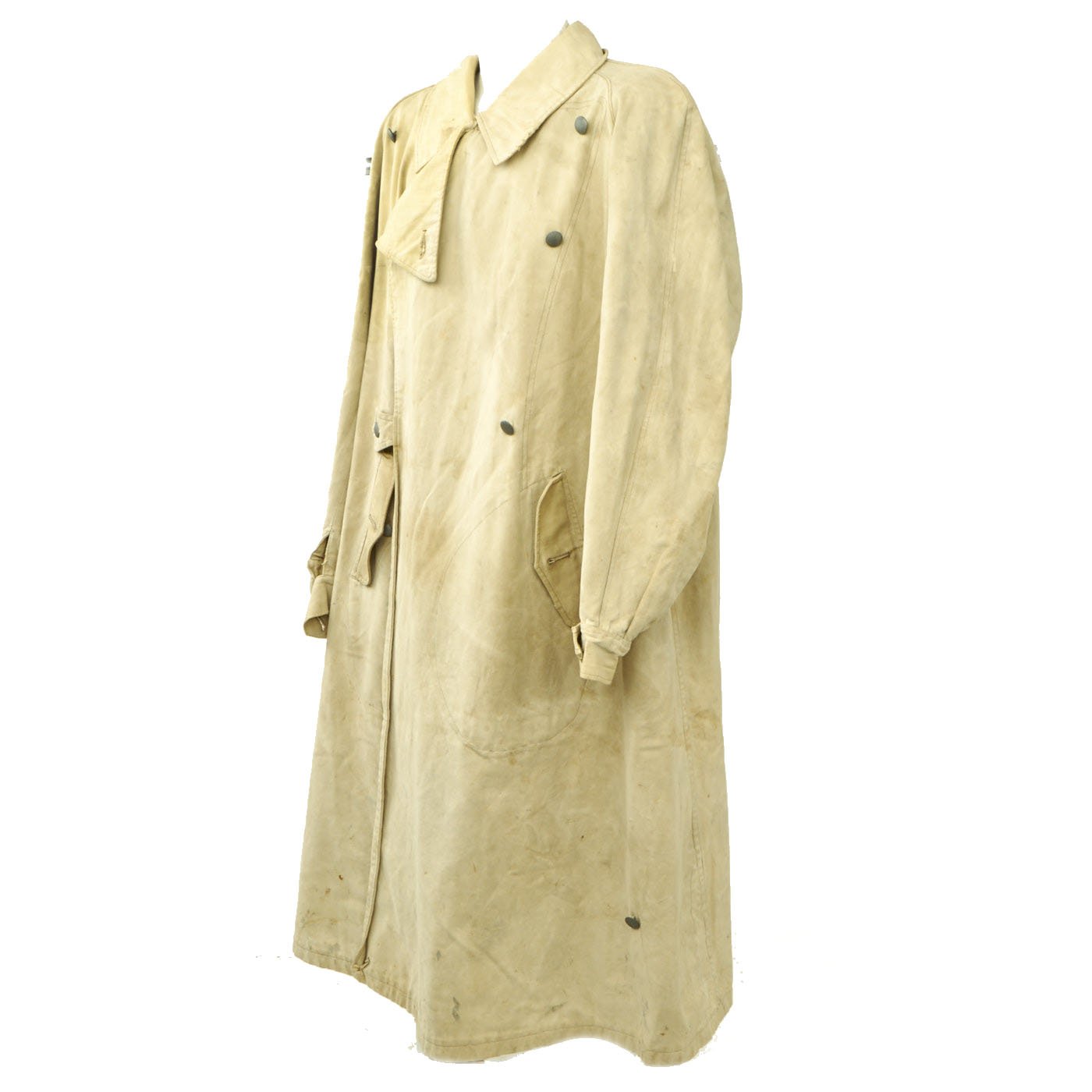 Original Item: Only One Available. This is a rare khaki cotton overcoat or greatcoat as used by German Luftwaffe Motorcycle riders in tropical environments (Italy, Mediterranean, North Africa) during World War Two. It is heavy grade cotton manufactured with high quality and offered in very good condition. Painted pebbled aluminum buttons are stitched and maker marked.