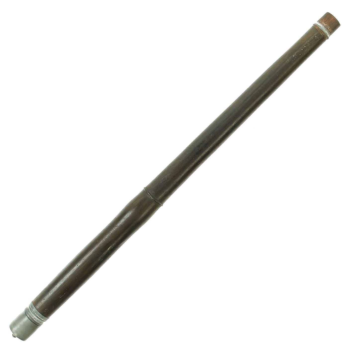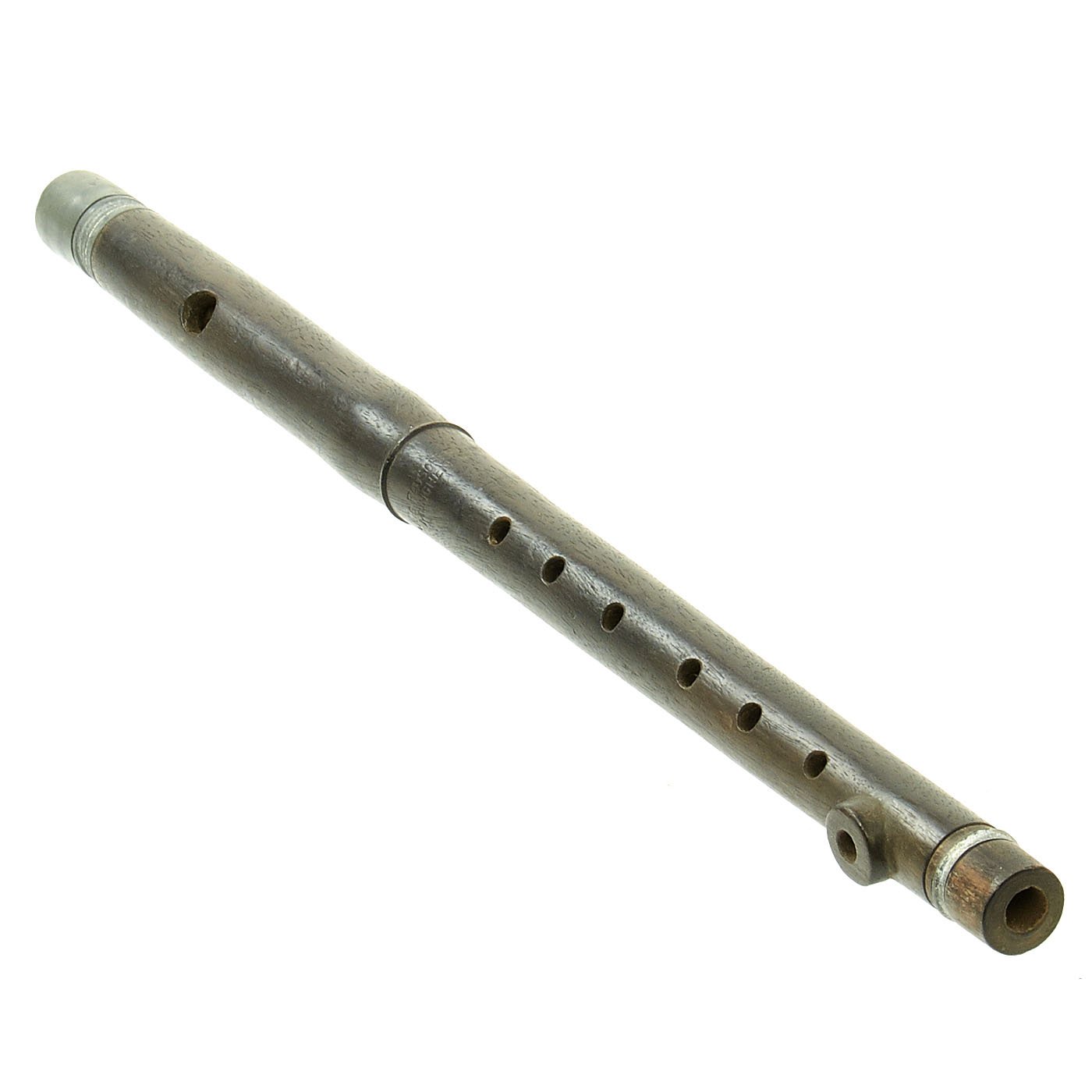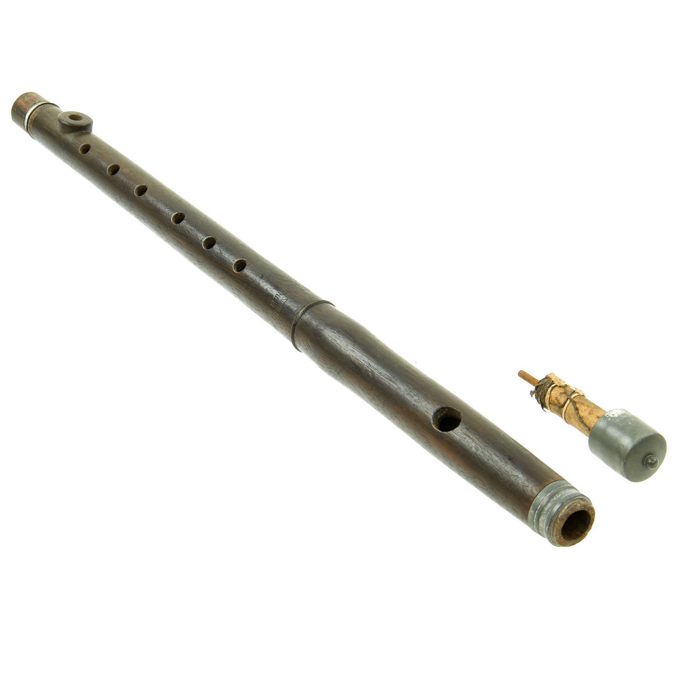 Flute is wood with zinc fixtures and offered in very good condition. The end plug still pulls out so that it can be swabbed to remove water. It measures approximately 15 inches in length. Ready to display!