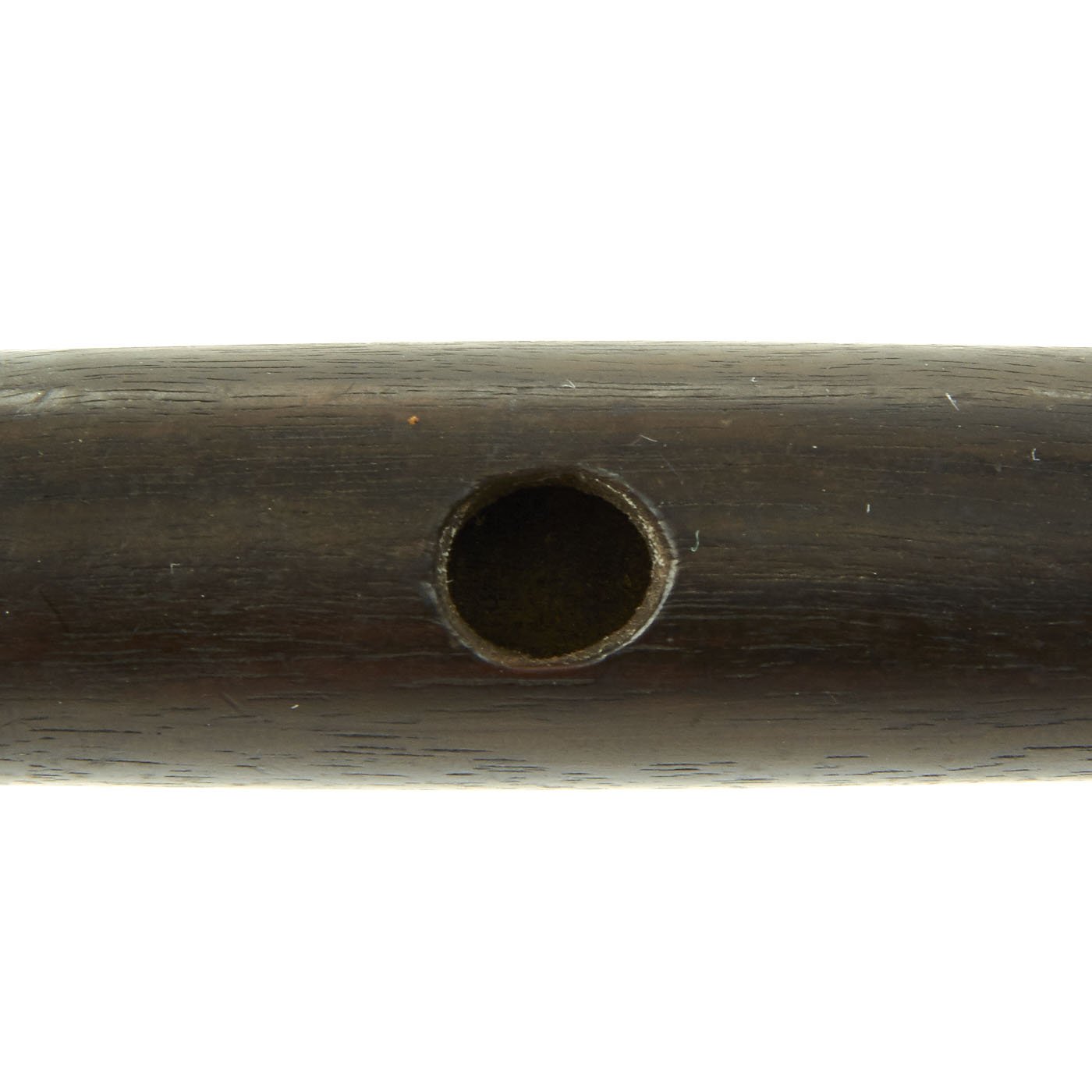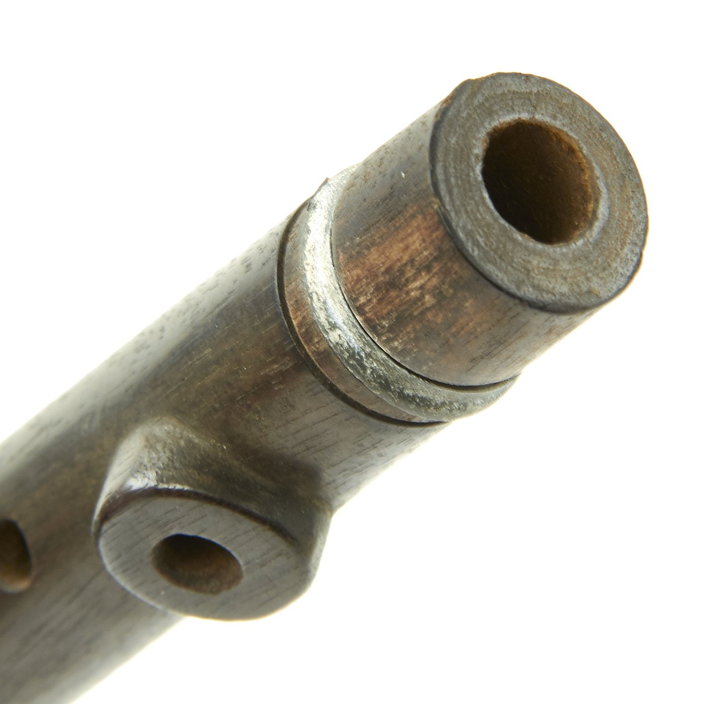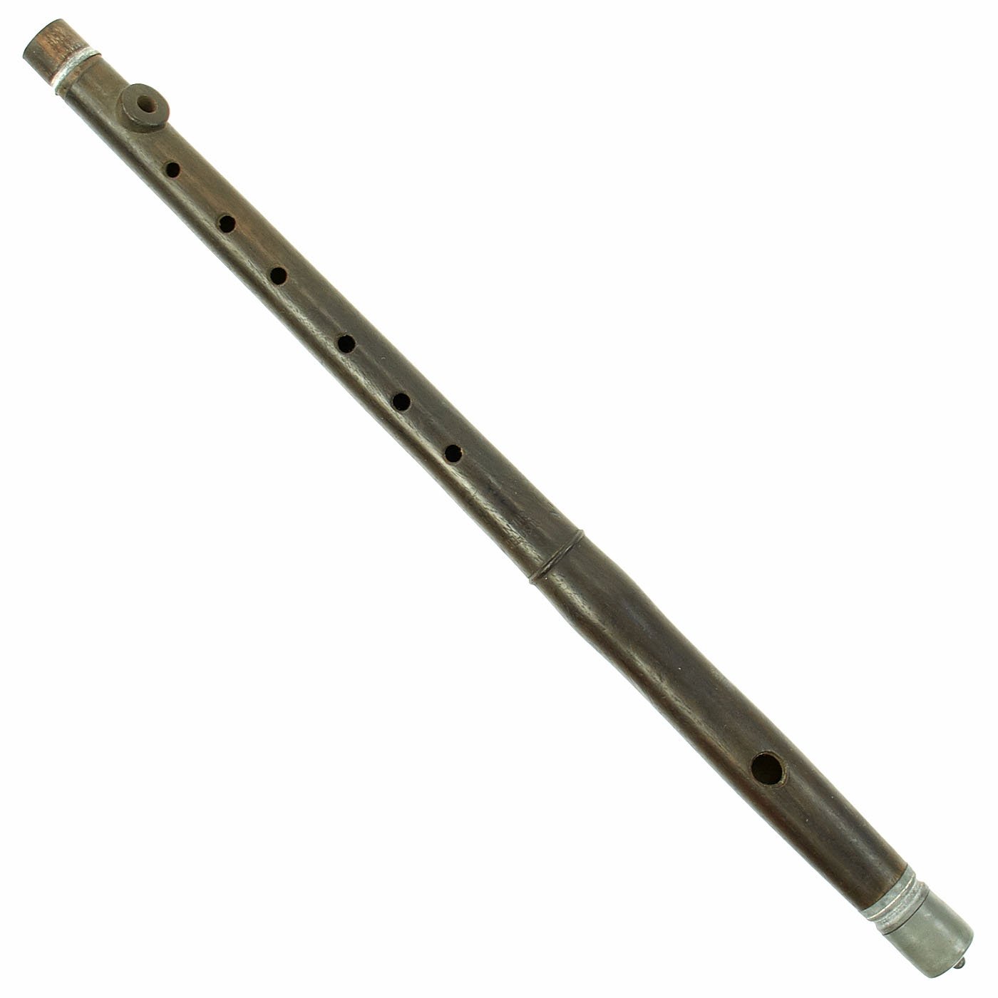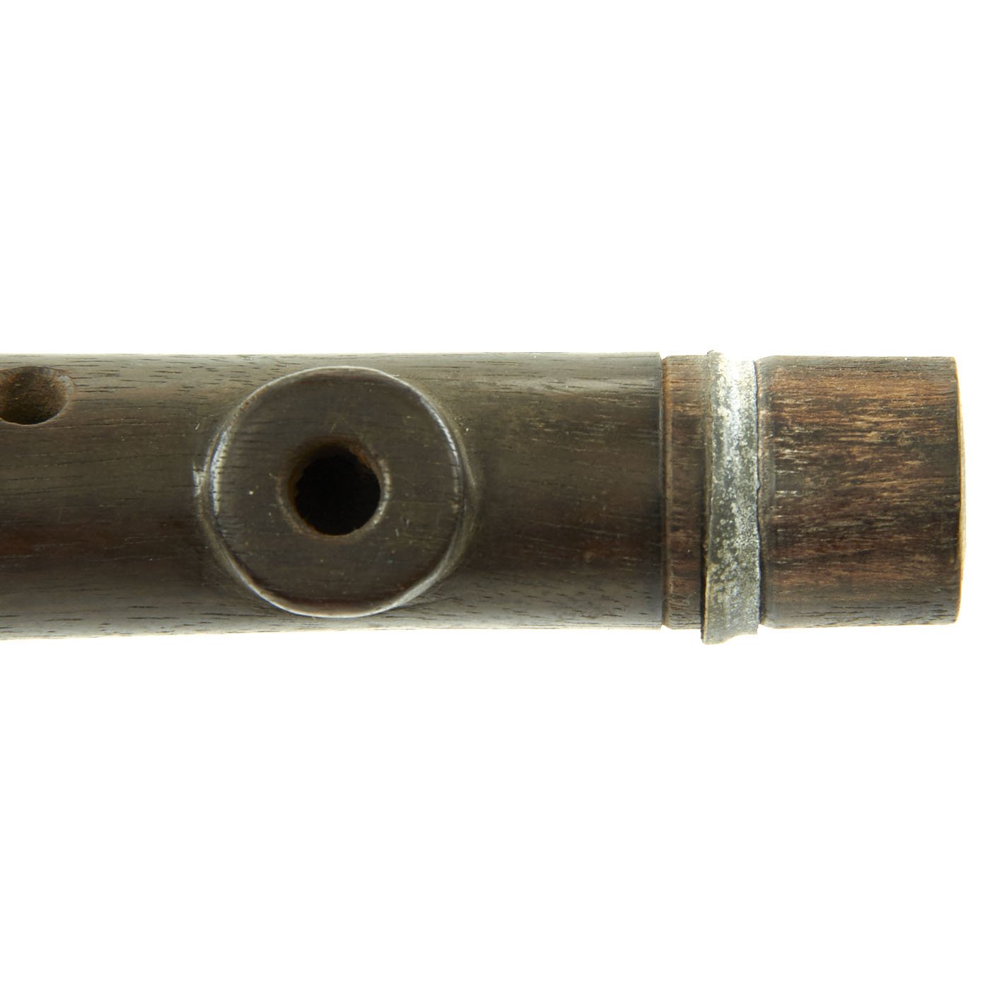 Flute is wood with zinc fixtures and offered in very good condition. The end plug still pulls out so that it can be swabbed to remove water. It measures approximately 15 inches in length. Ready to display!