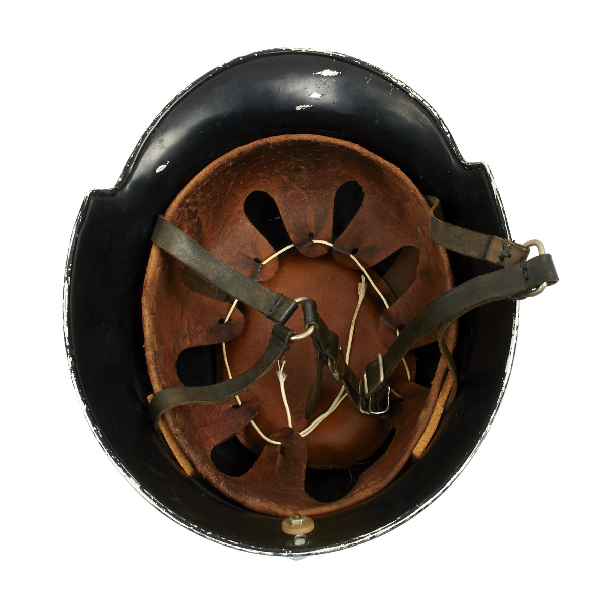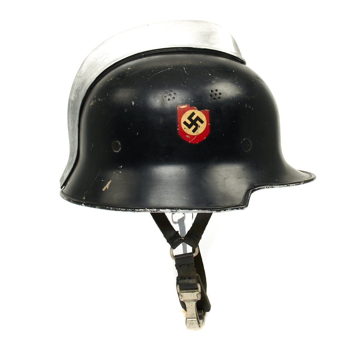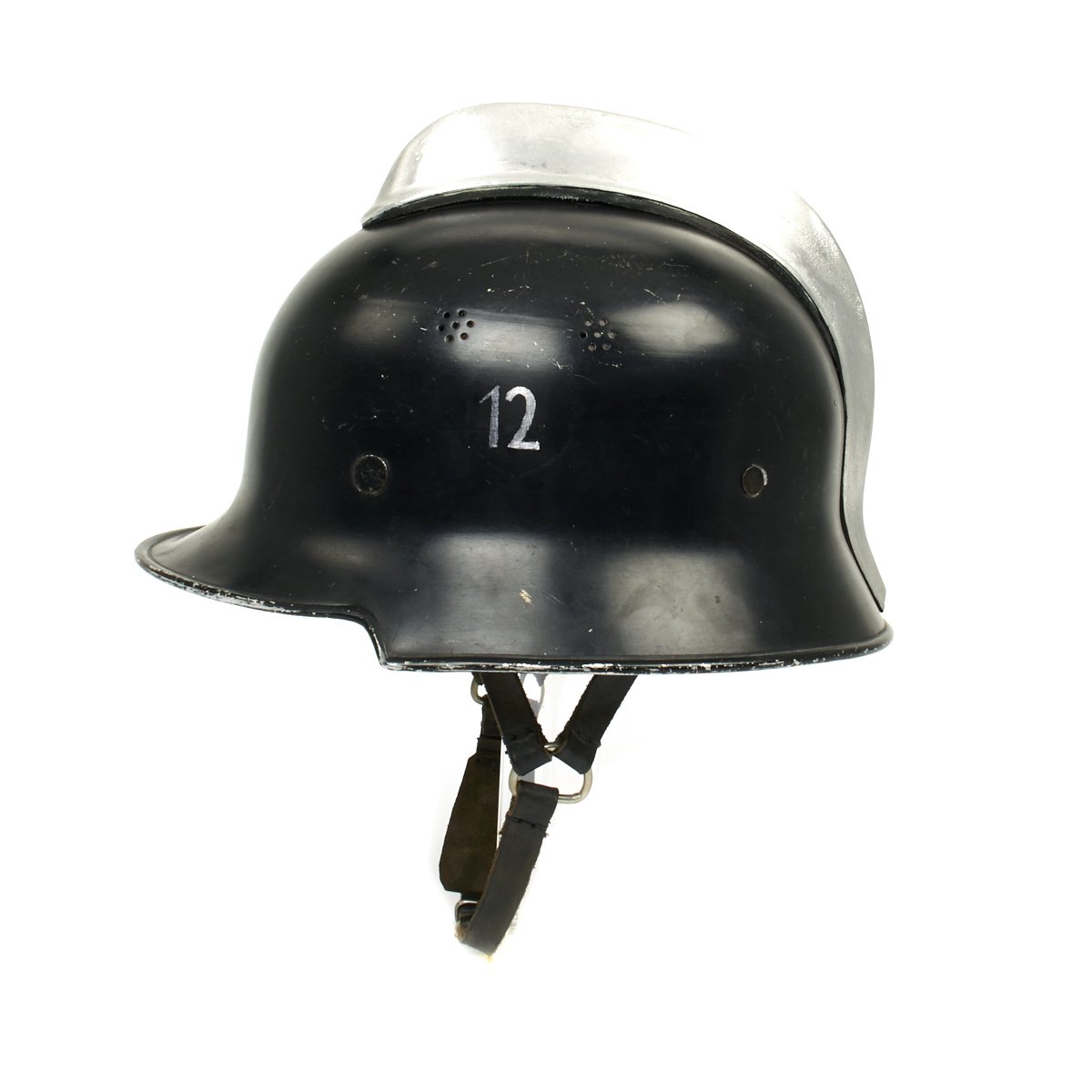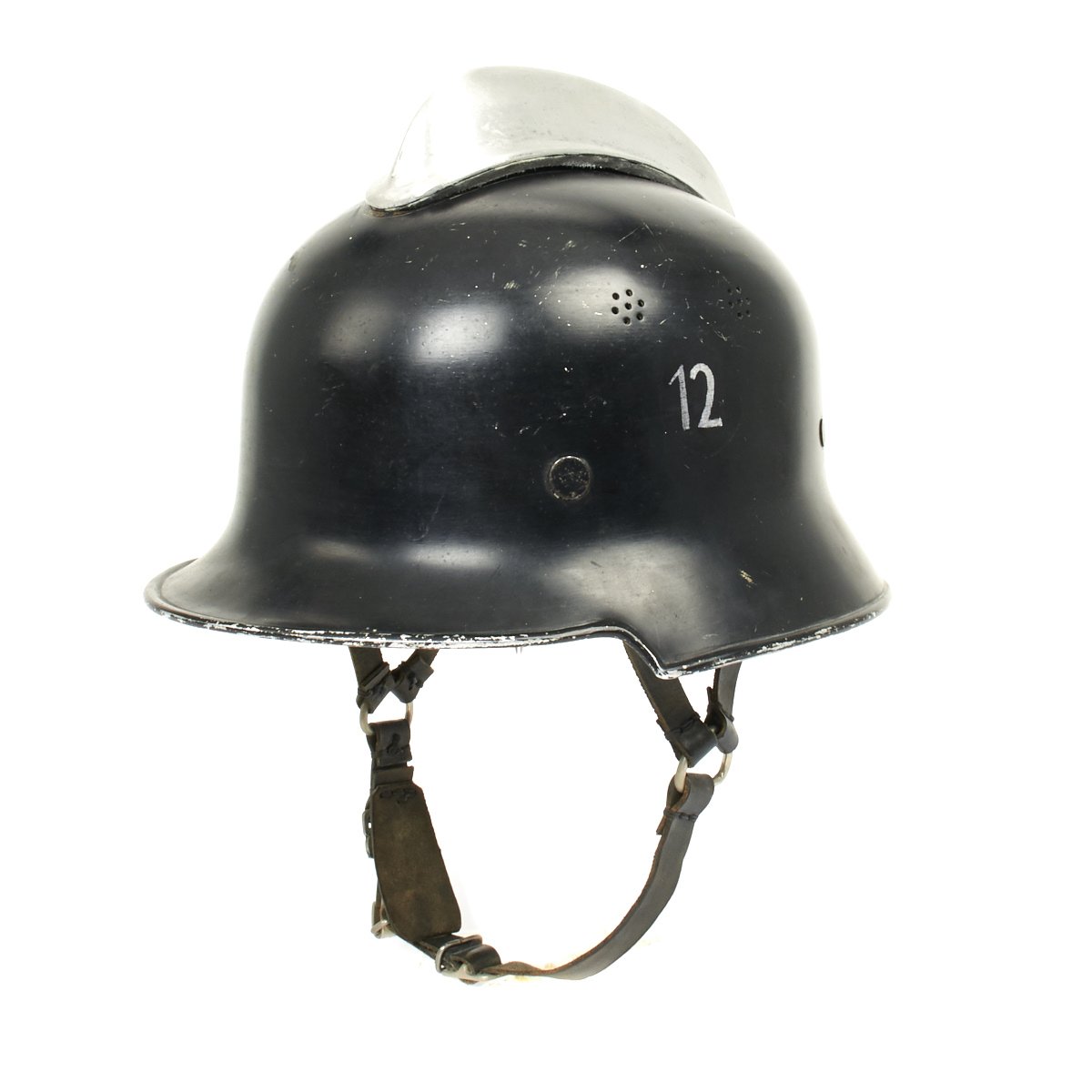 Original Item: Only One Available. This is a very nice example of the early “square dip” M1934 helmet with aluminum comb, made by BXF. It is complete except for the left decal, which has been removed and a number 12 scratched into the paint. The chinstrap is complete, with the original clasp. Overall condition of the shell is near excellent while the leather liner is in very good condition. A very nice example of a difficult to find early variation of the German WW2 Feuerwehr Helmet.