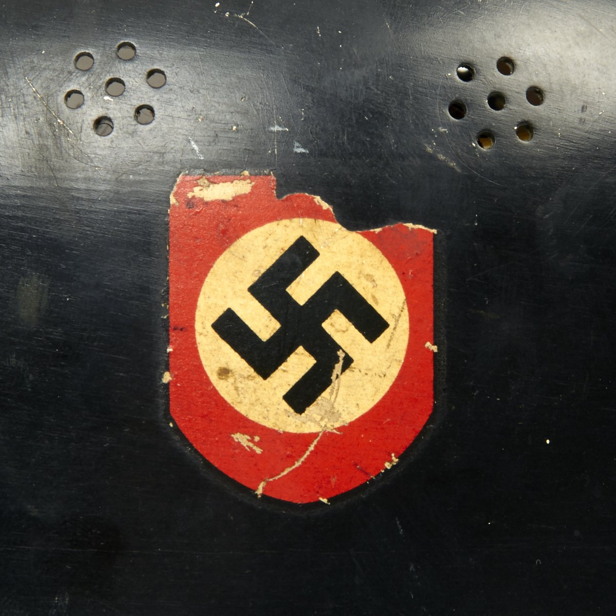 In 1934 the light-weight steel alloy prototype helmet was approved for general use by all fire-fighting units. This helmet is designated the “M1934” by modern collectors because of the year of its introduction. Several different versions of the M1934 helmet exist with many variations resulting from subtle differences in the air vents or visors. The M1934 helmet was painted semi-gloss black inside and out with two insignia placed one on each side.
