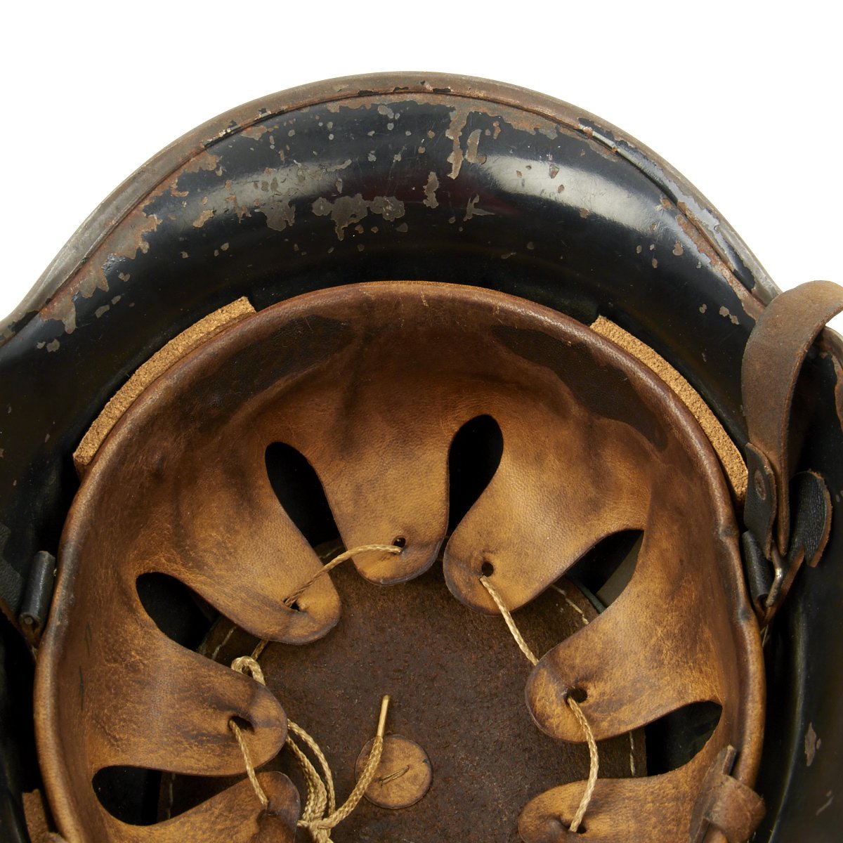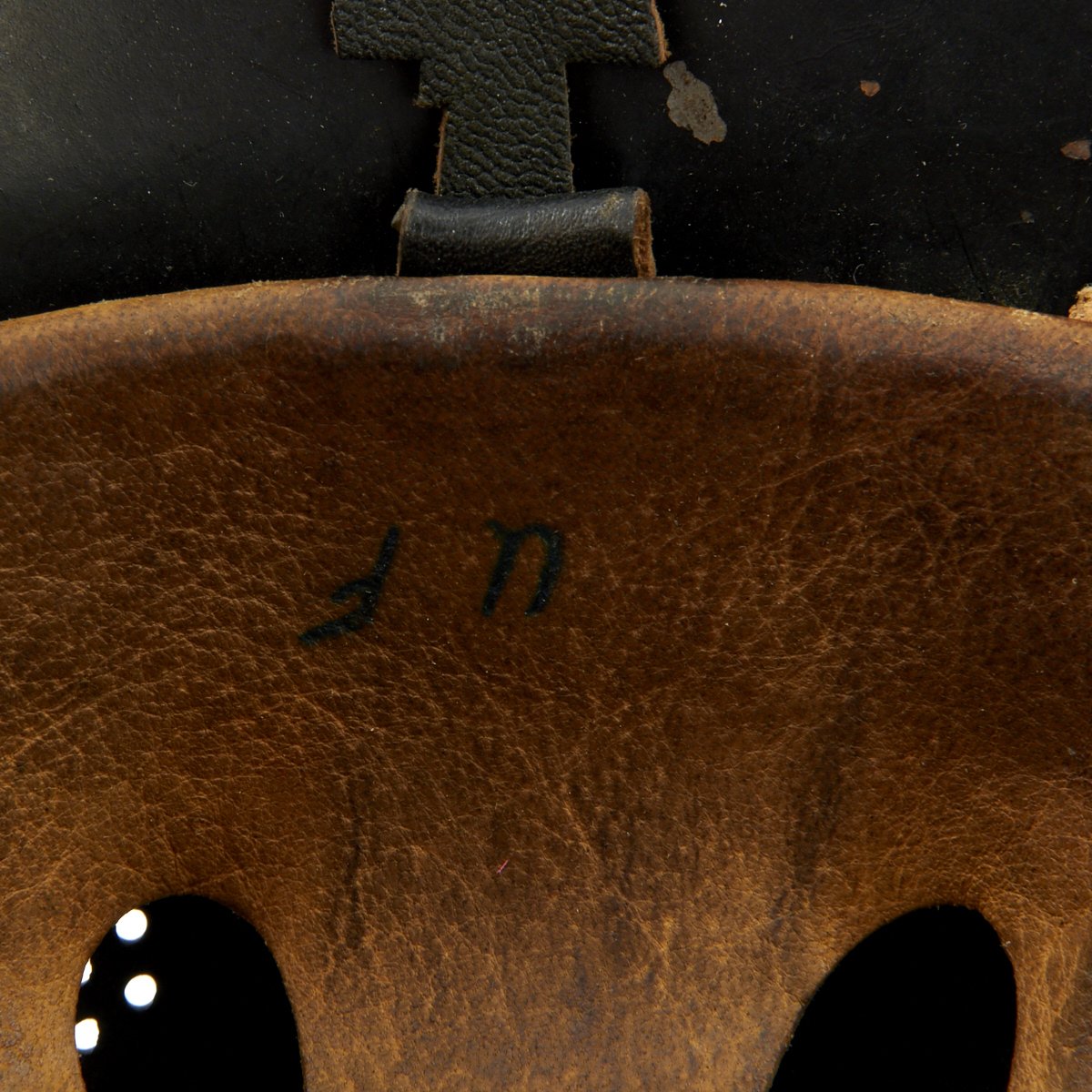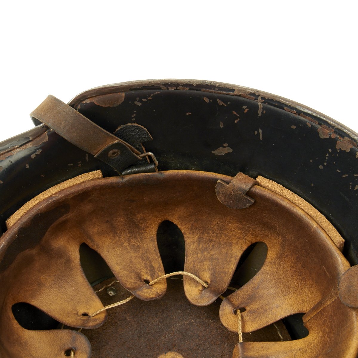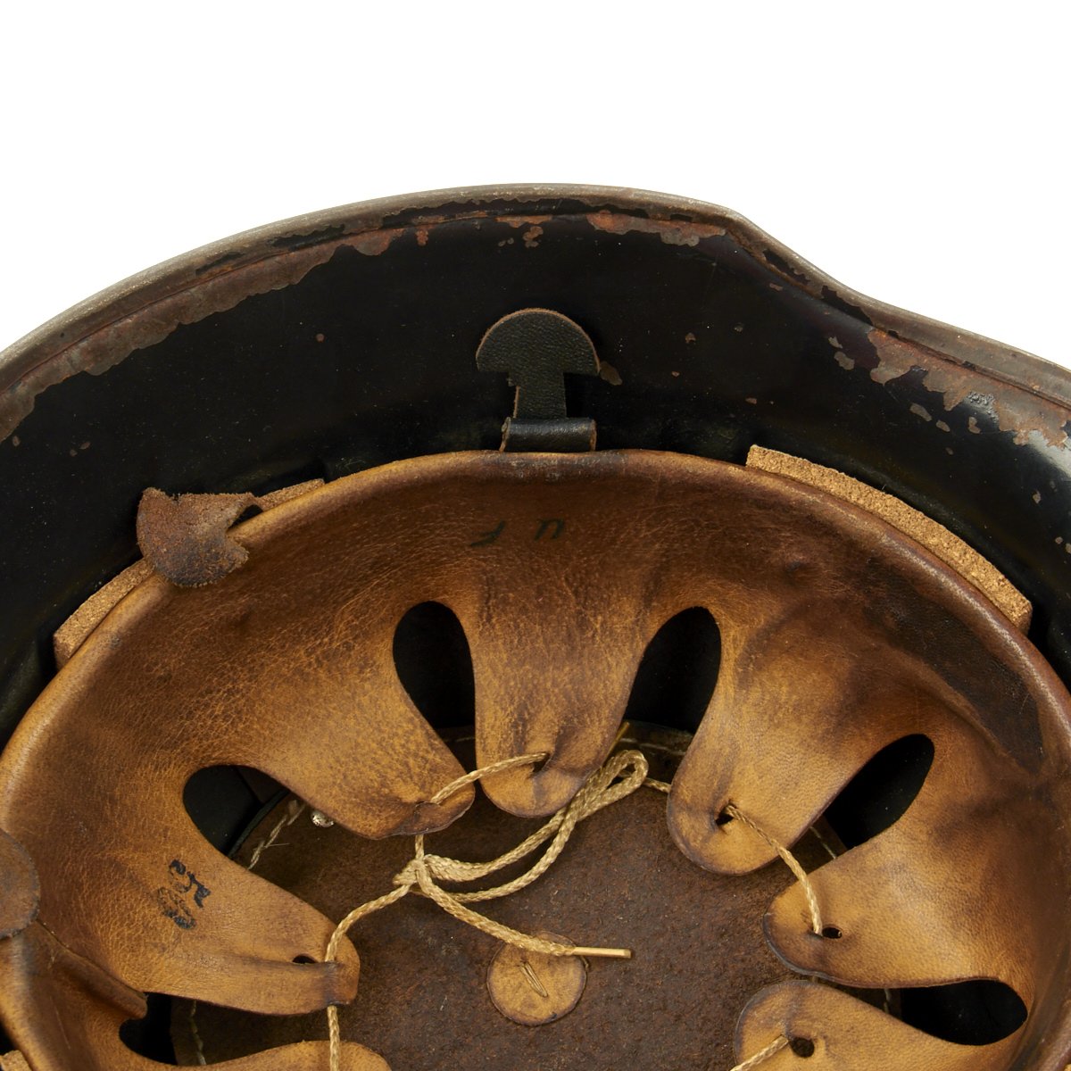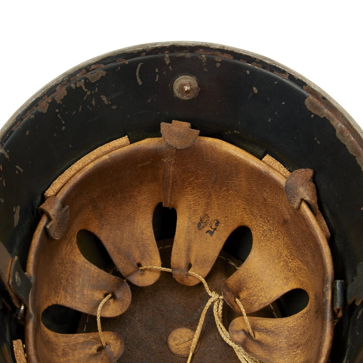 Original Item: Only One Available. This is a very nice example of the early “square dip” M1934 helmet with aluminum comb, which was still in service post war. It is mostly complete, though it does not have either decal, and it possibly was repainted post-war. Also, a section of the aluminum comb about 1 3/4 inches long is missing. The liner in this helmet is complete, with the top pad, and marked size 56. The chinstrap is complete, though it is missing the square bale that attaches to chinstrap to the liner on one side.